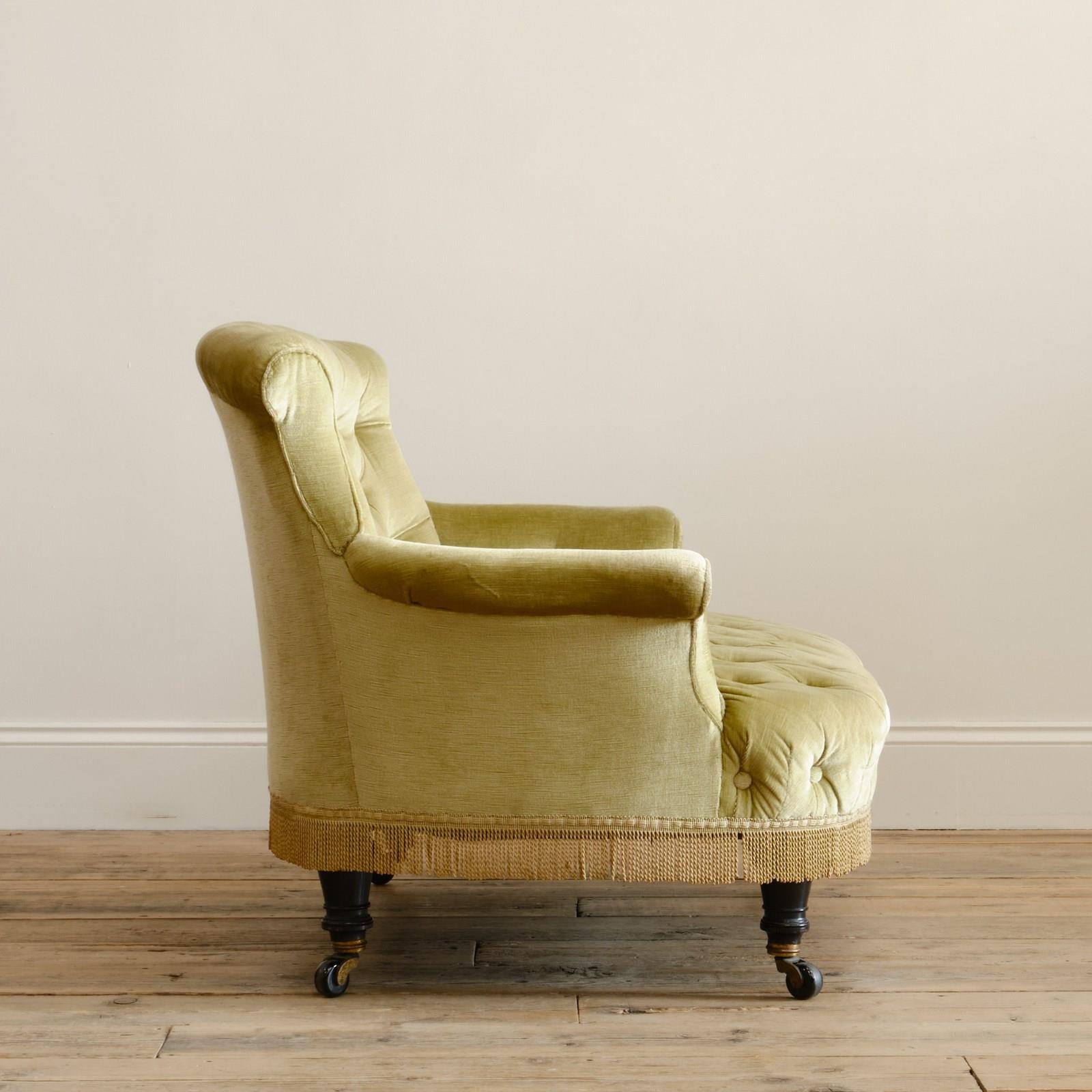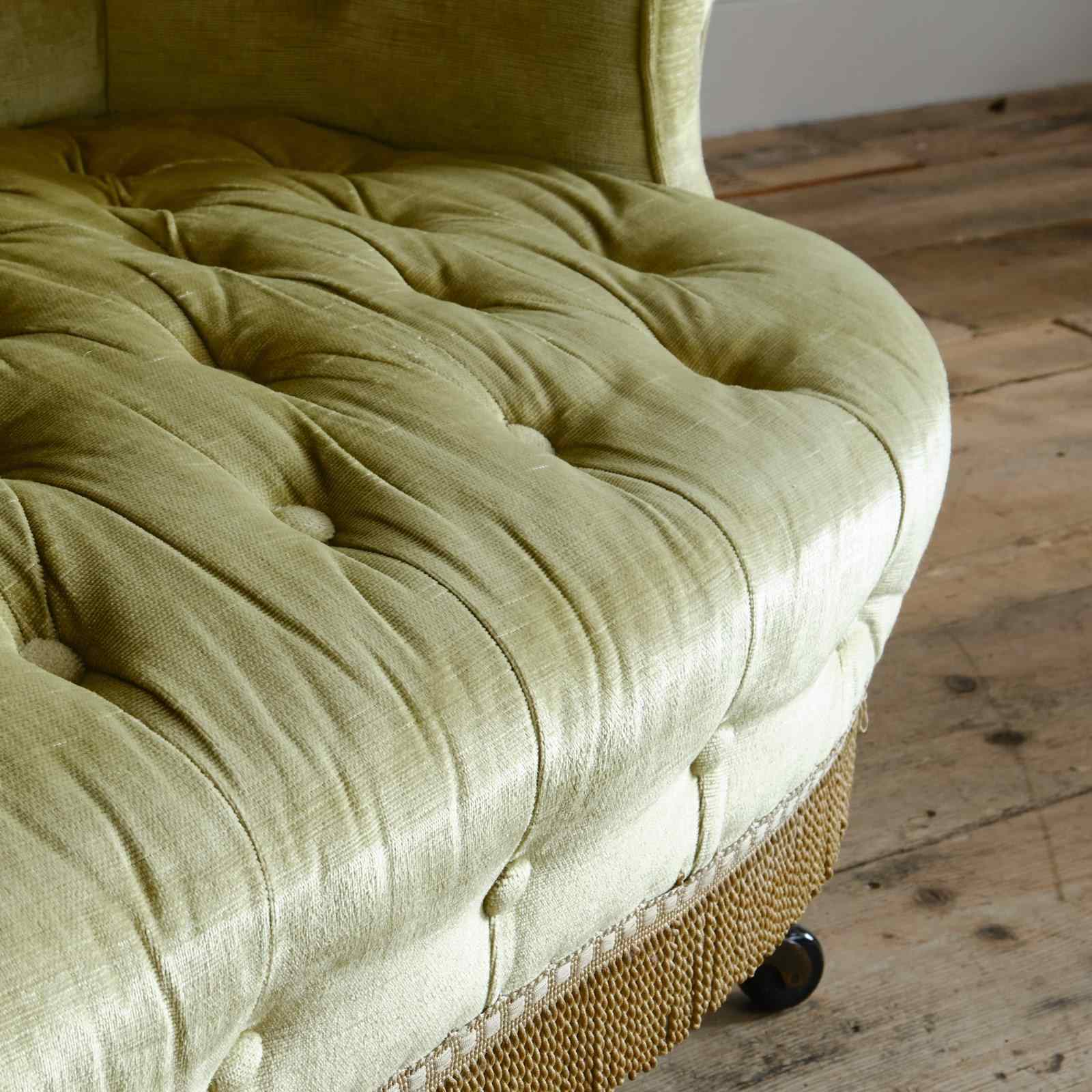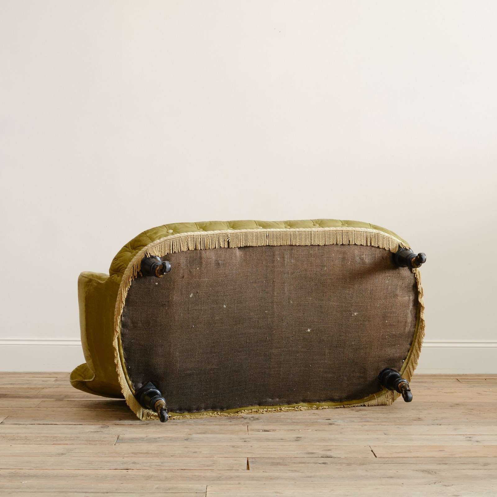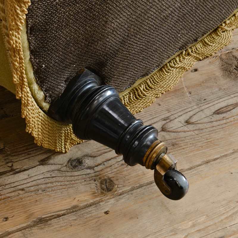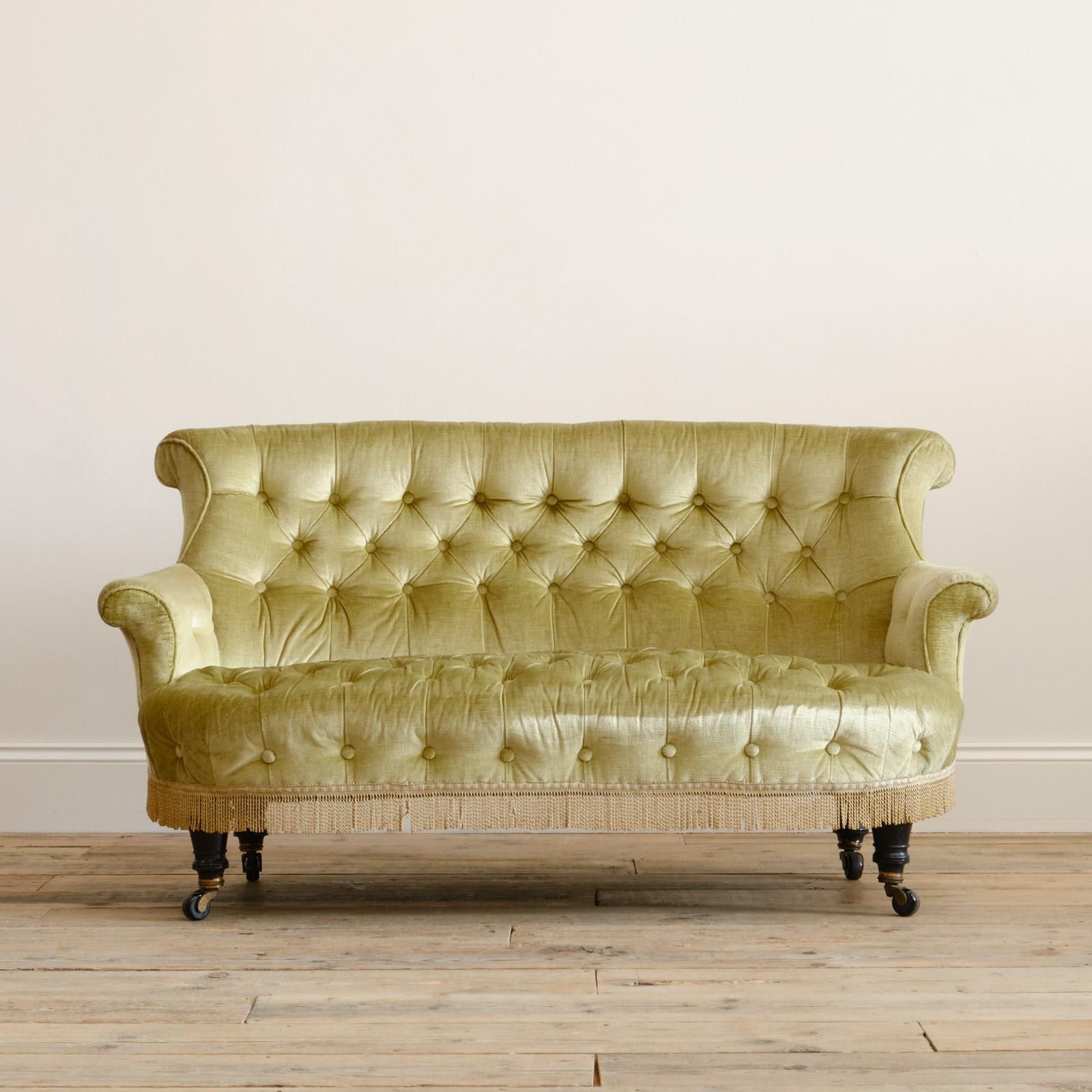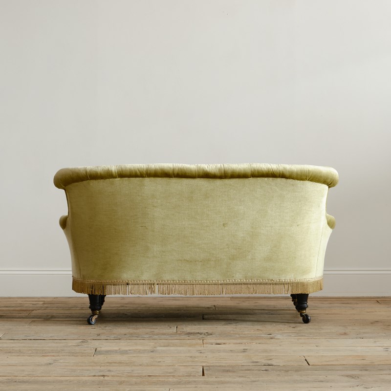 A good quality petite late 19th century country house 2 seater sofa. Raised on 4 turned ebonized legs with the original casters. The fully buttoned upholstery in good order and covered in sage green velvet with tussled trim.