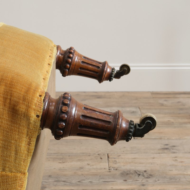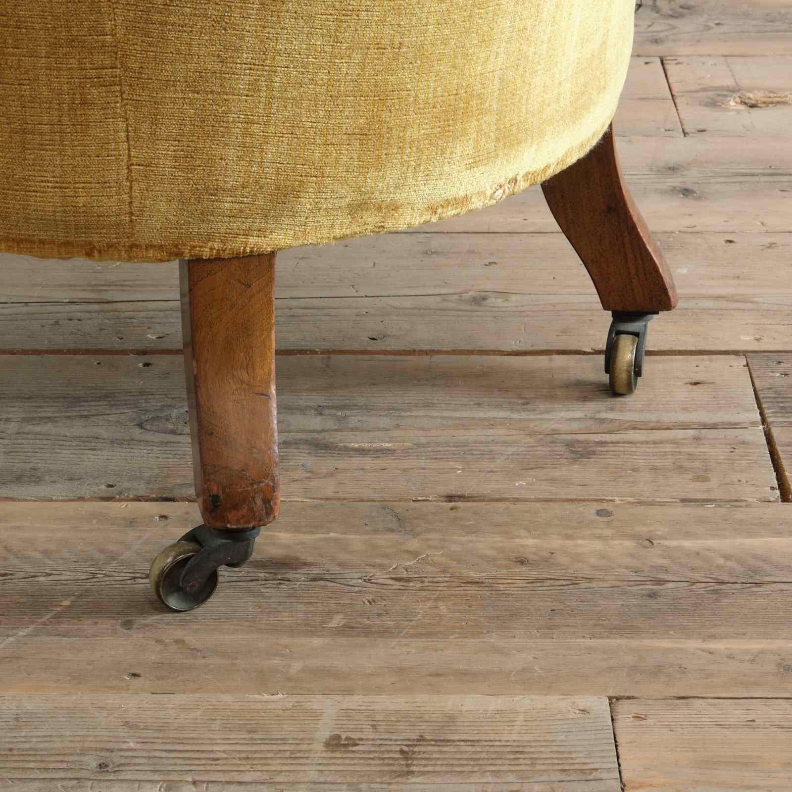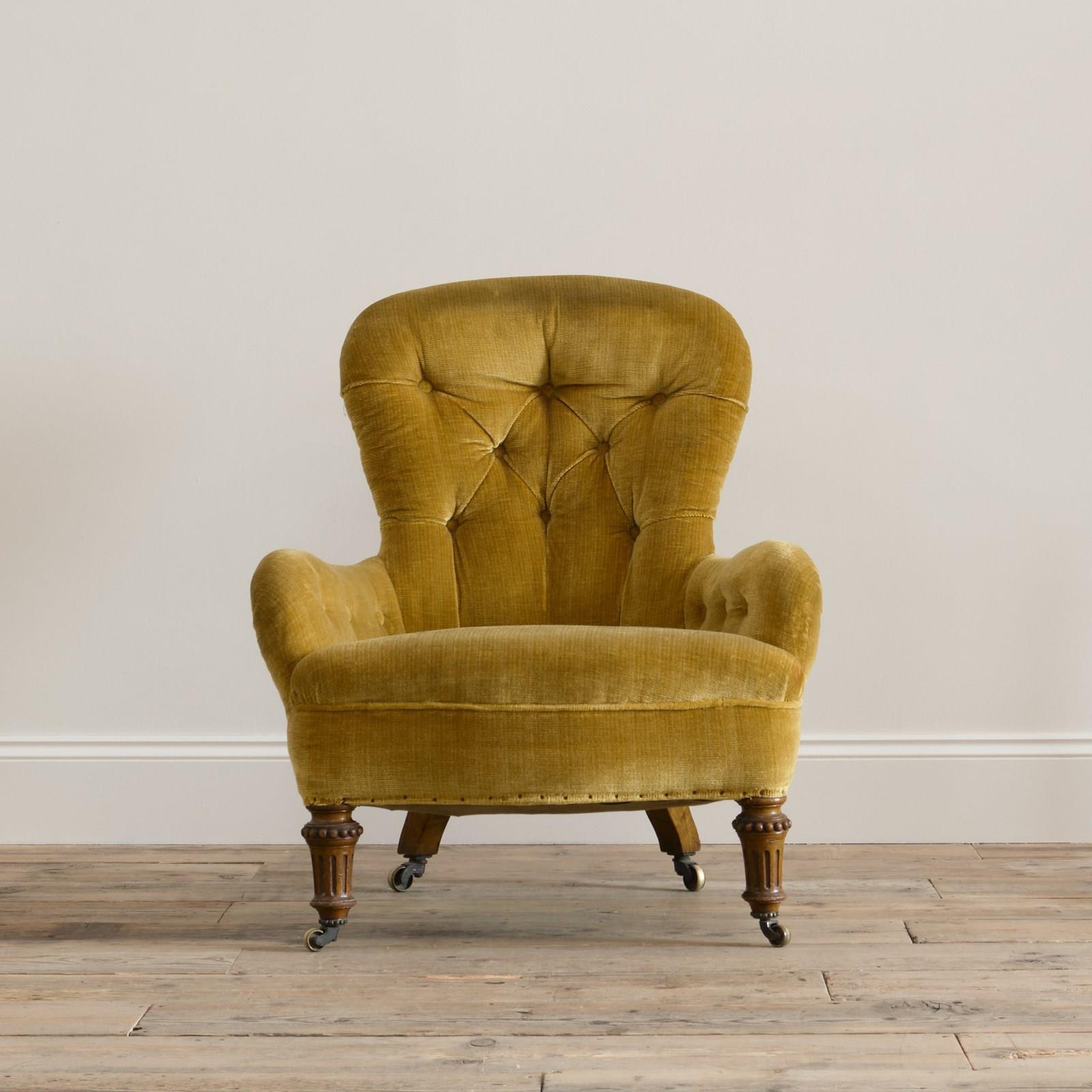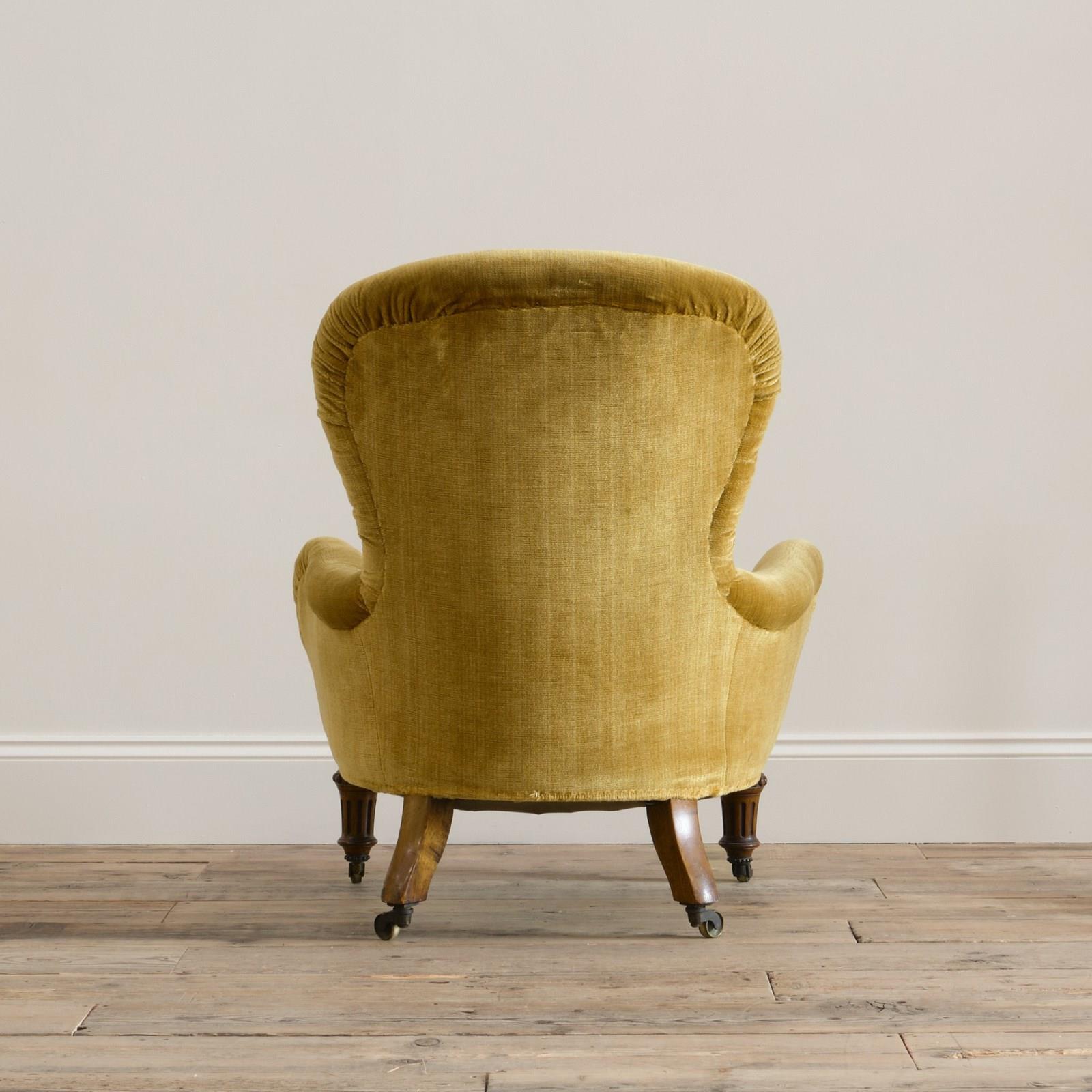A 19th century iron back armchair by Gillows of Lancaster. Raised on walnut legs and the original casters.