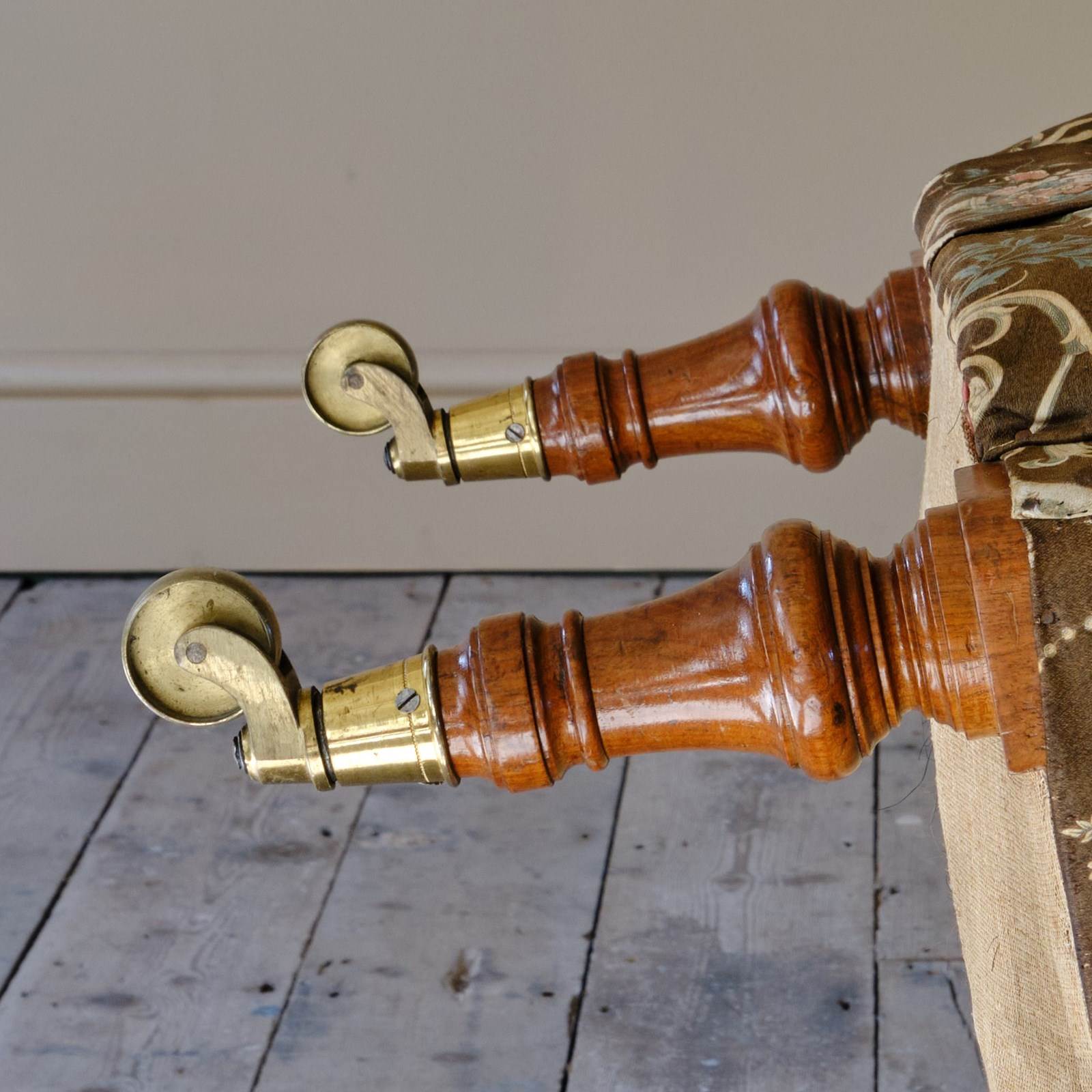 A wonderful mid 19th century slipper chair by Gillows of Lancaster. Raised on walnut legs with the original Cope & Collinson gilt brass casters and retaining its original buttoned upholstery and fabric.