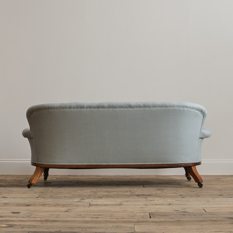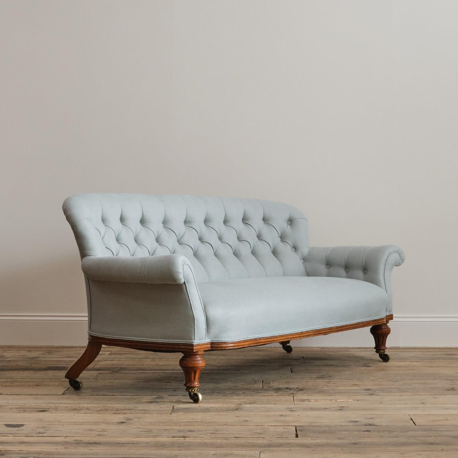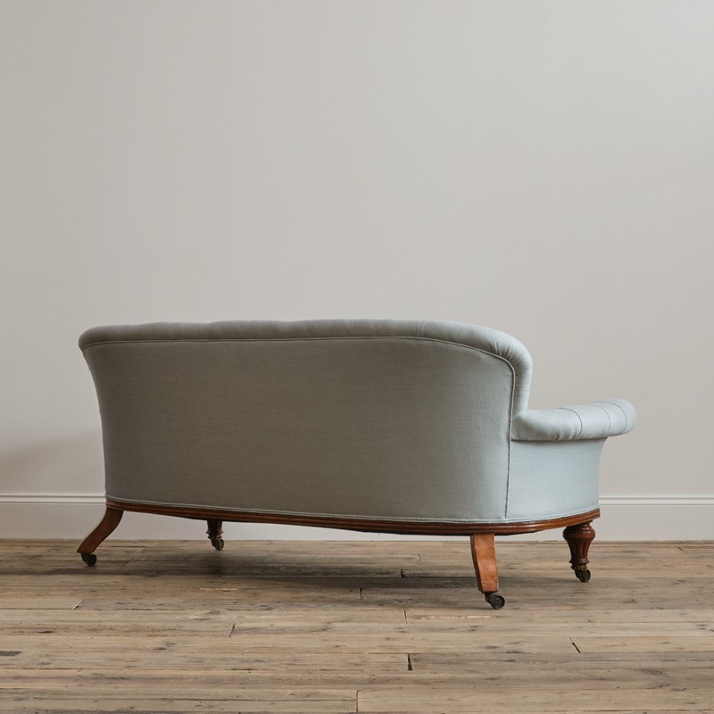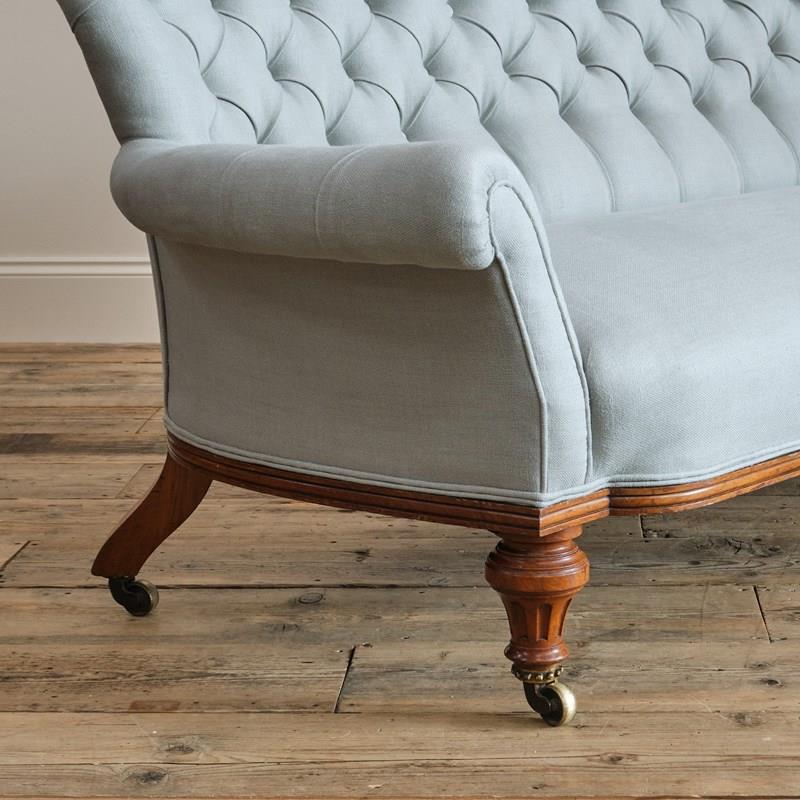 Newly upholstered by us in Warwick Slubby Linen in Aqua