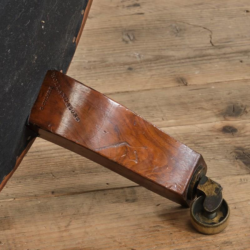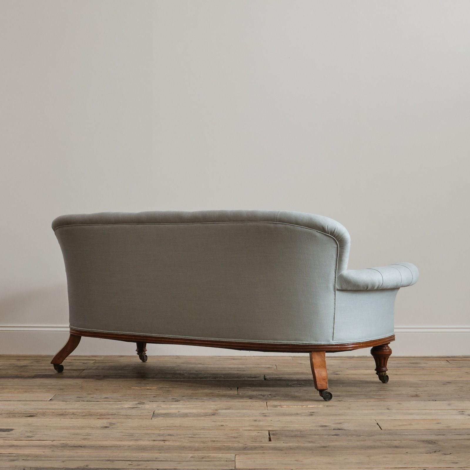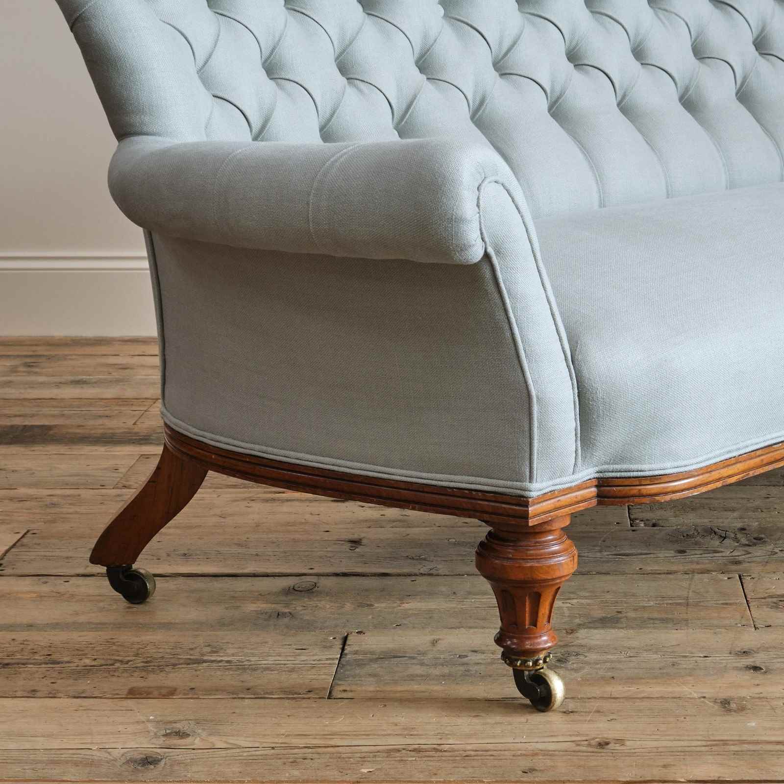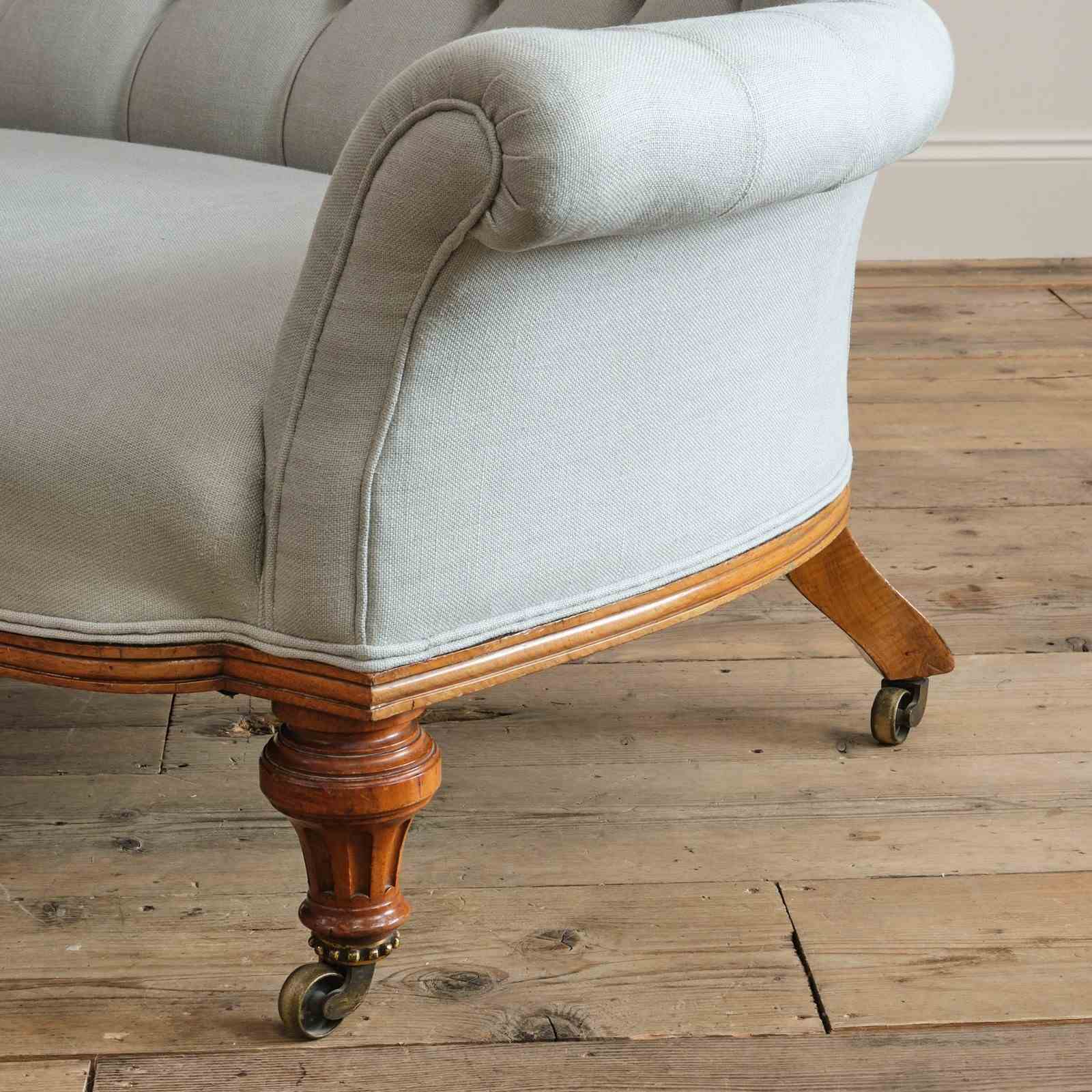 A superb mid 19th century sofa by Holland and Sons - London c1850. The Shapely walnut frame raised on thick and turned reeded walnut front with outward splayed rear legs. Both back legs stamped with the makers mark and one leg with the journeyman's name 'C CULVER'. All legs retain the original brass casters.