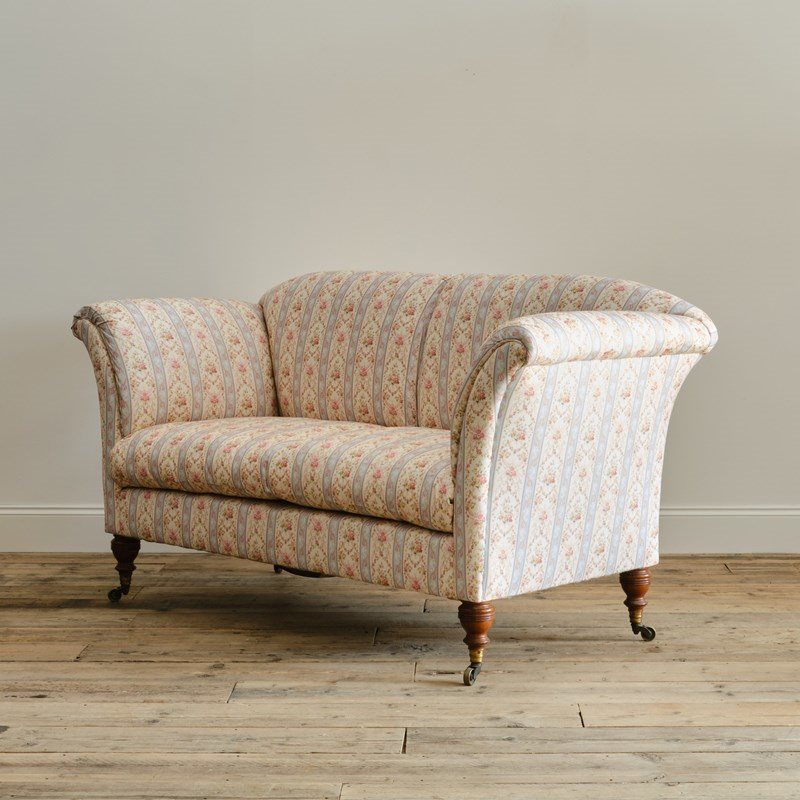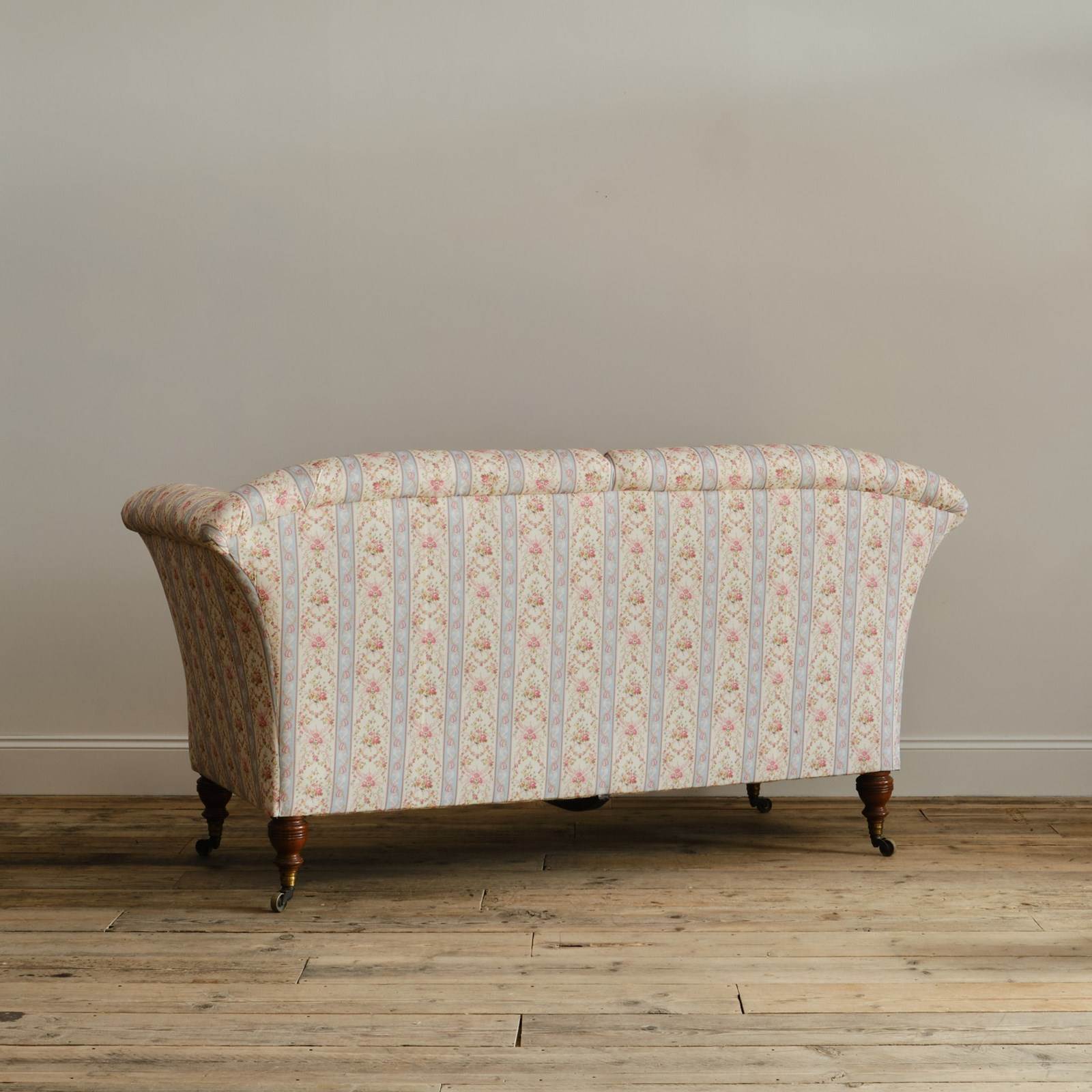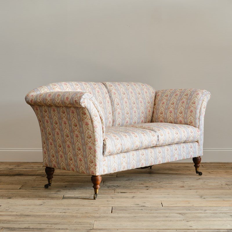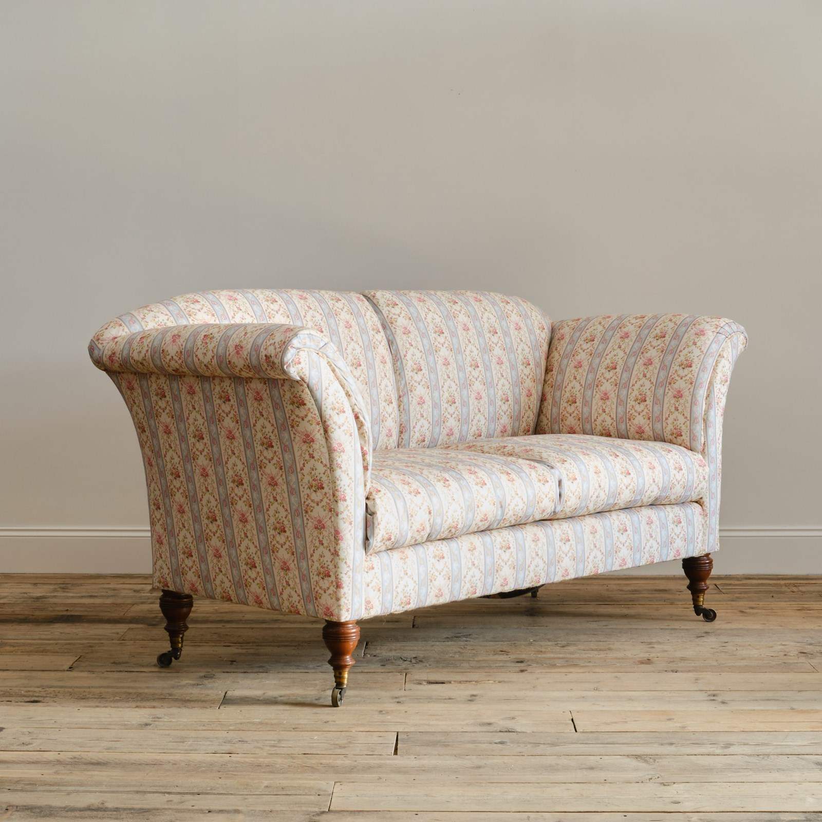 A Howard & Sons Grantley sofa. Raised on Howards uniquely hand turned walnut legs all capped with stamped H&S gilt brass cup casters. It's stretcher rail having the original paper label to the underside of the frame and the back leg number stamped 14598-3173. Two thick comfortable seat cushions and 'Siege De Duvet' back and arms, all filled with feather and down. C1900