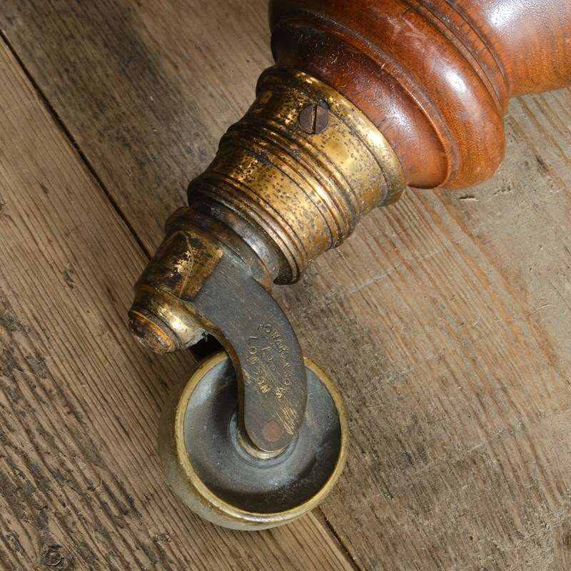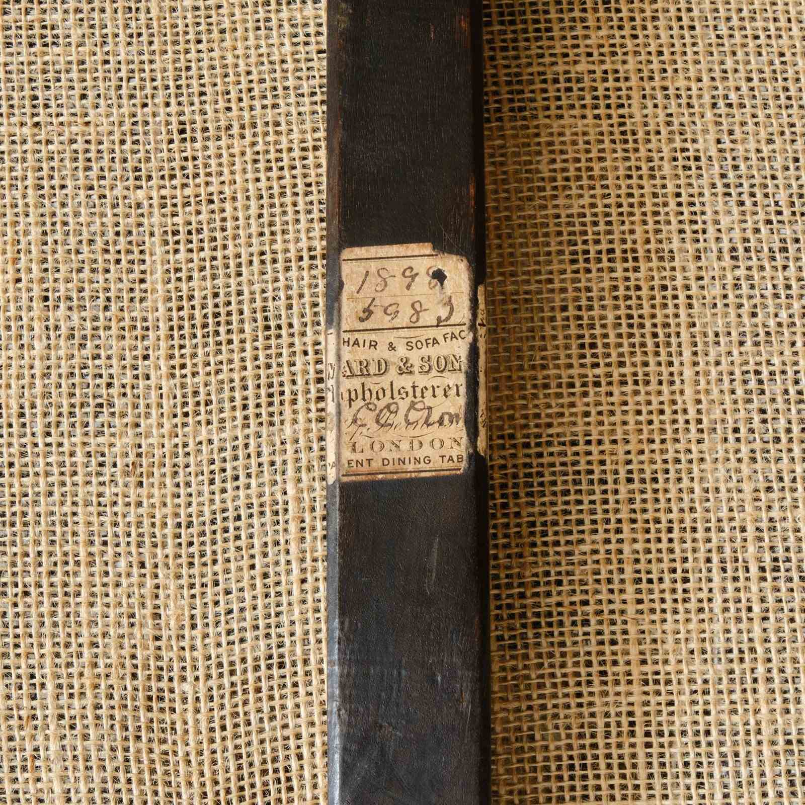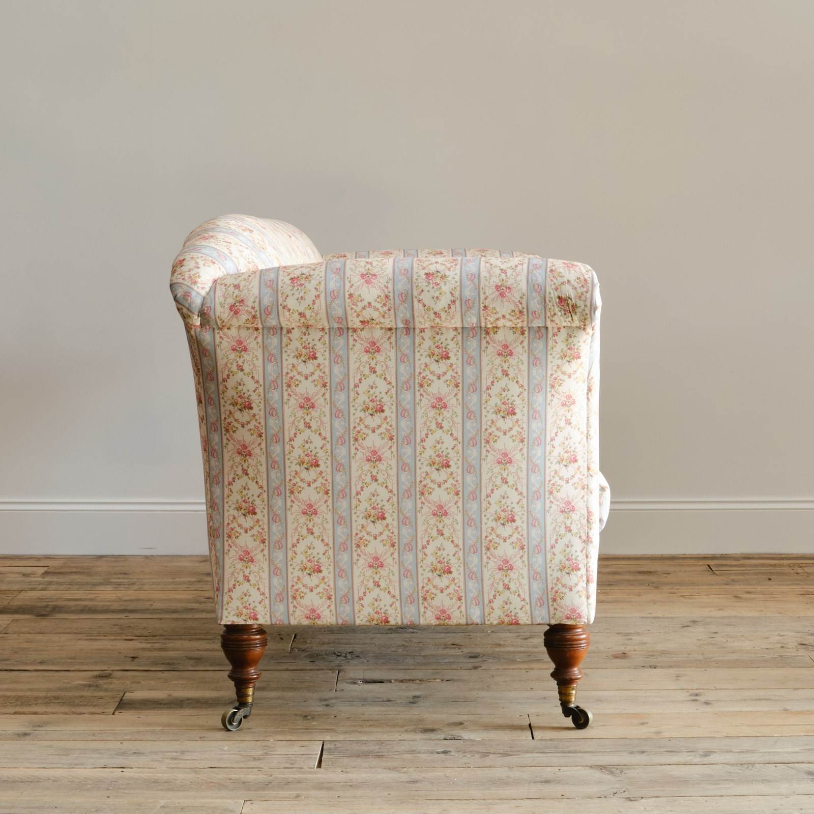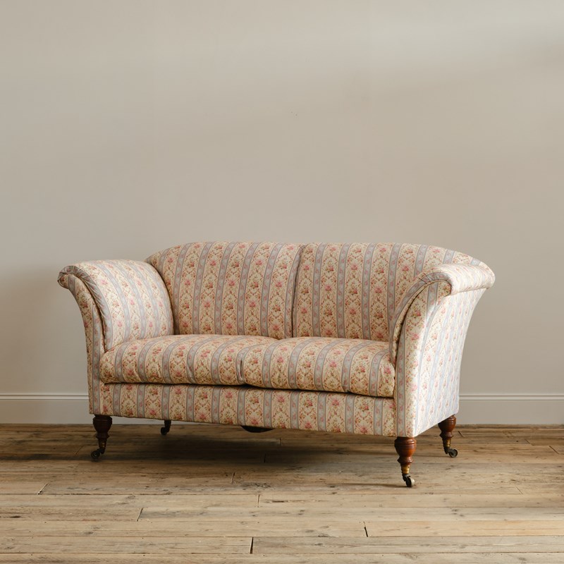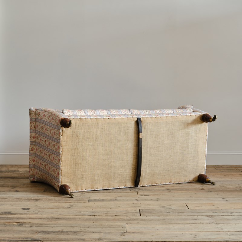 A Howard & Sons Grantley sofa. Raised on Howards uniquely hand turned walnut legs all capped with stamped H&S gilt brass cup casters. It's stretcher rail having the original paper label to the underside of the frame and the back leg number stamped 14598-3173. Two thick comfortable seat cushions and 'Siege De Duvet' back and arms, all filled with feather and down. C1900