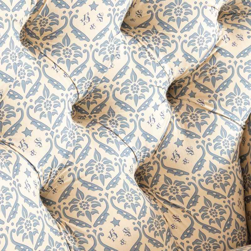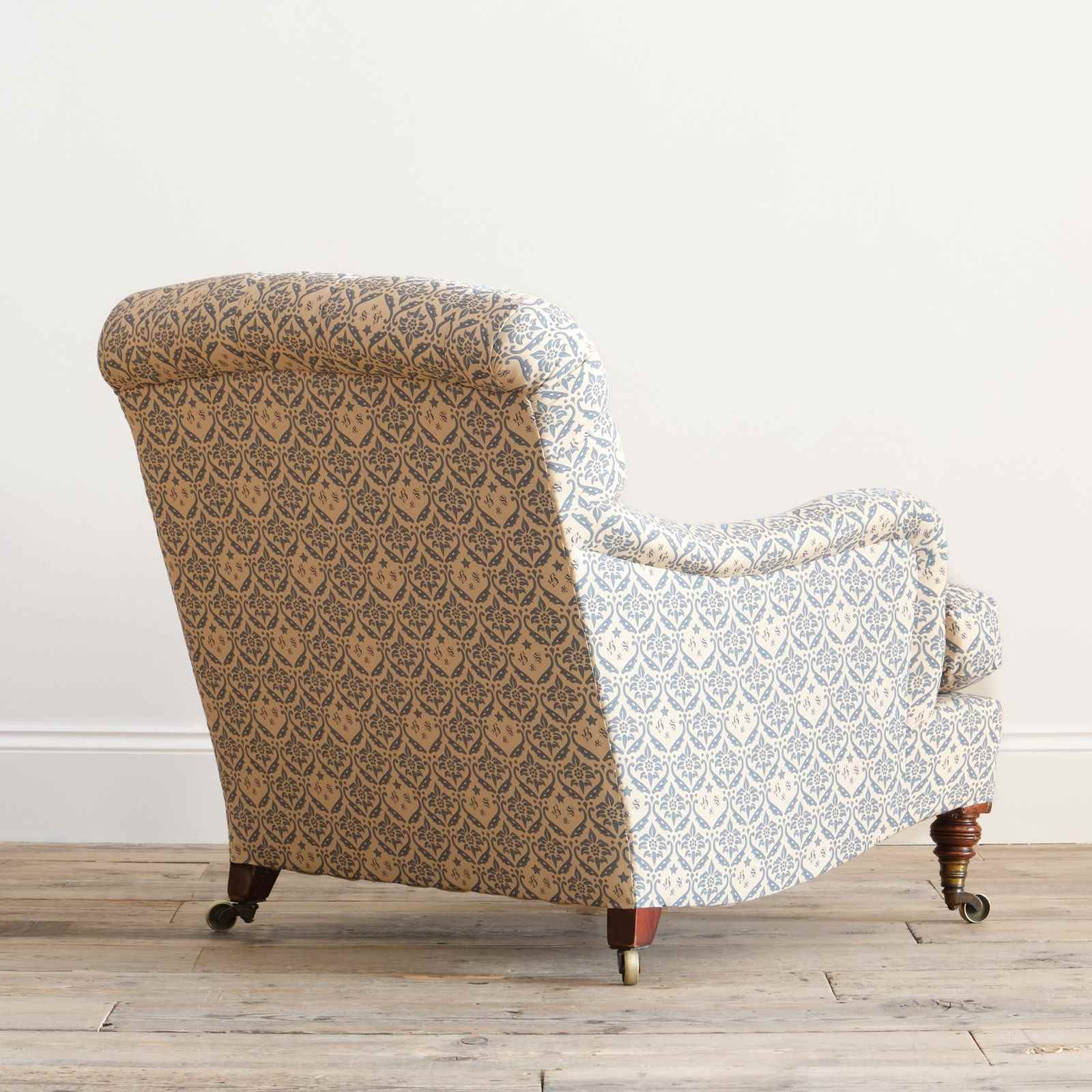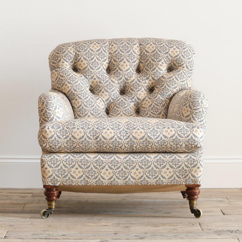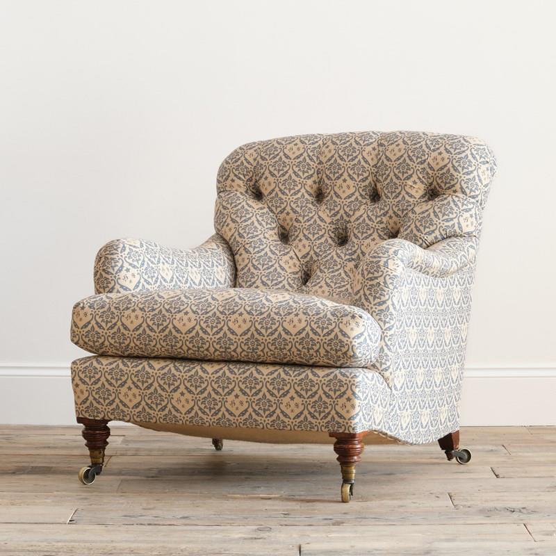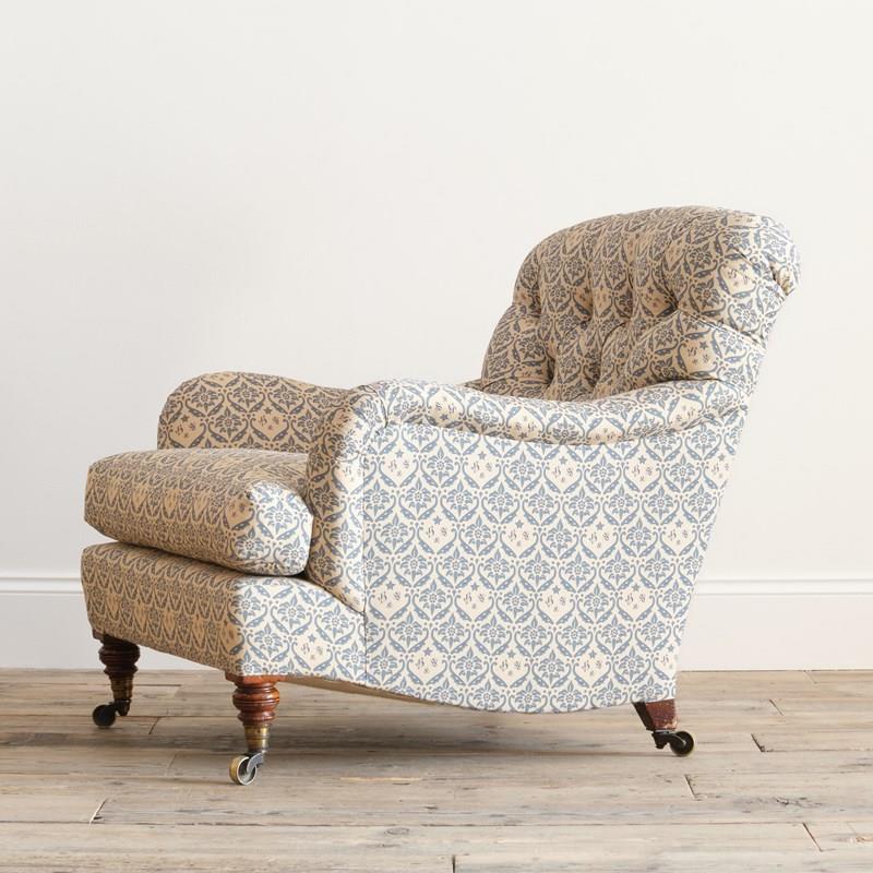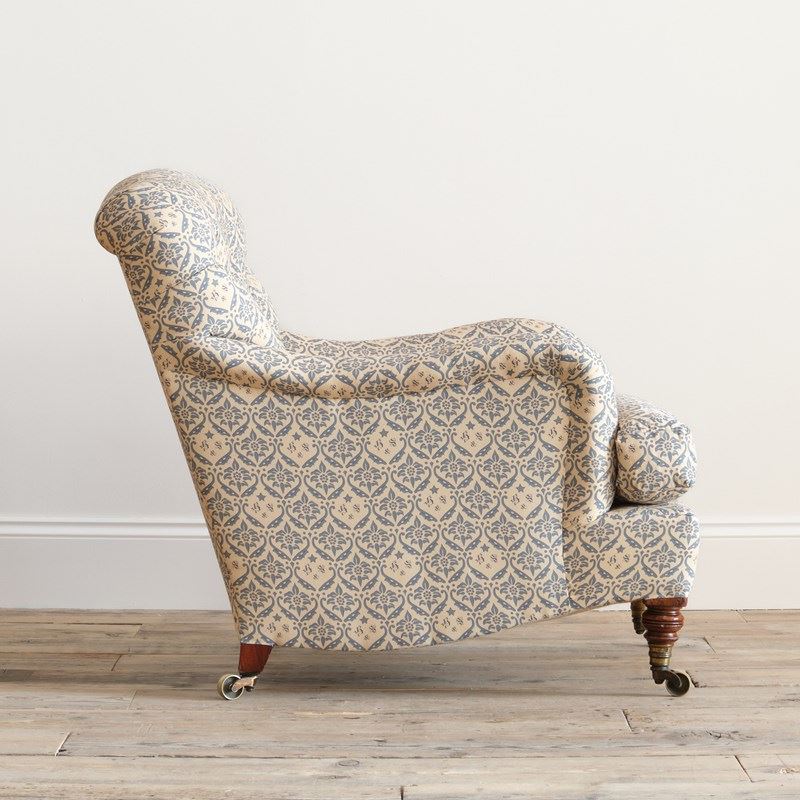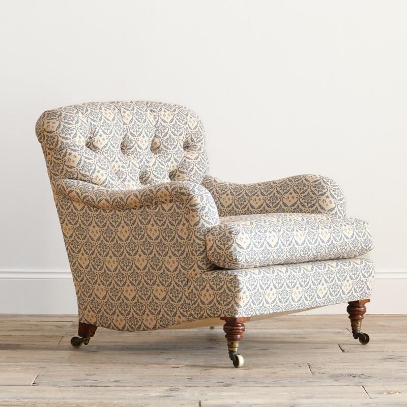 We have restored this chair from the frame up with a new sprung seat and feather, down seat cushion and retained the original fillings to the arms and buttoned back. All covered in a reproduction of the H&S cotton lining ready for use as is or for your choice of top covering.