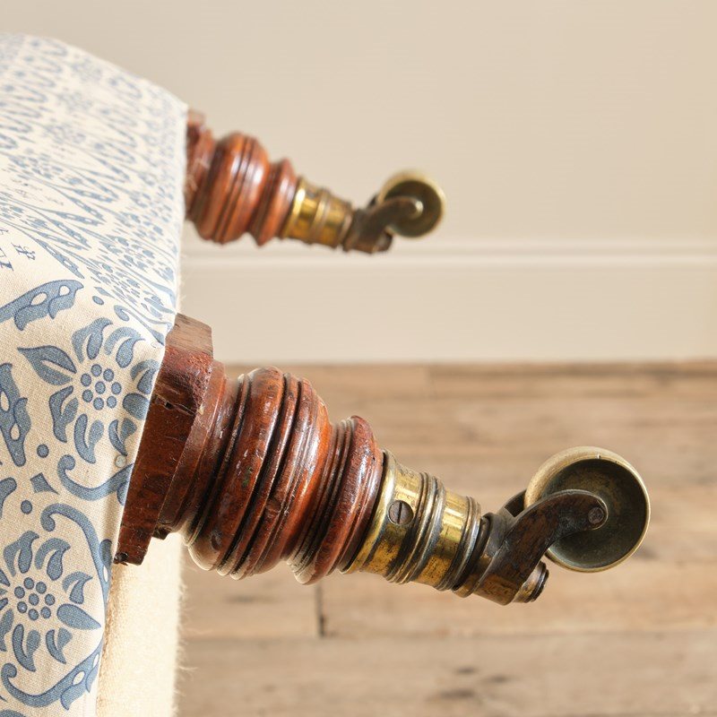 A 19th century country house armchair by Howard & Sons - London. This Bridgewater model is raised on turned walnut front legs and splayed rear legs all with the original H&S stamped casters. c1880