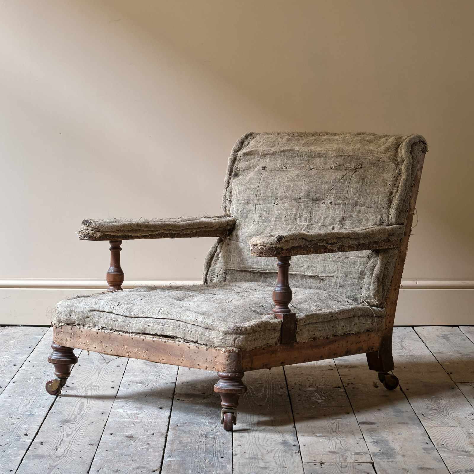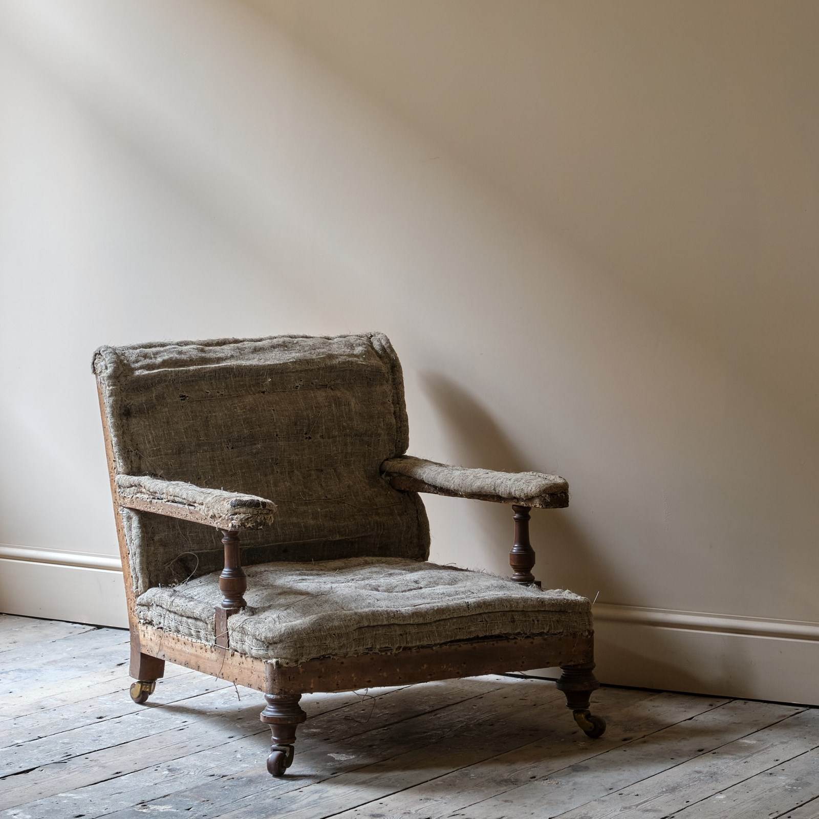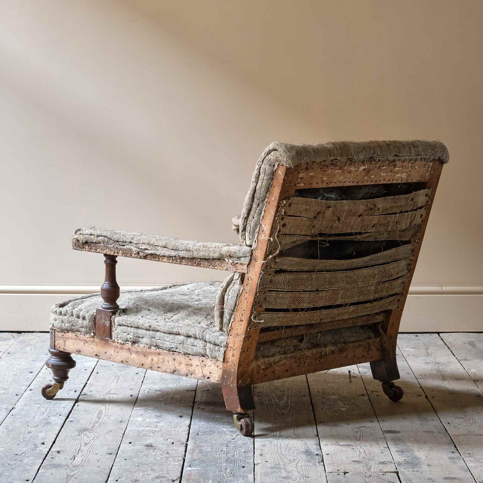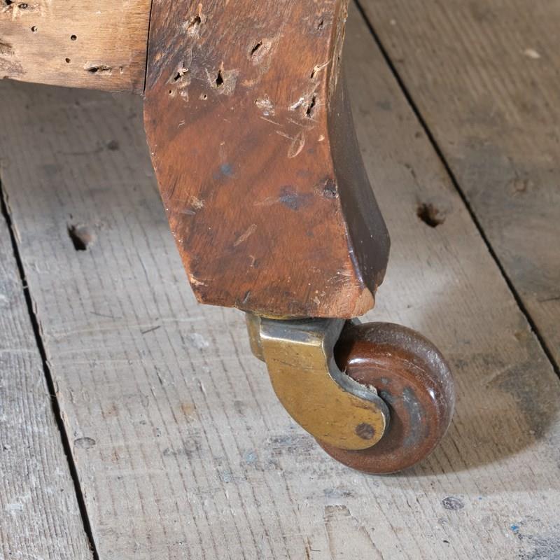 Solid frame sits on walnut legs and arm supports. Resting on brass castors and ceramic wheels.