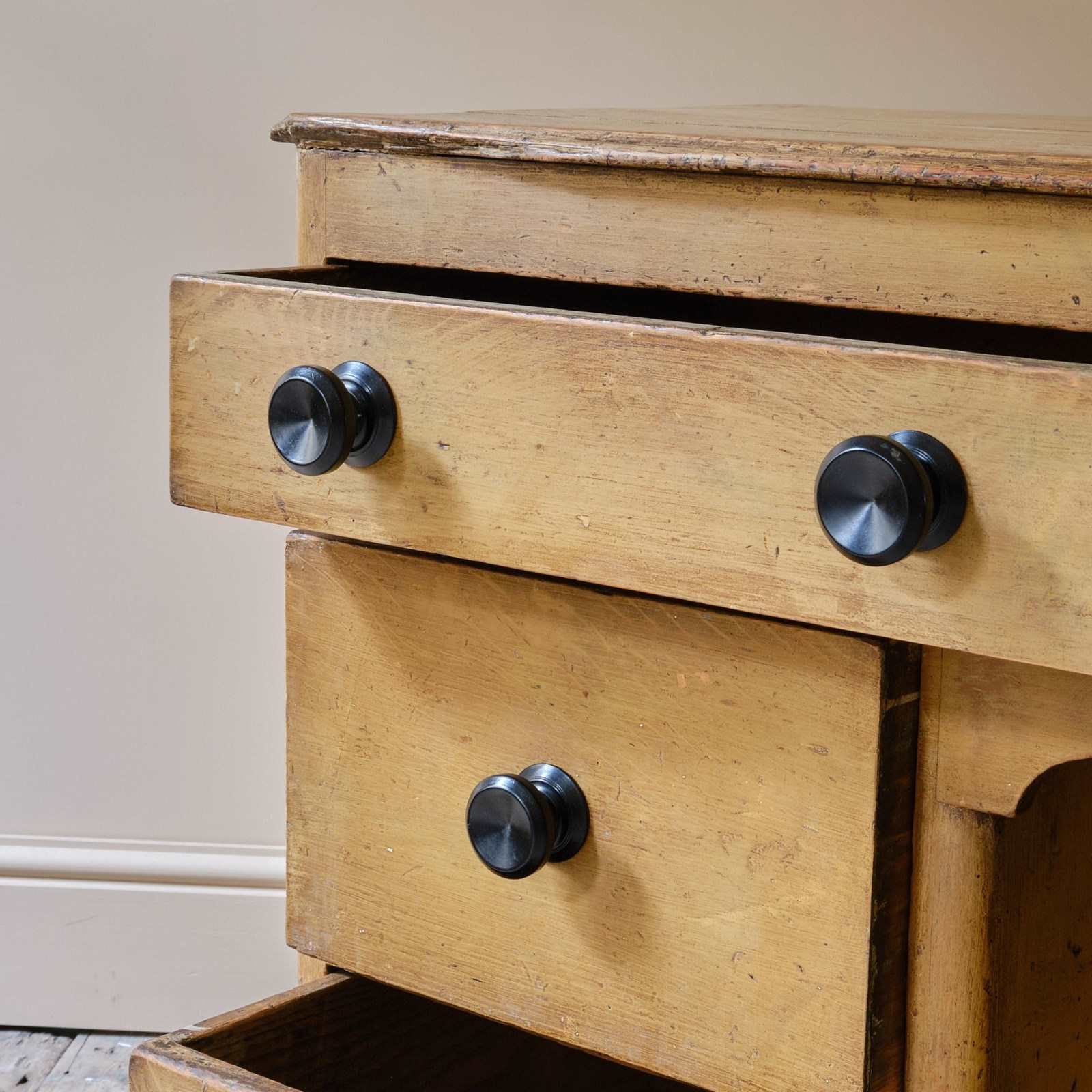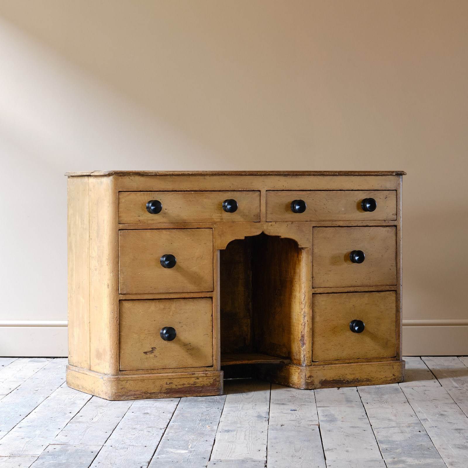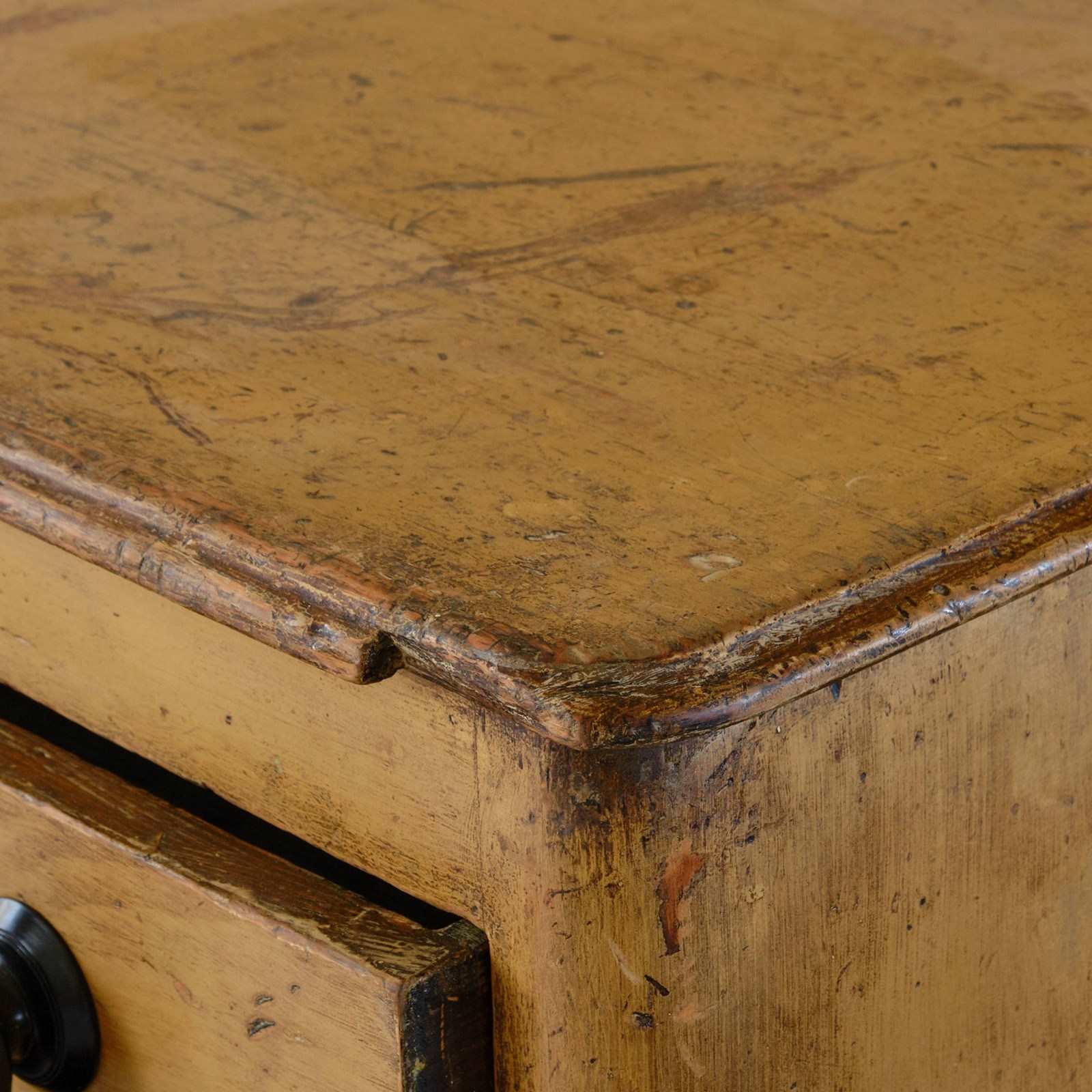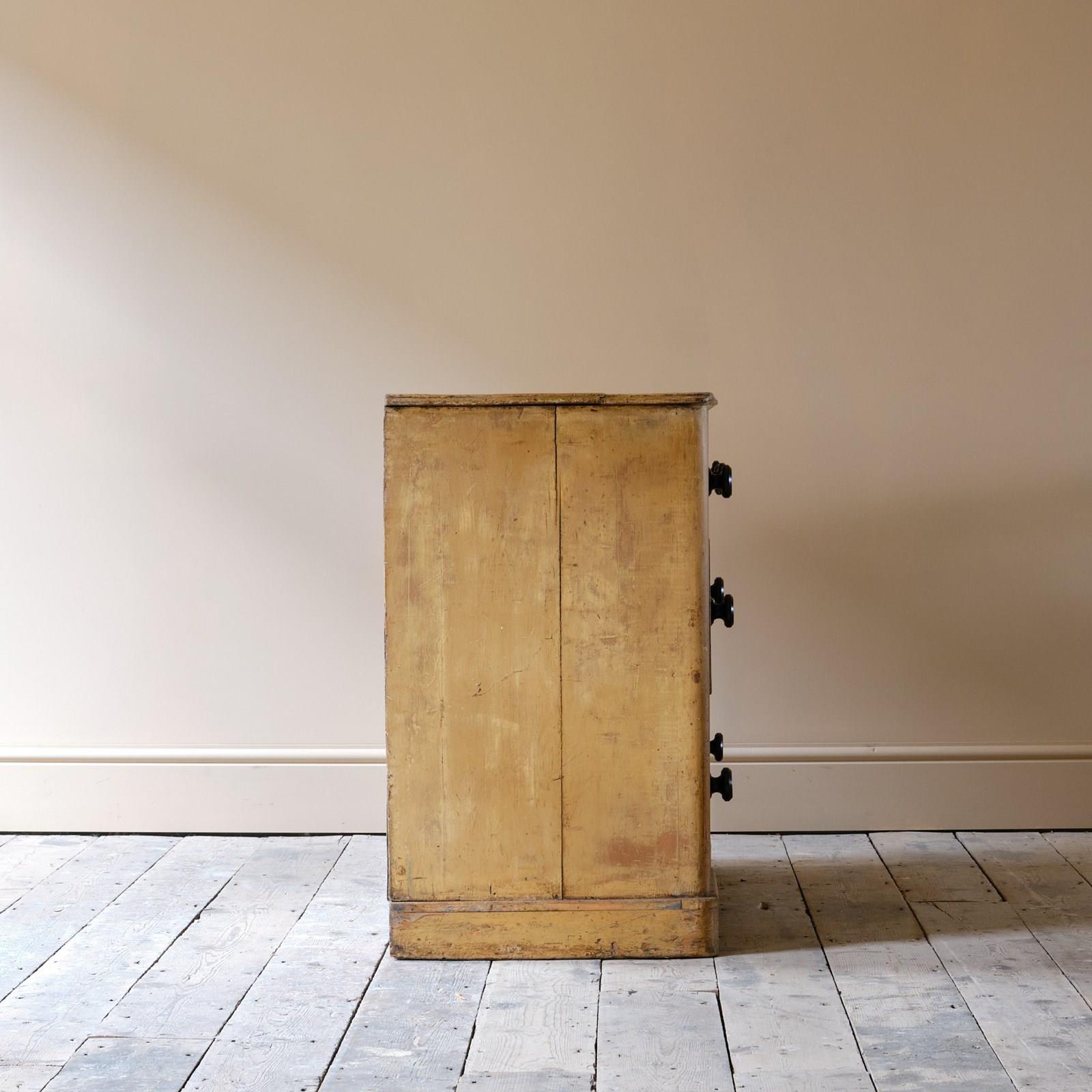 A mid 19th century dog kennel dresser base in its original cream paint with faded simulated oak graining. The 6 drawers with ebonized pulls all run well with one bottom drawer having historic repair as seen in the images.