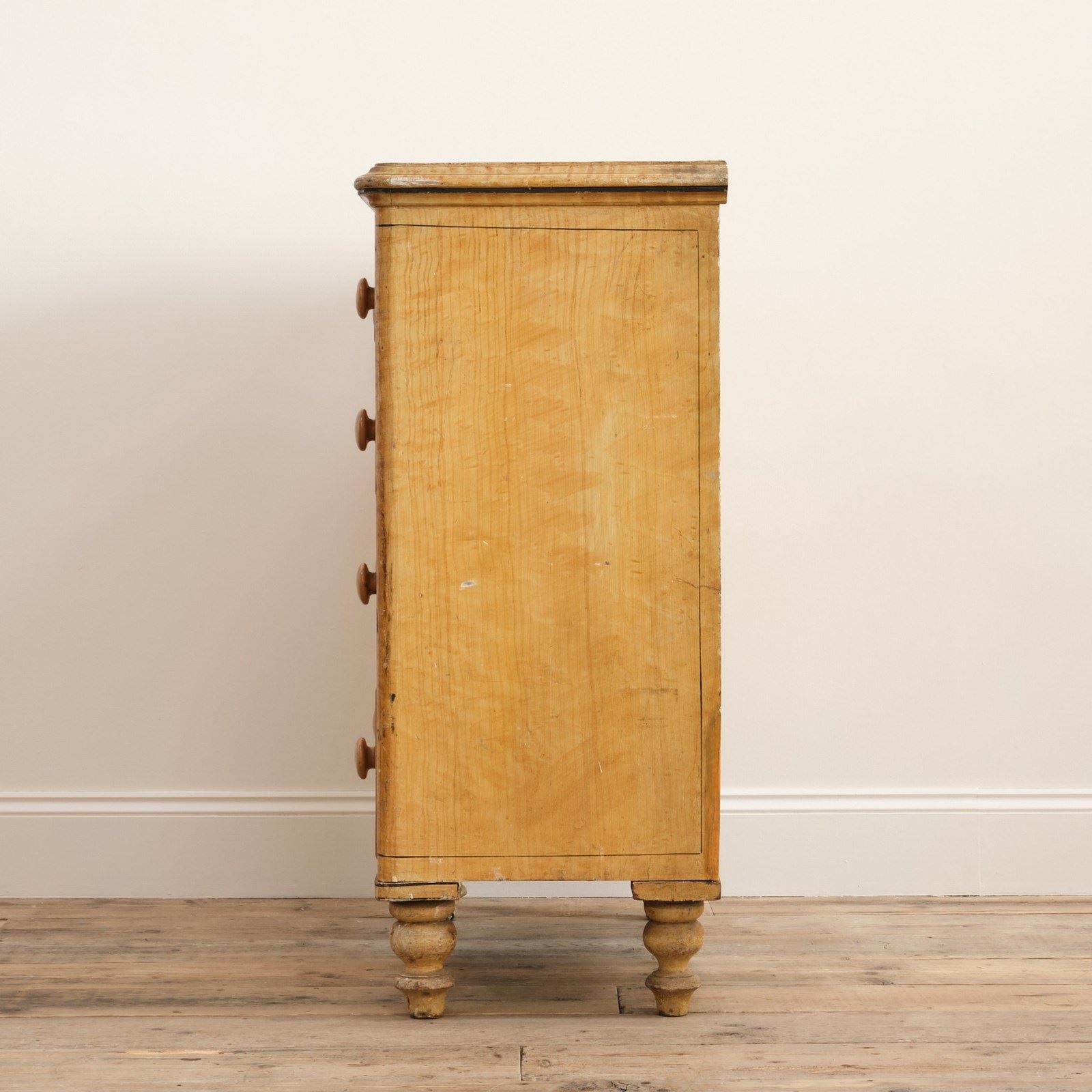 A 19th century pine chest of drawers in the original simulated Birdseye maple painted finish and pin striped details. The drawers retain the original turned knobs and locks. Raised on turned 4 turned feet and with a nice front apron.