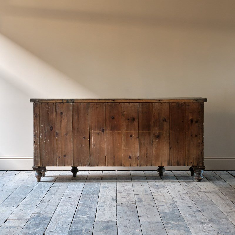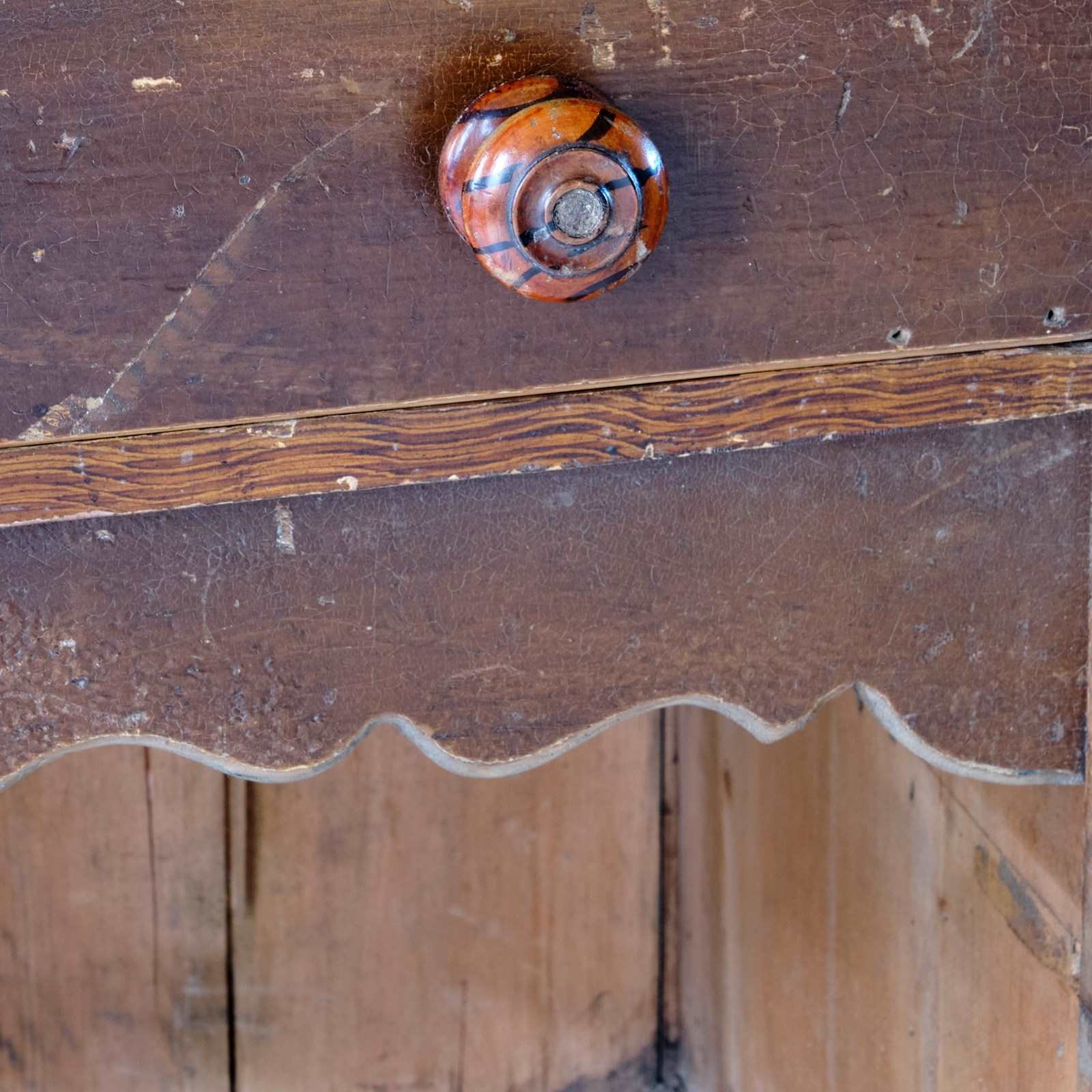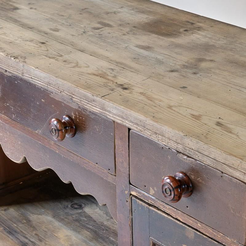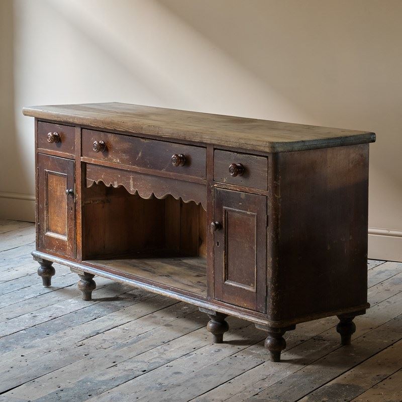 A decorative scalloped apron in the centre is flanked by cupboard and topped with draws.