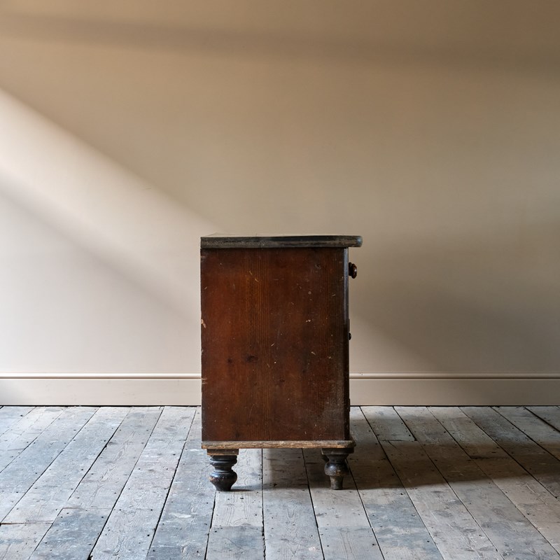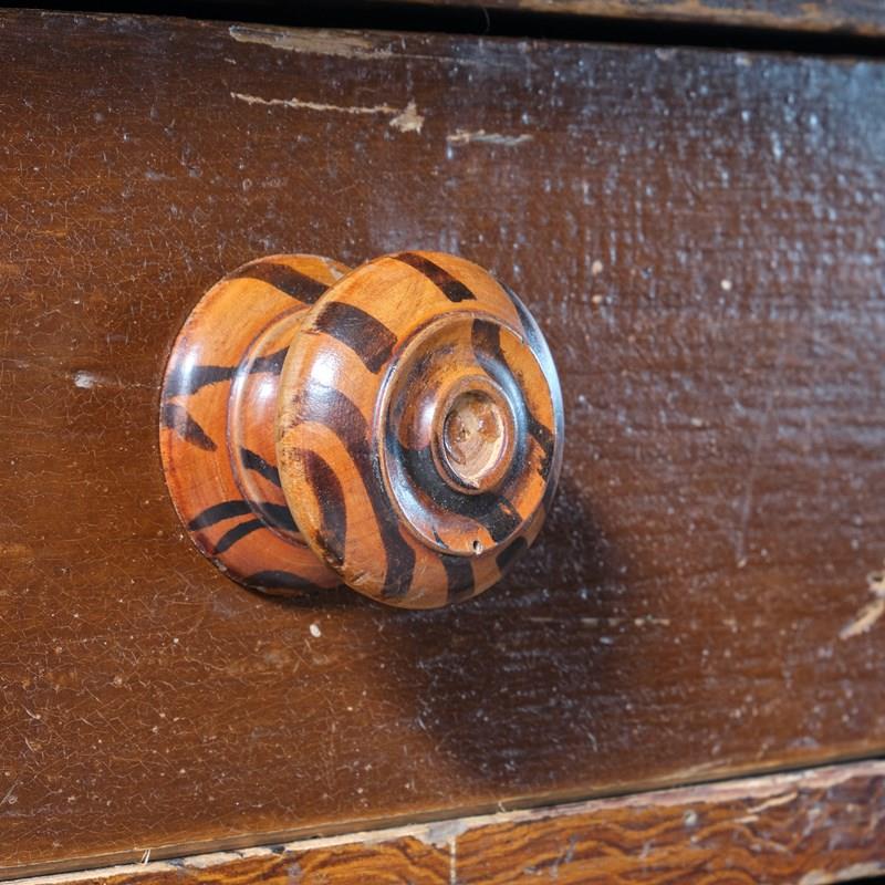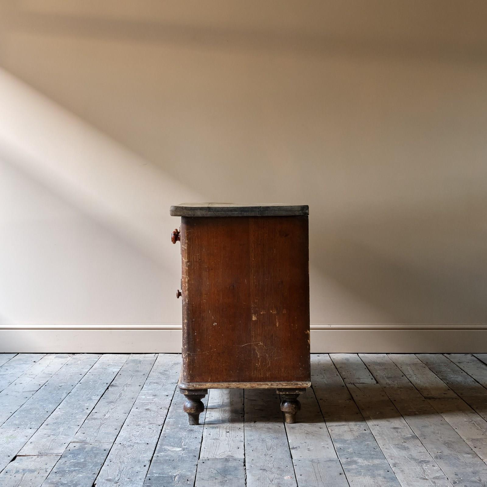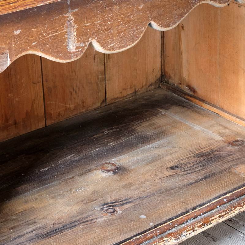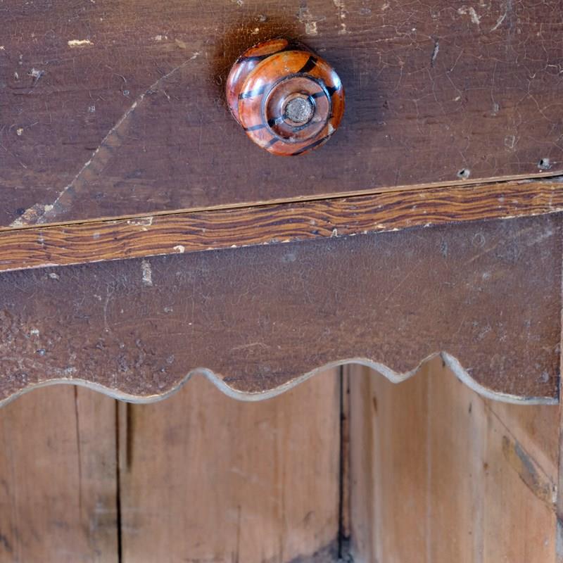 A decorative scalloped apron in the centre is flanked by cupboard and topped with draws.