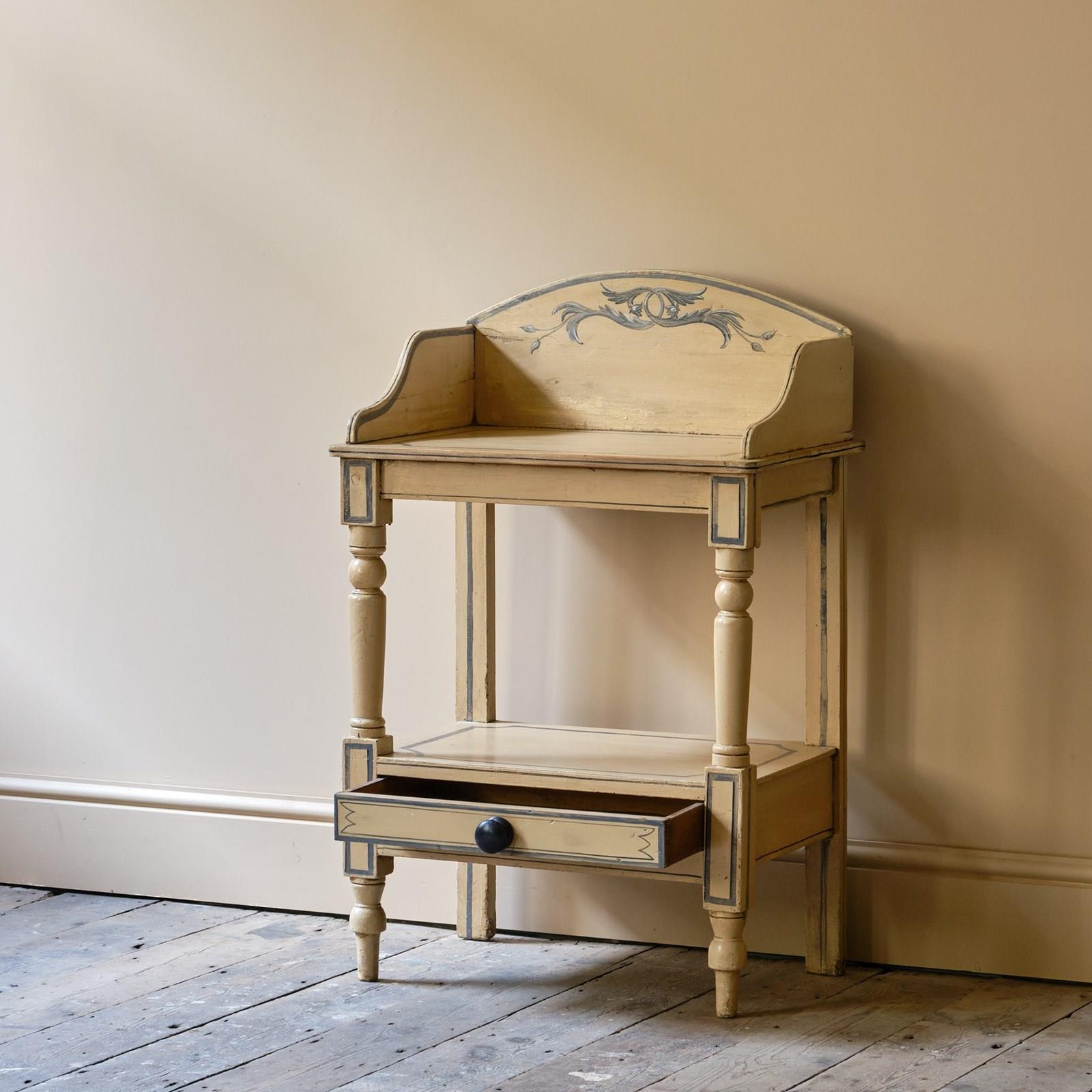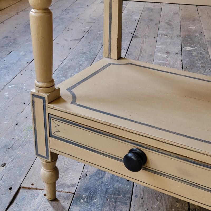 A 19th century pine washstand in later painted decoration. Turned front legs and supports with a single drawer to the lower tier. In good solid order and with nice wear and patina.