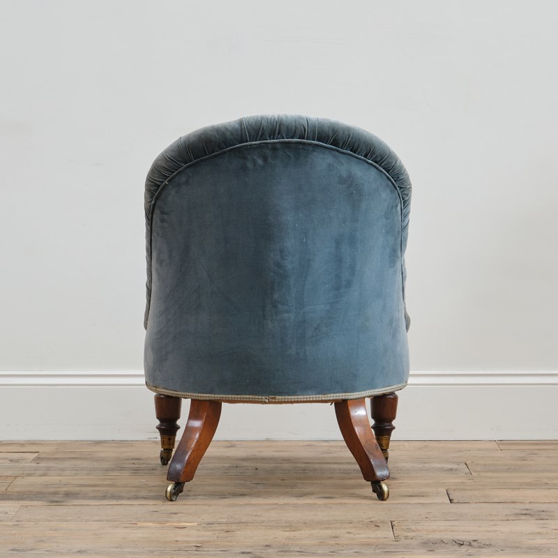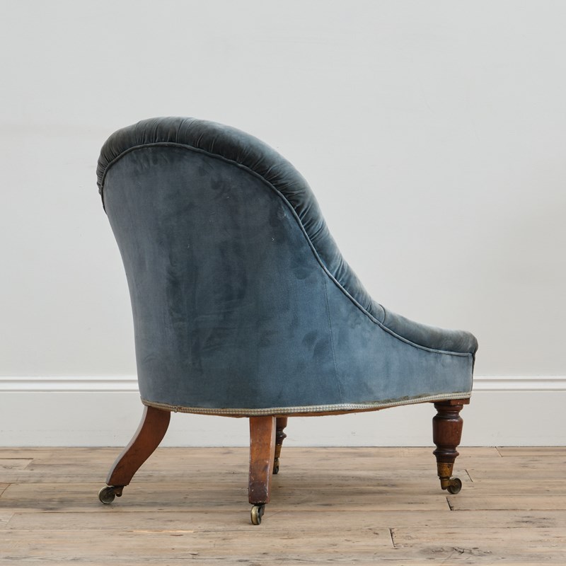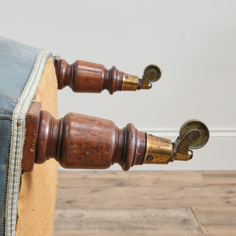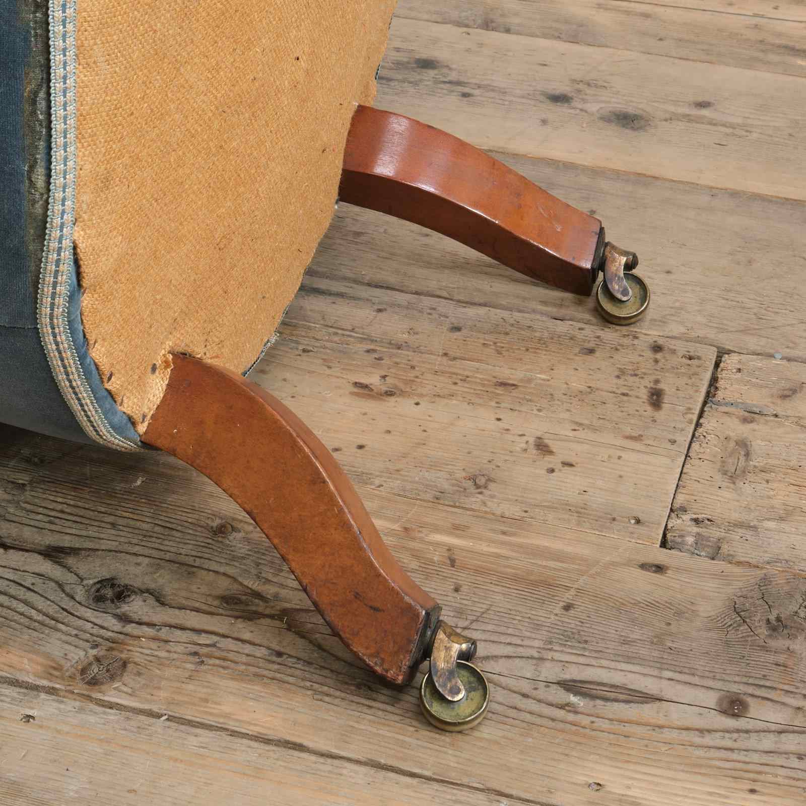 A well drawn mid 19th century slipper chair in the manner of Gillows. Raised on turned front legs with splayed rear legs and all with the original brass casters. c1850