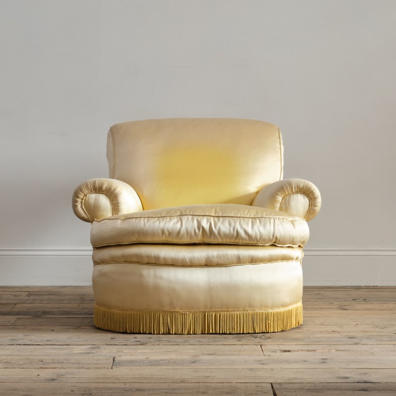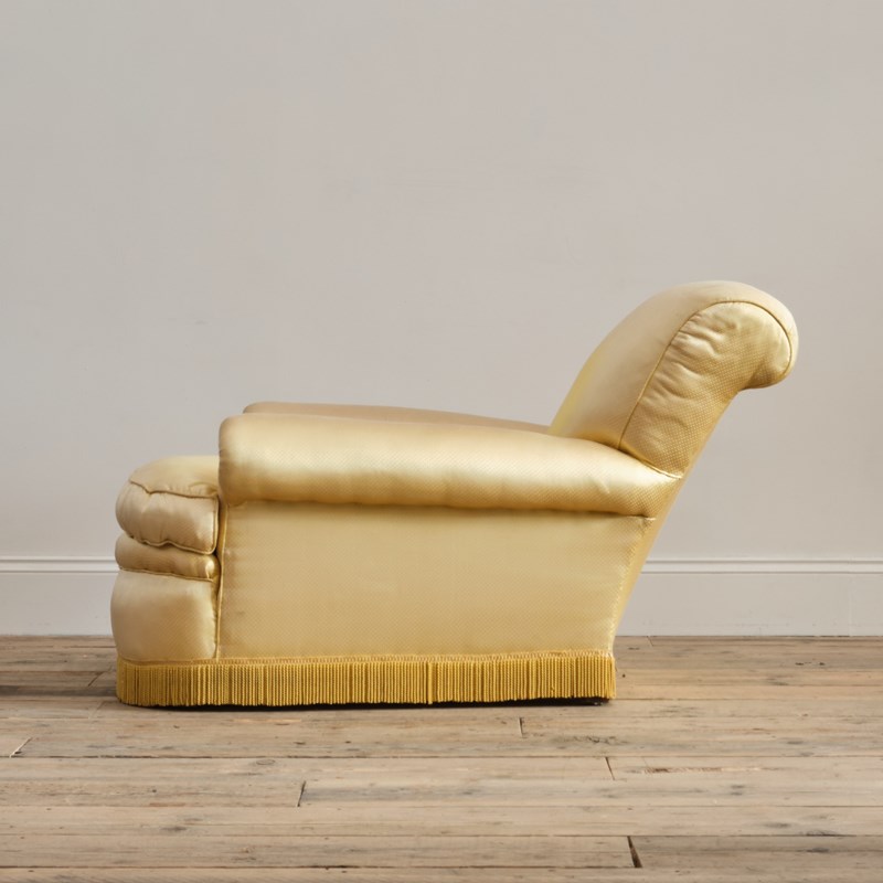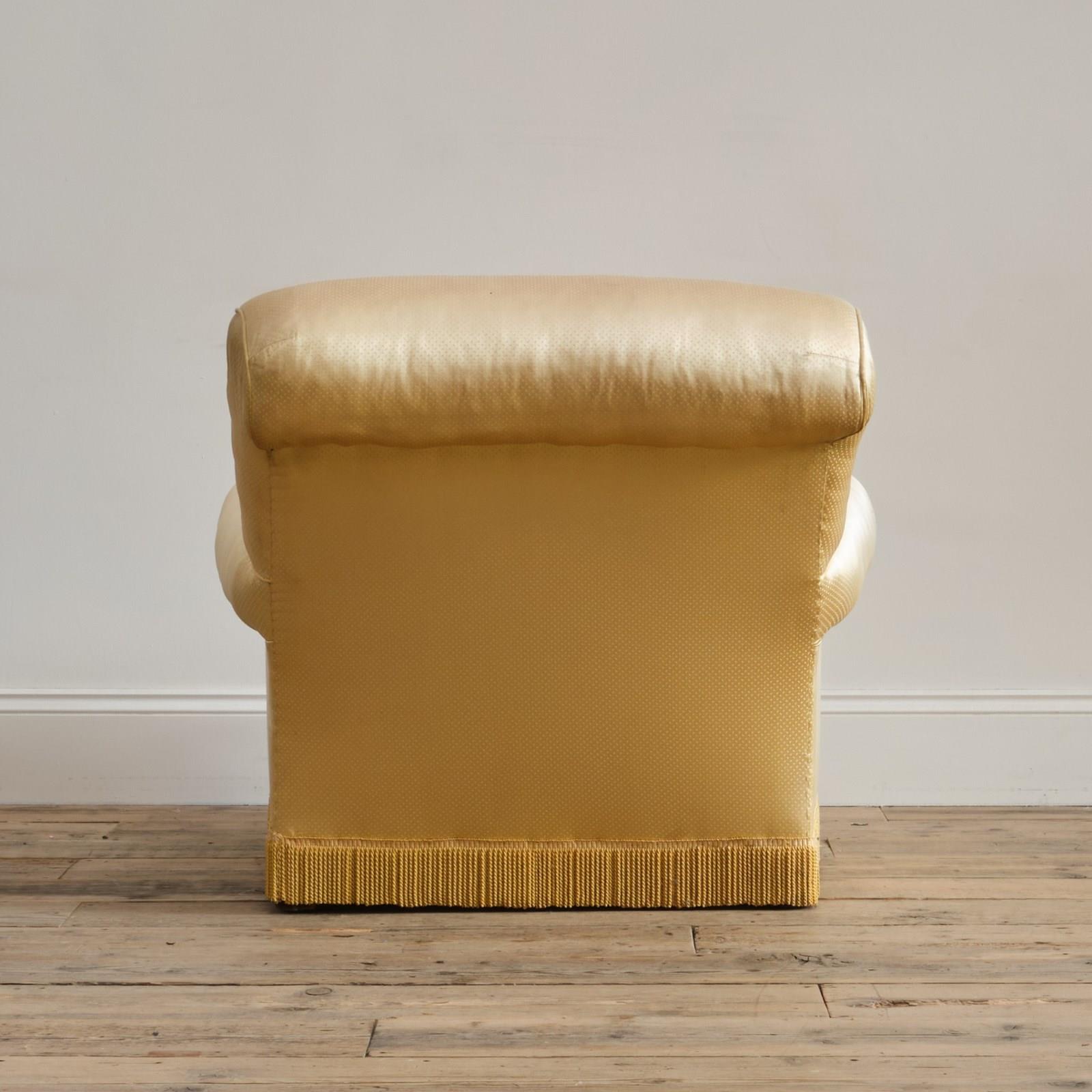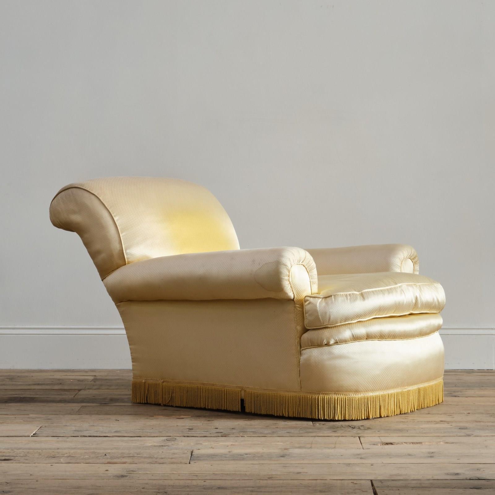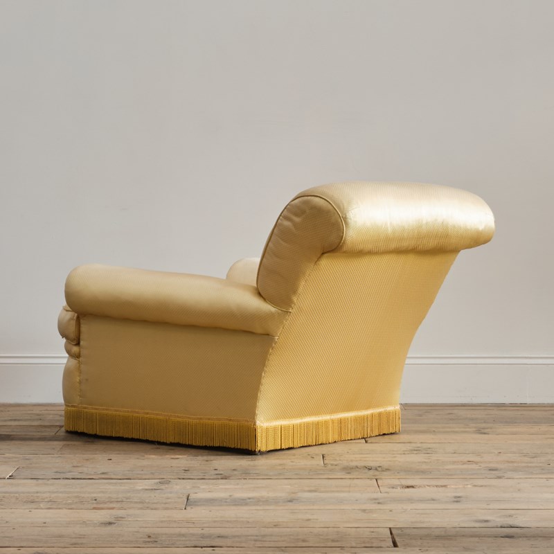 A mid 20th century country house deep seated Howard style club armchair. Traditionally upholstered with sprung arms, seat and back with a down filled back pad and seat cushion. Raised on beech legs.