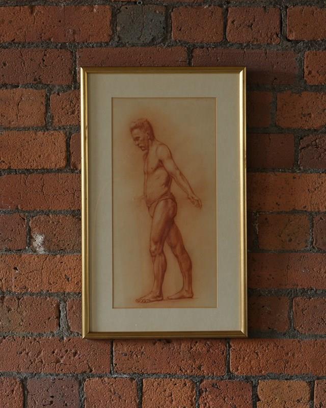 A mid 20th century male nude study in chalk on paper with a contemporary frame.