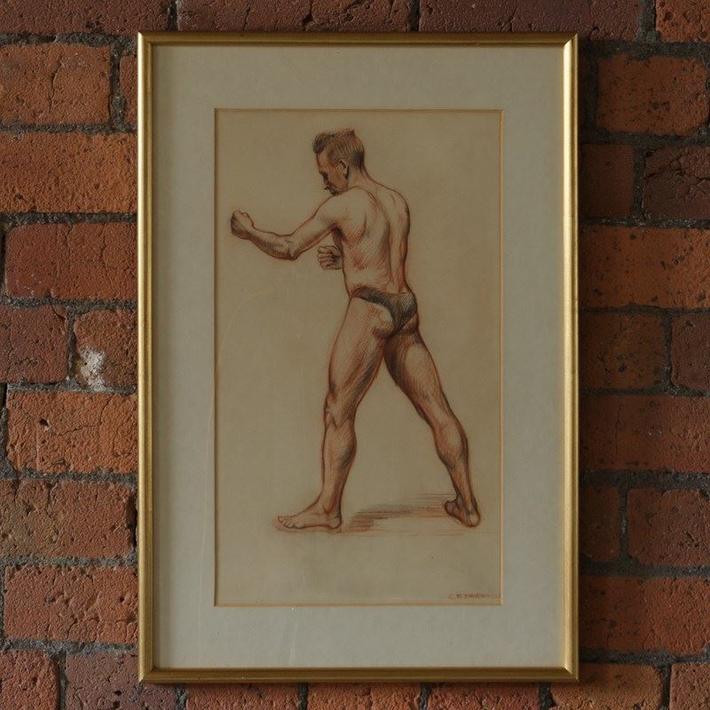 A mid 20th century male nude study in chalk and pencil on paper with a contemporary frame.