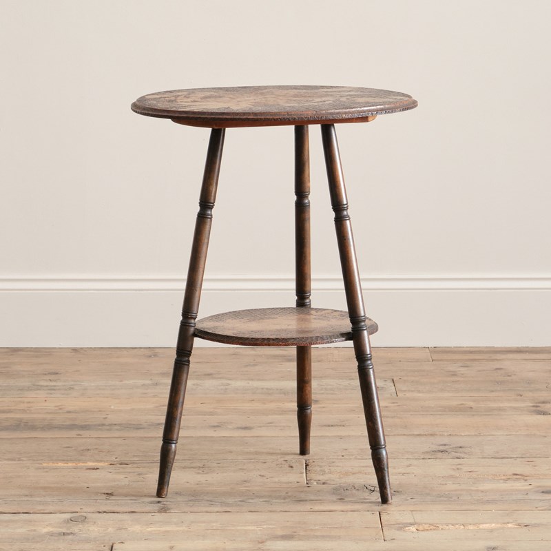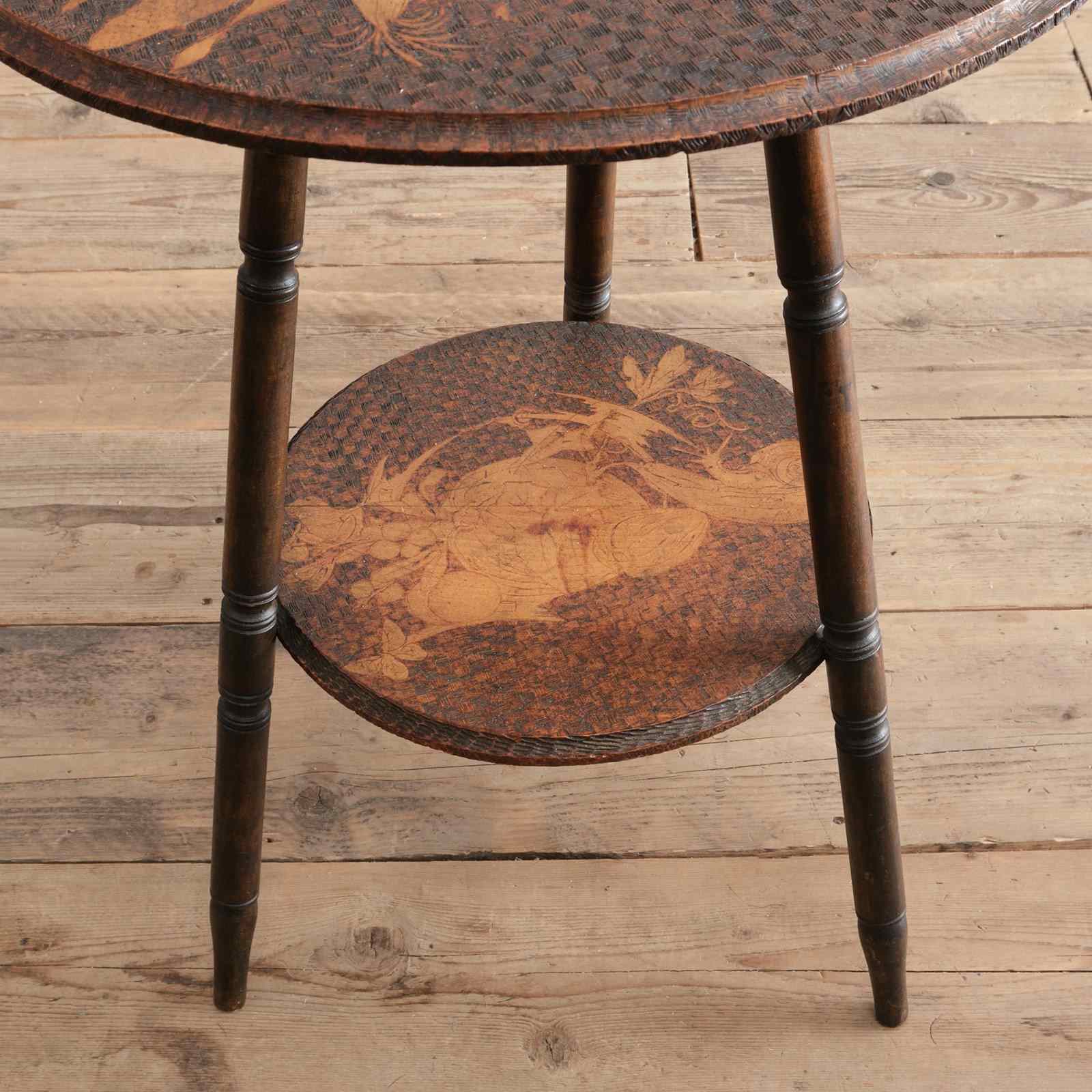 An early 20th century side table decorated with Poker Work on both top and bottom tiers. c1920