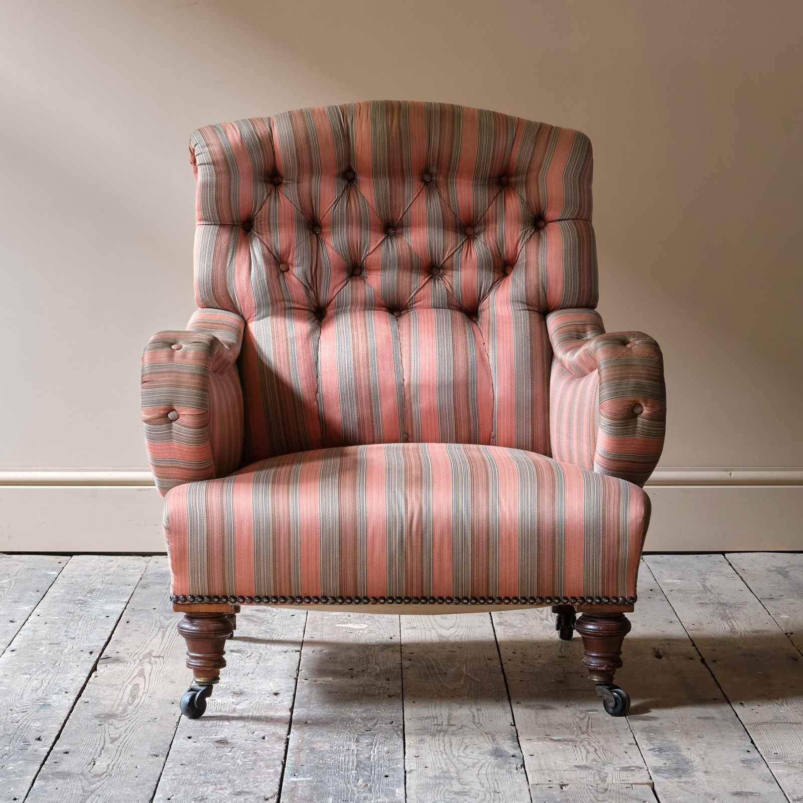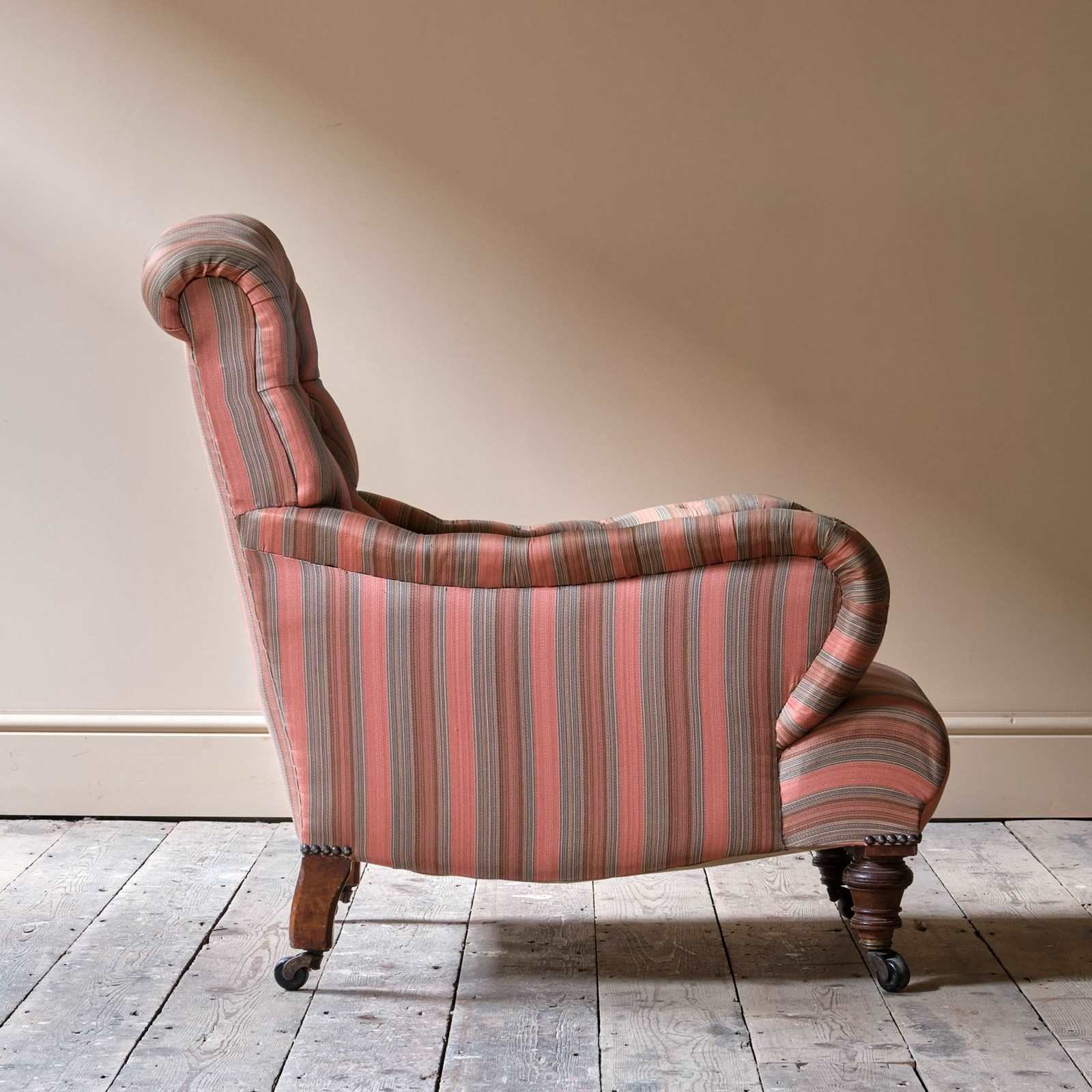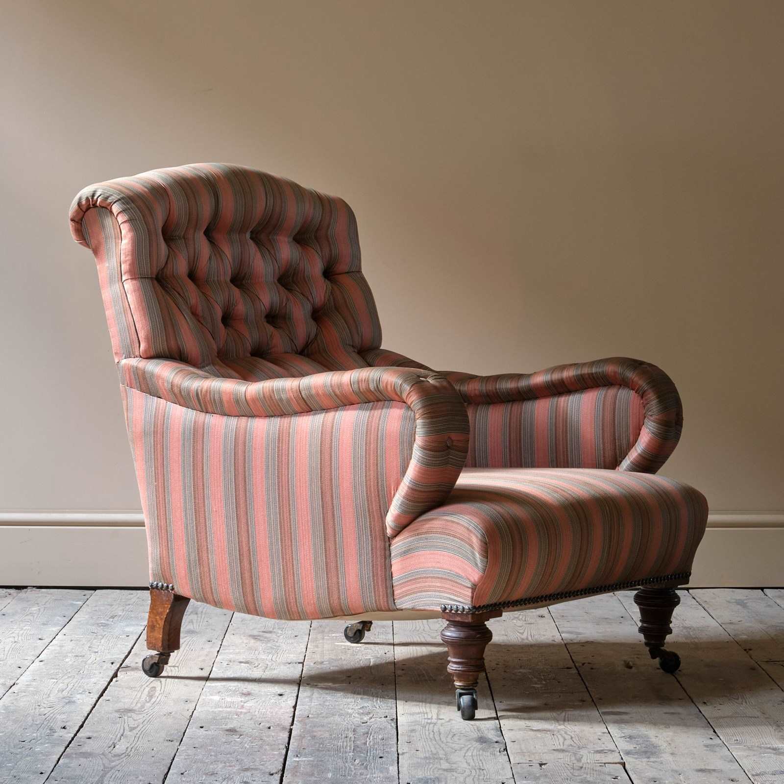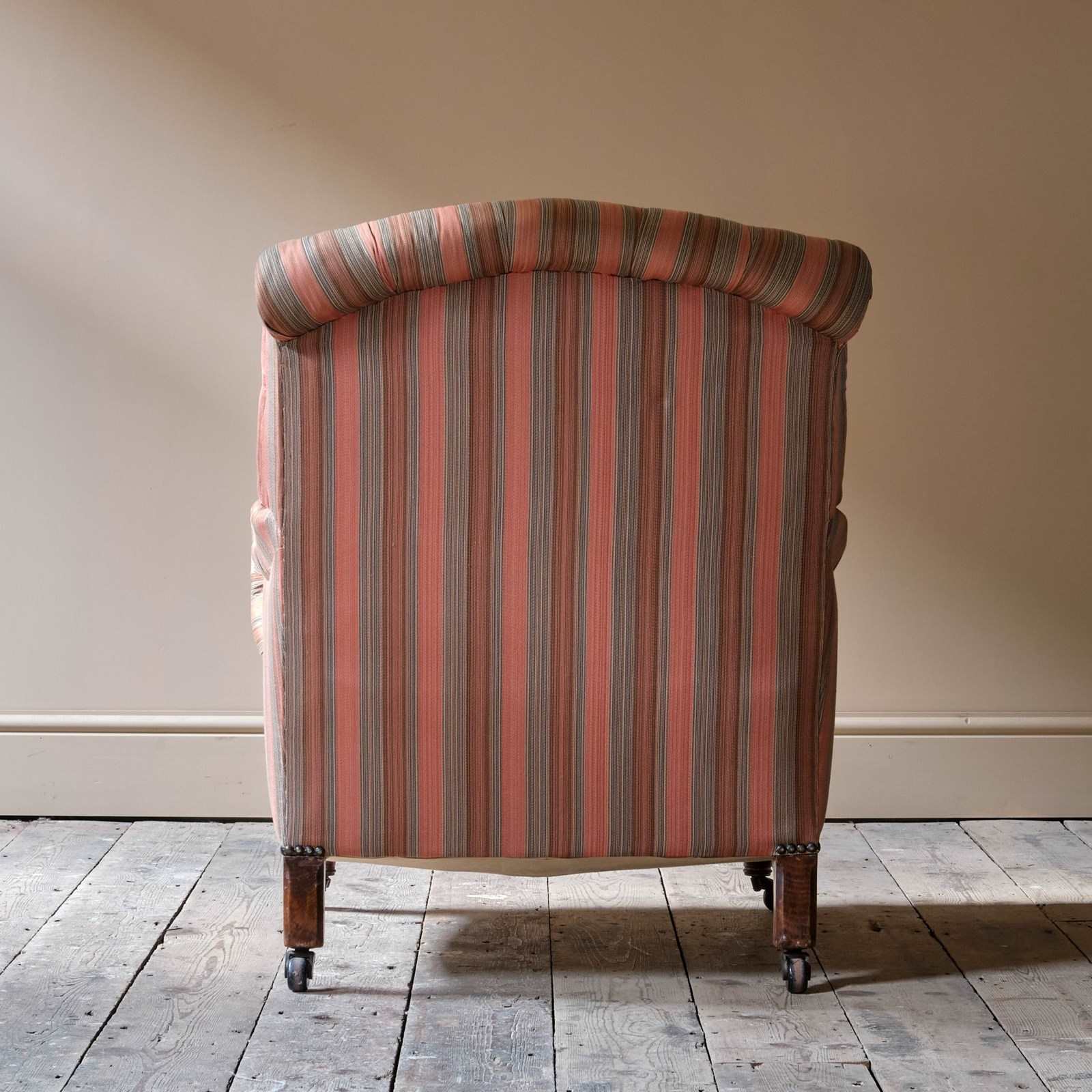 A good quality late 19th century country house armchair in the manner of Howard & Sons. English c1890. Raised on walnut legs and the original casters.