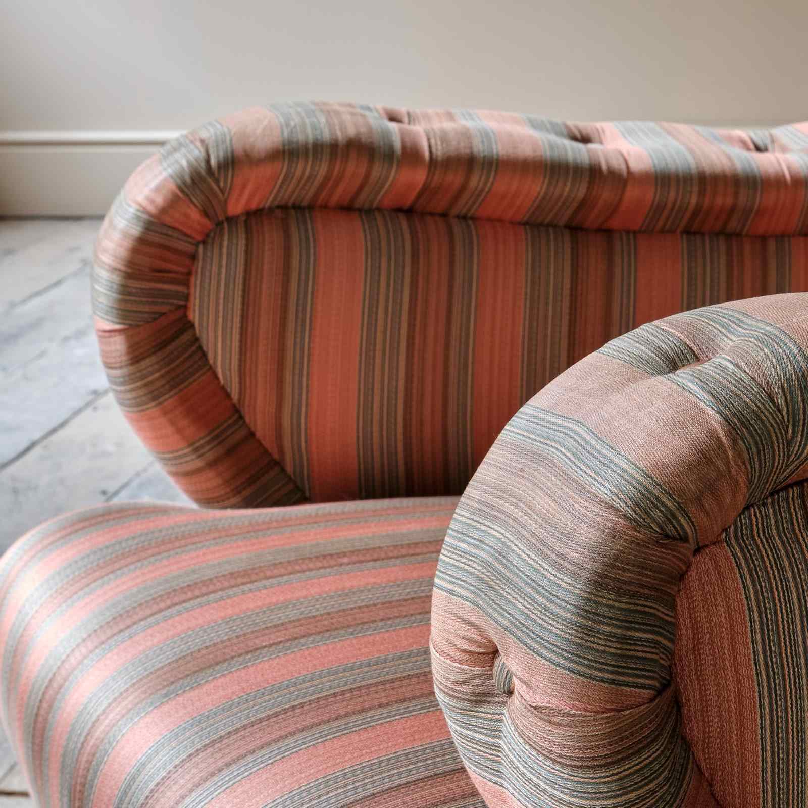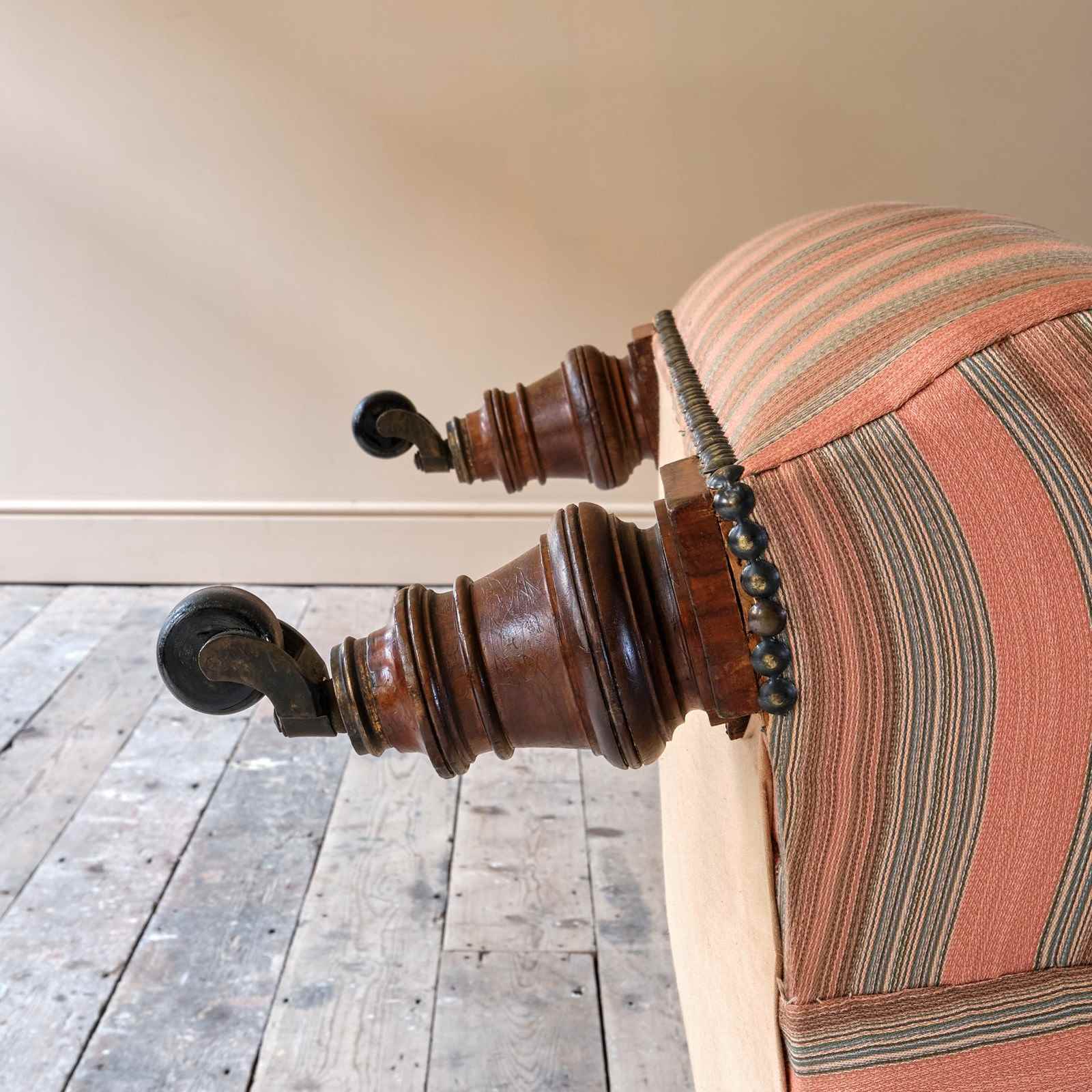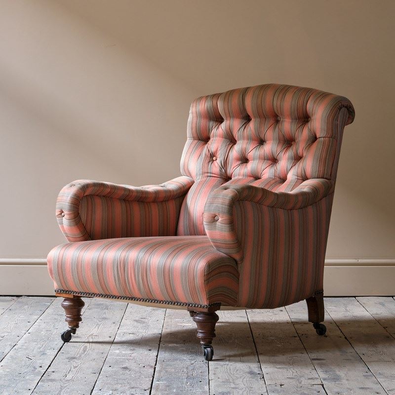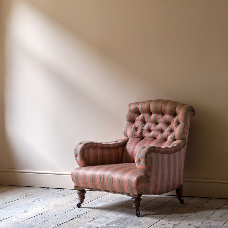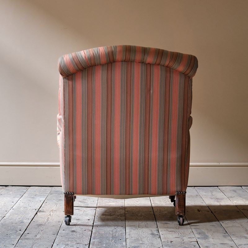 A good quality late 19th century country house armchair in the manner of Howard & Sons. English c1890. Raised on walnut legs and the original casters.