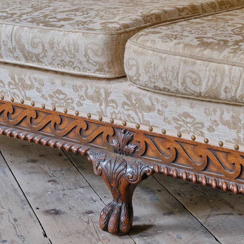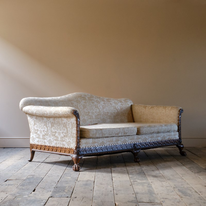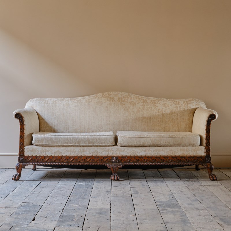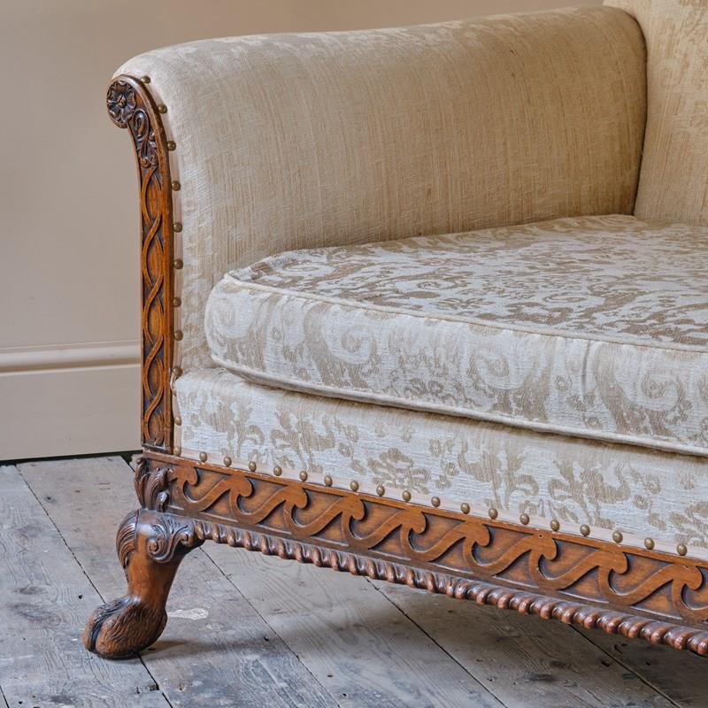A well drawn antique deep seated country house sofa. Raised on 3 crisply carved paw front feet and splayed rear legs The innards are traditional and are firm and intact. . English c1900
