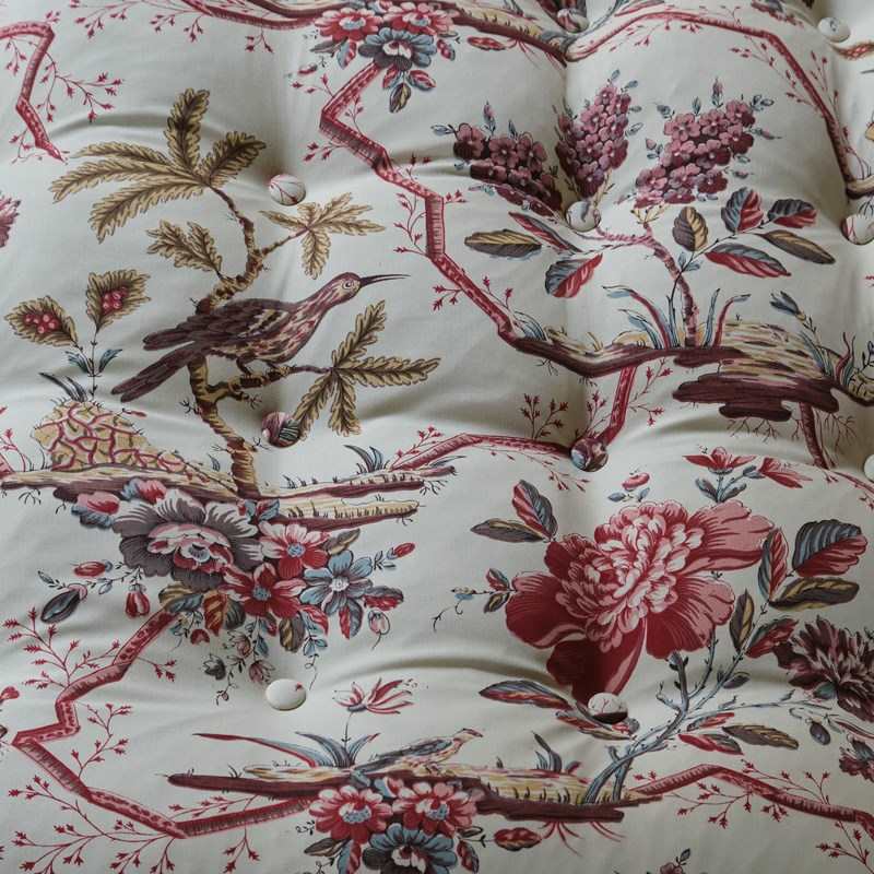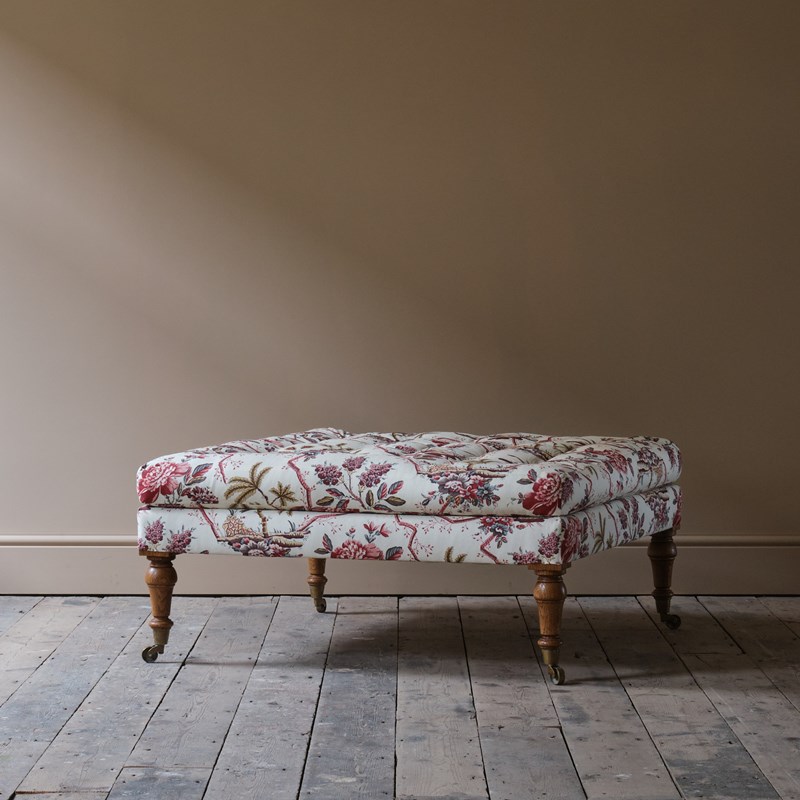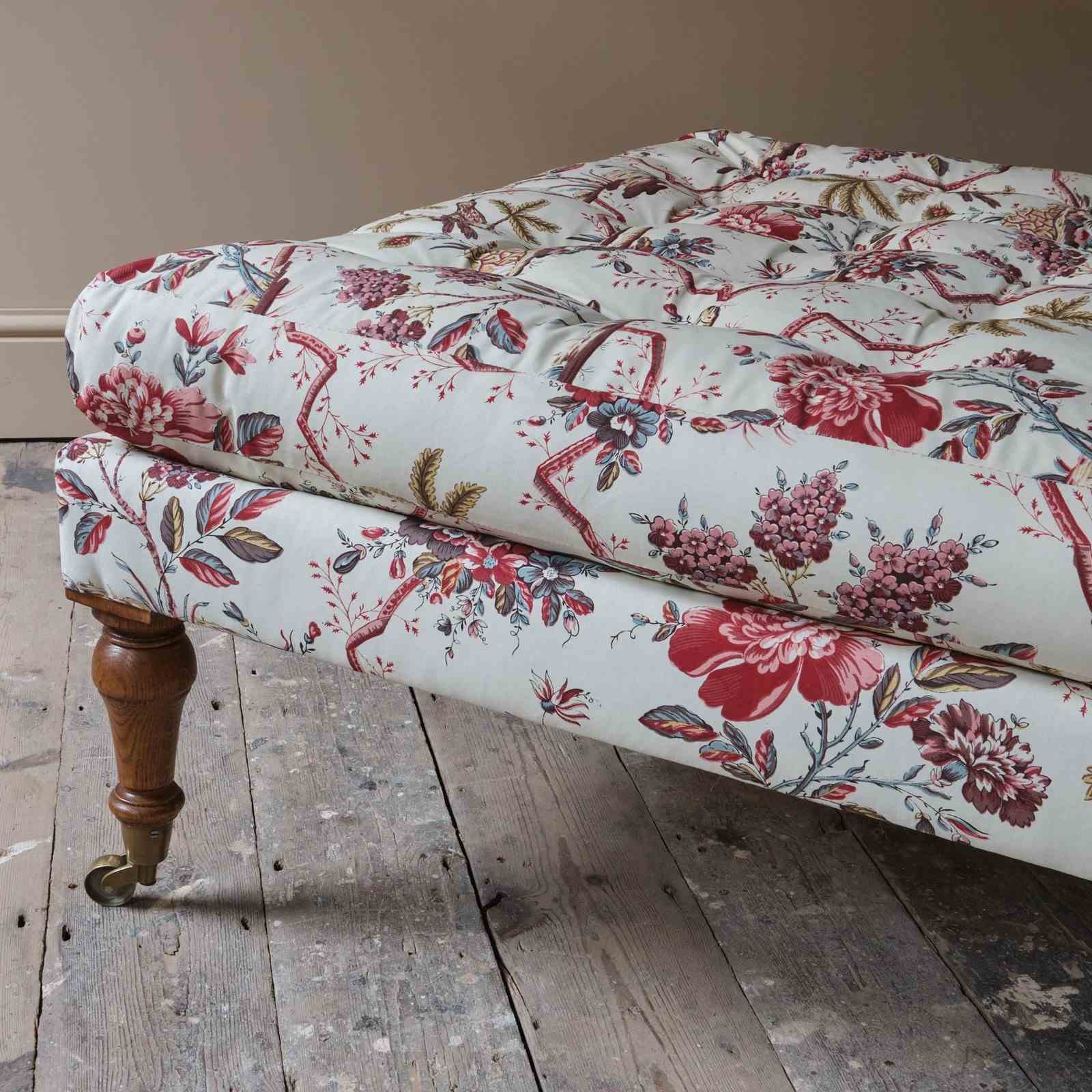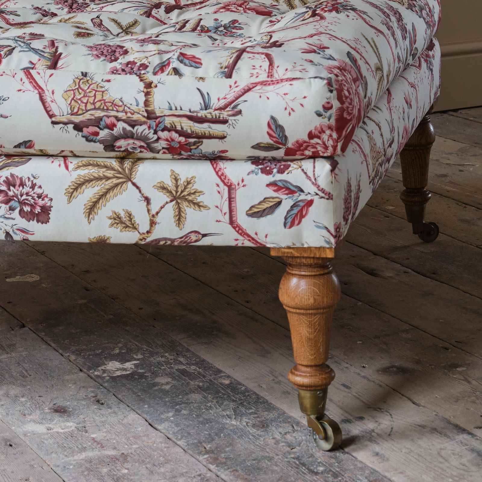A large bespoke made country house footstool. Raised on 4 turned oak legs capped with Desired Effect reproduction brass casters, cast 19th century originals. The traditionally made frame and the tufted feather top are covered in Pierre Frey 'Comtesse De Mailly' printed cotton.