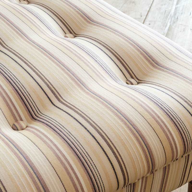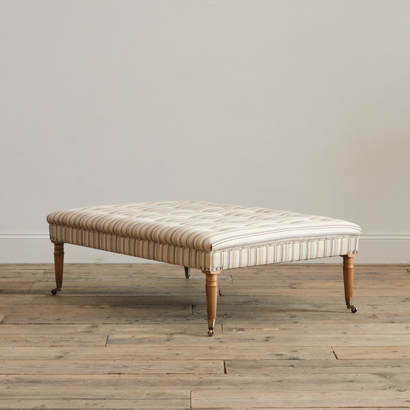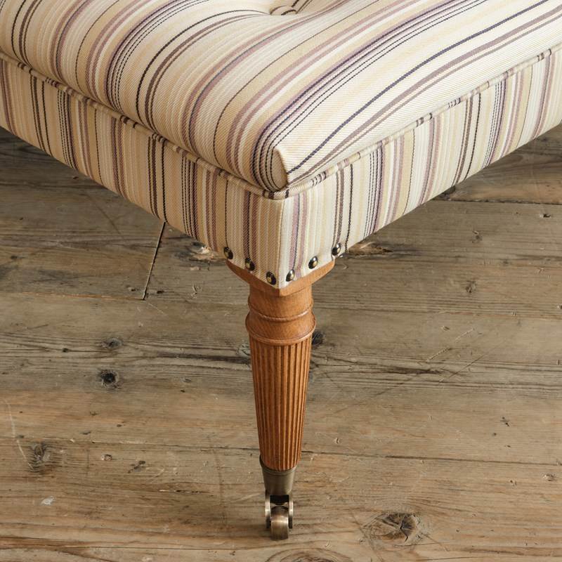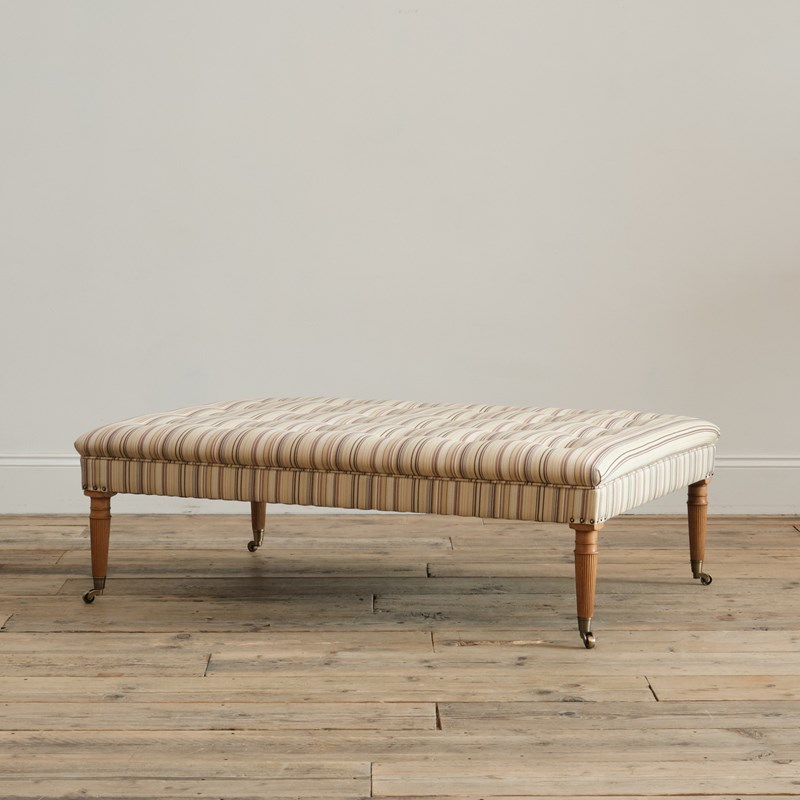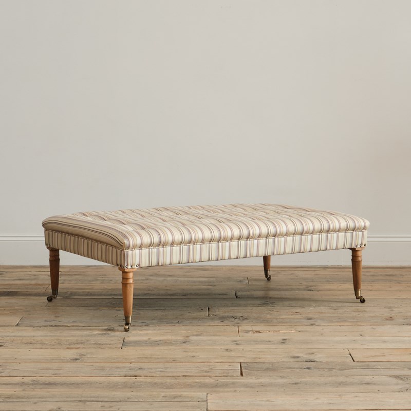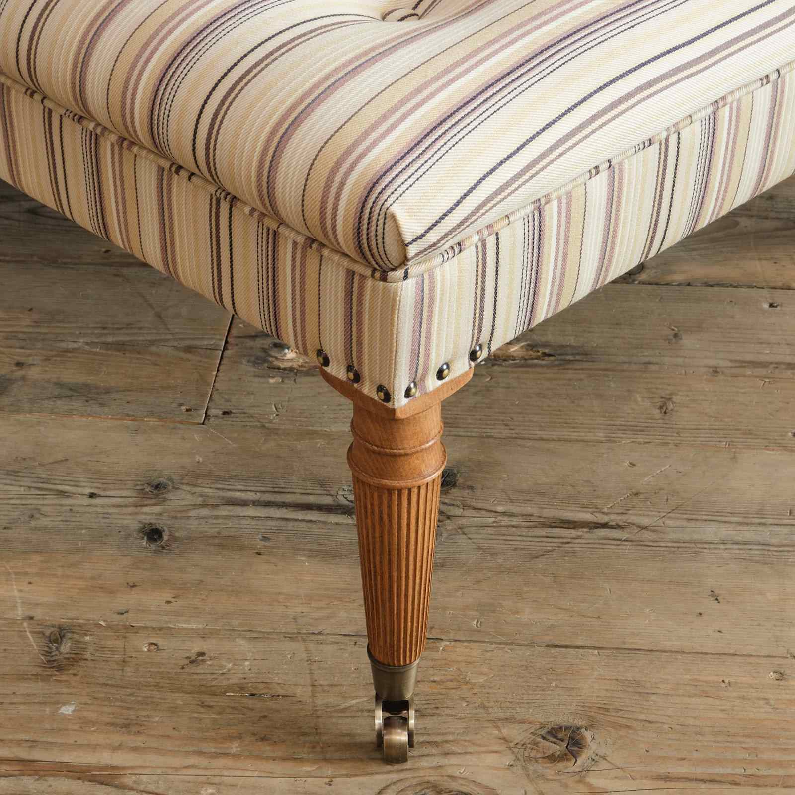 A large country house inspired footstool. Upholstered in striped wool. Raised on turned beech and reeded legs and casters.