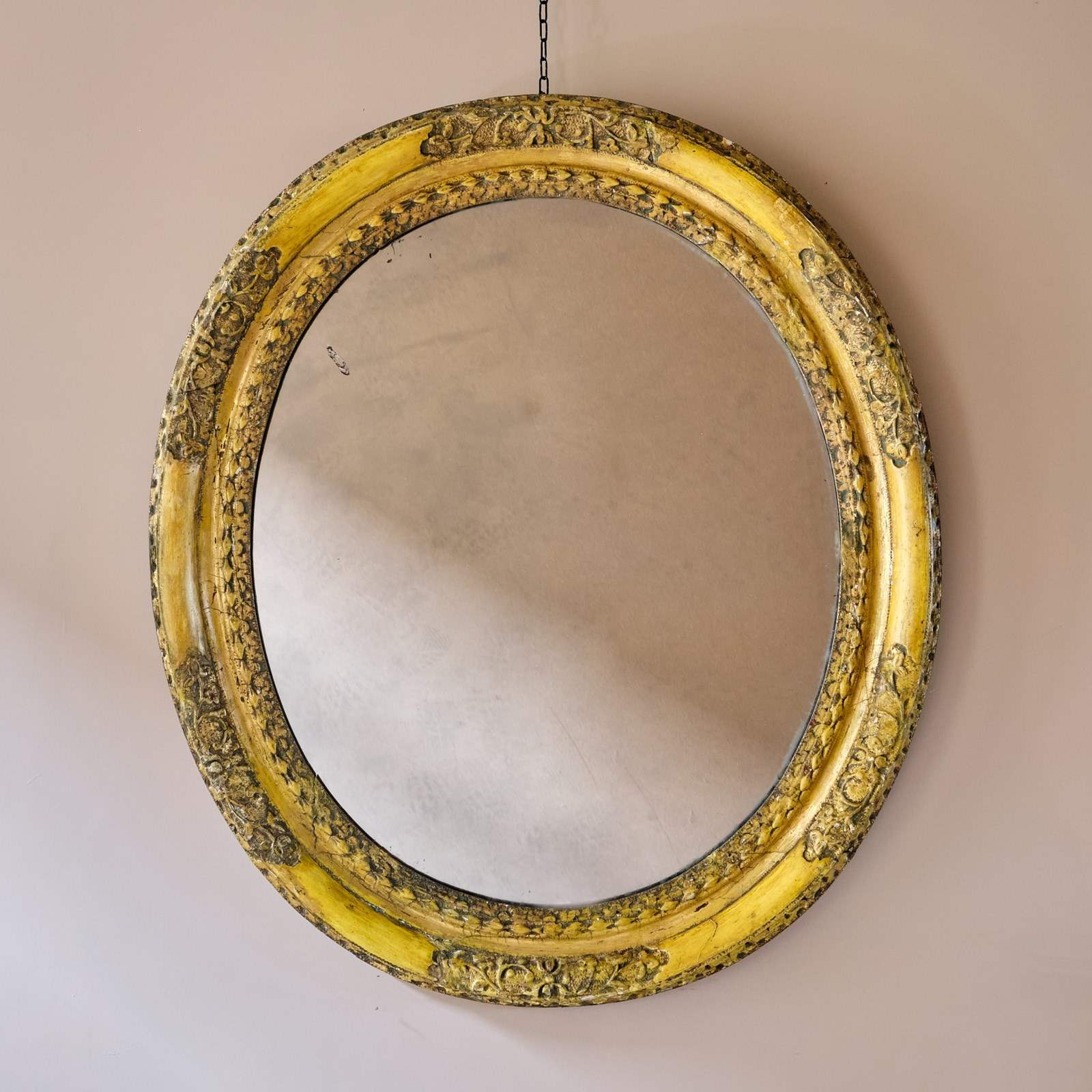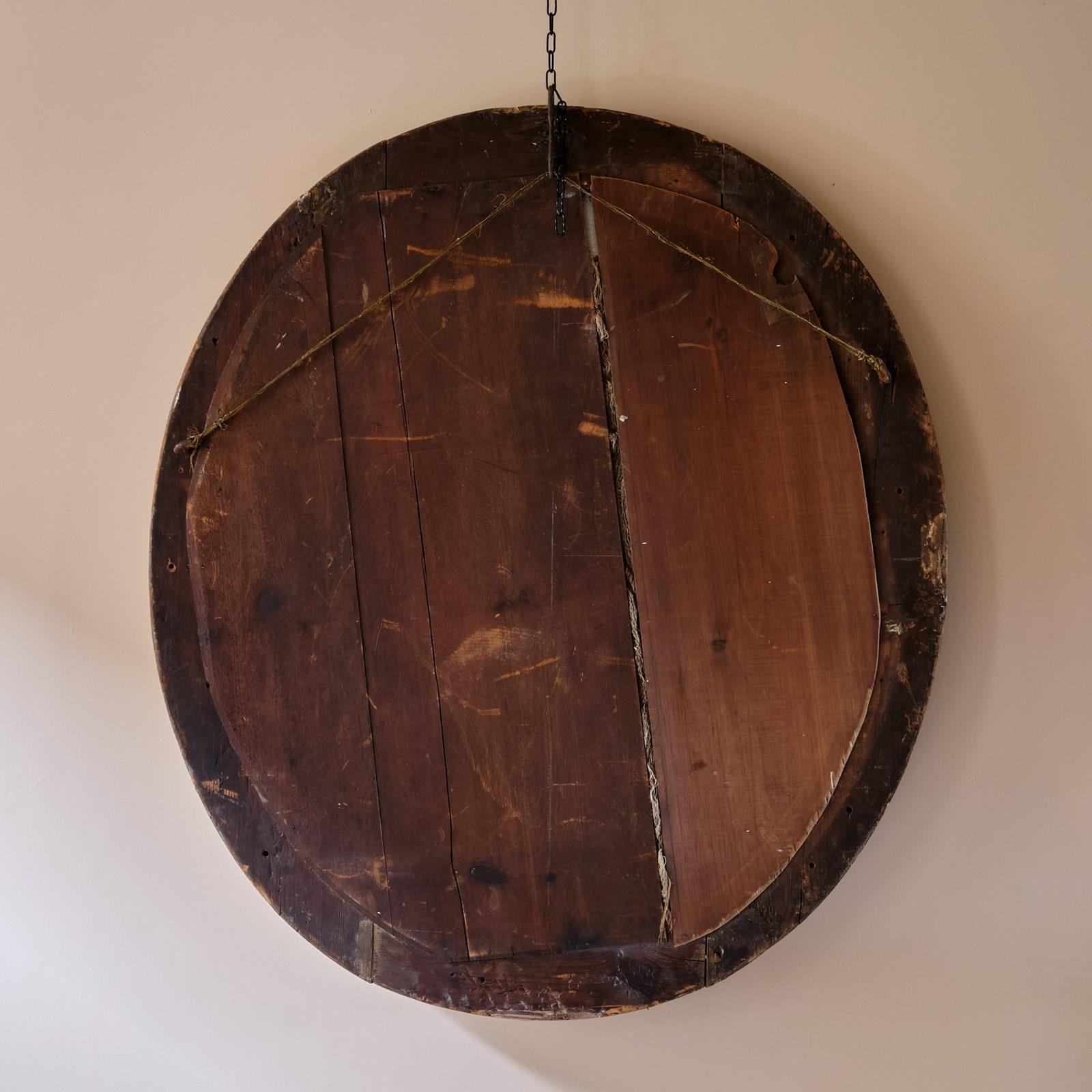 An early 18th century oval Gilt mirror. The frame with wear and worn gilt finish showing most of the under coat. What sets this mirror apart is the original mercury plate. It sparkles in the light like nothing we have seen before. Unfortunately this doesn't capture it on the images but it really is something else.