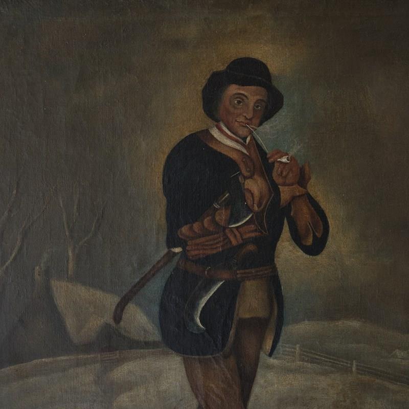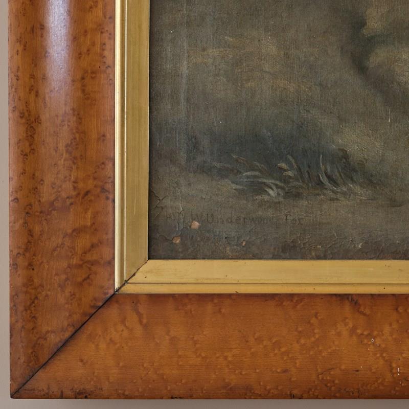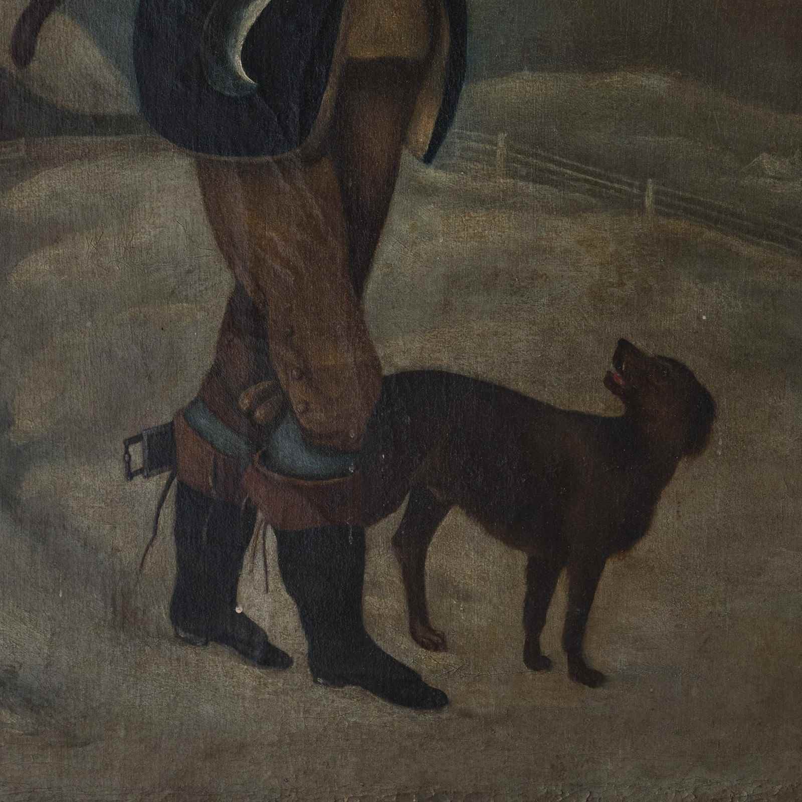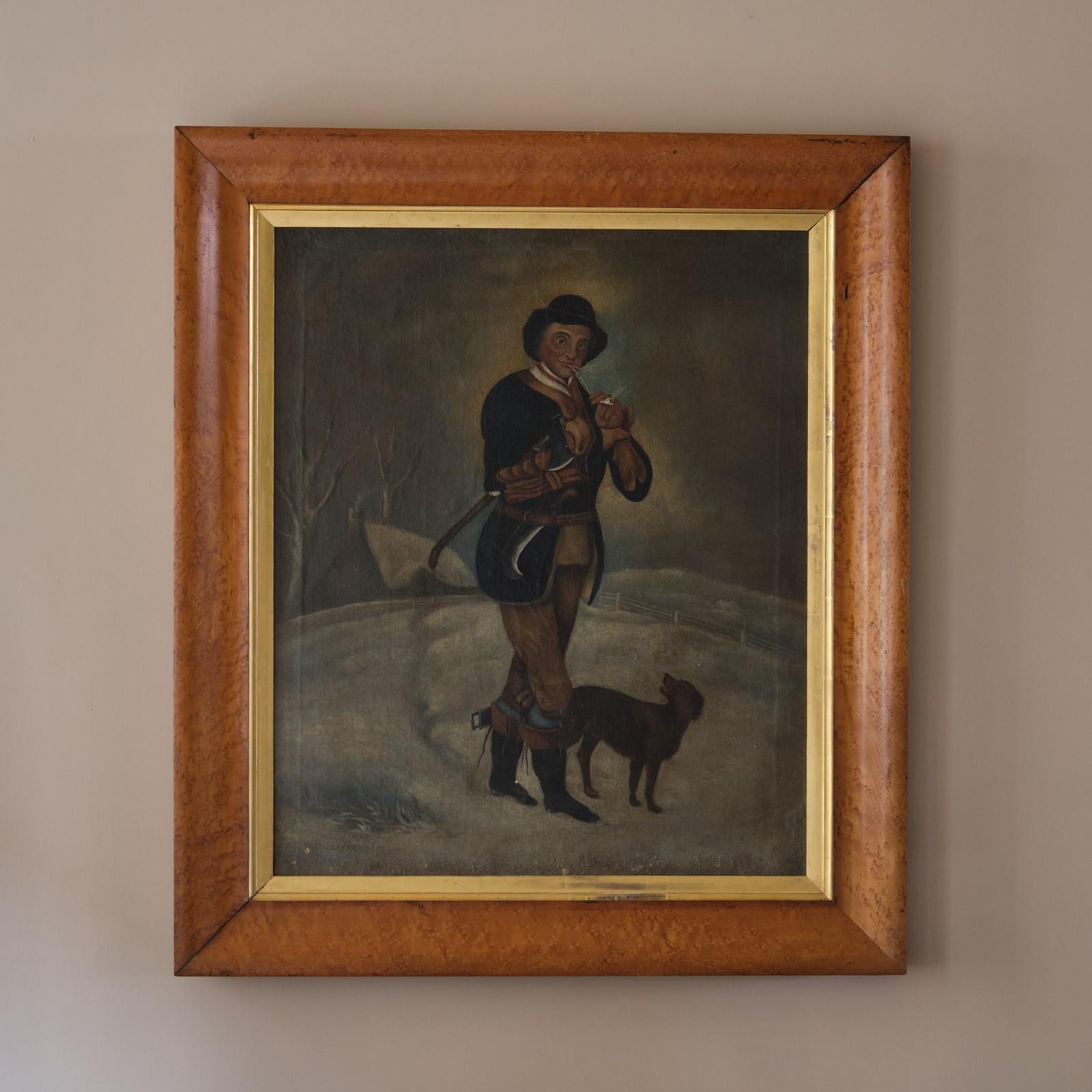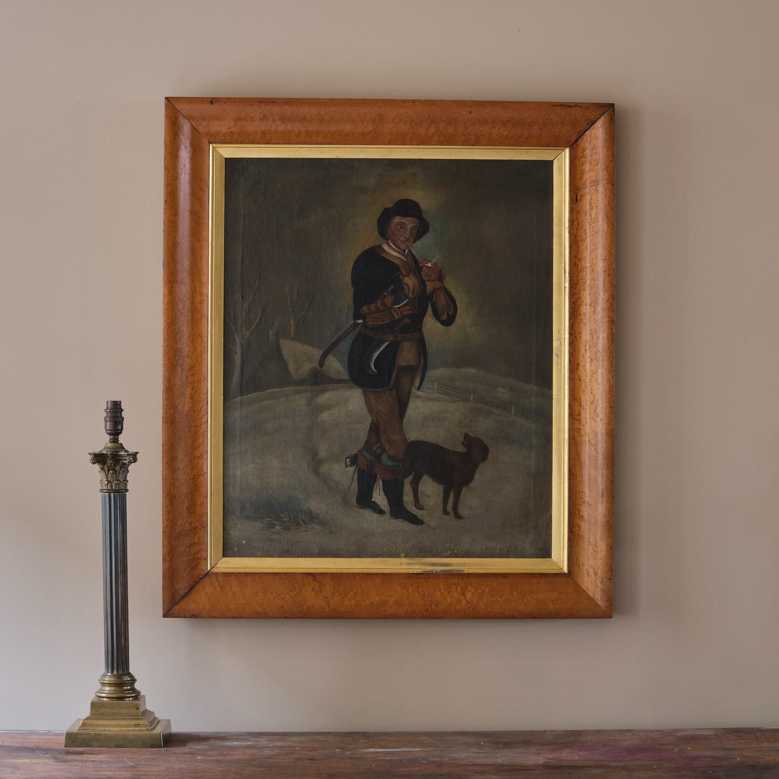 A large and charming early 19th century oil on canvas set in its original Birdseye maple frame with a gilt slip. Depicting a gentleman with his dog in a snowy field. Signed to the bottom right. English c1830