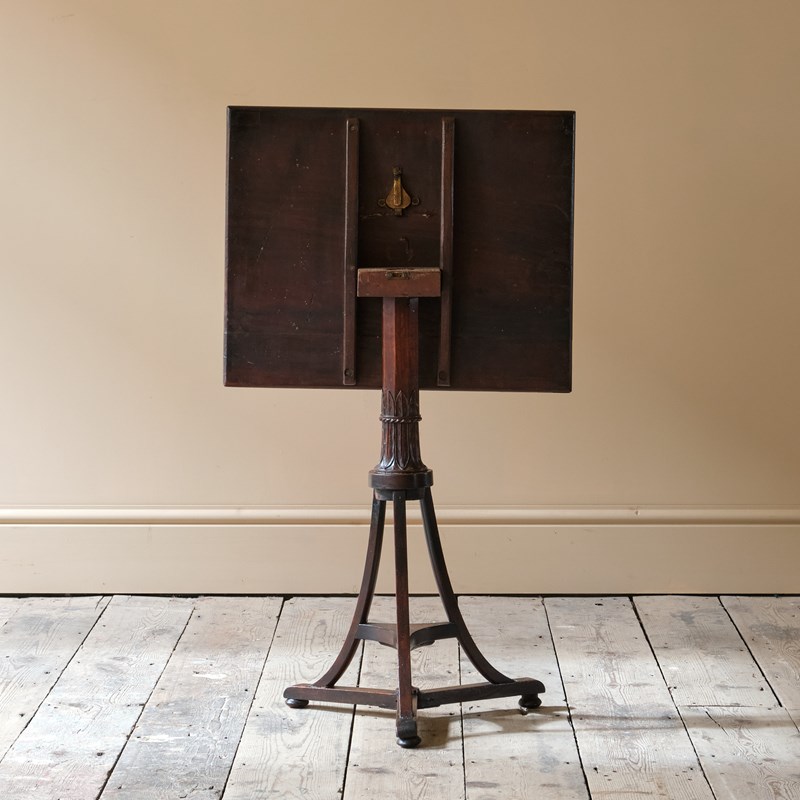 An Early 19th century tilt top table. The wonderfully carved and chamfered stem on a tripod base. The top seems to be a later addition with the base possibly having been converted into a table base.