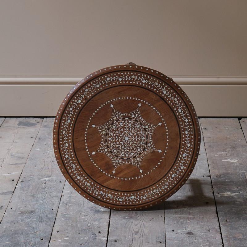 A medium sized early 20th century Hoshiarpur side table. The lift off top with ebony and bone inlay above a folding base also with bone inlay. In good clean order with only a couple of the bone inlays missing.