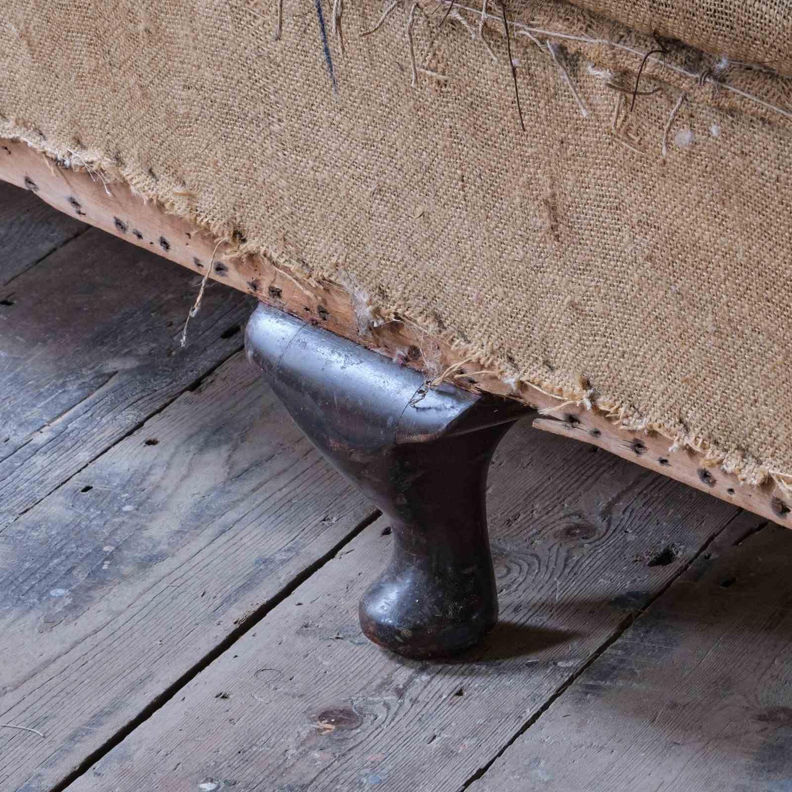 An early 20th century country house sofa. Raised on 3 front cabriole legs. The sofa retains its original horse hair buttoned fillings to the arms back and seat.