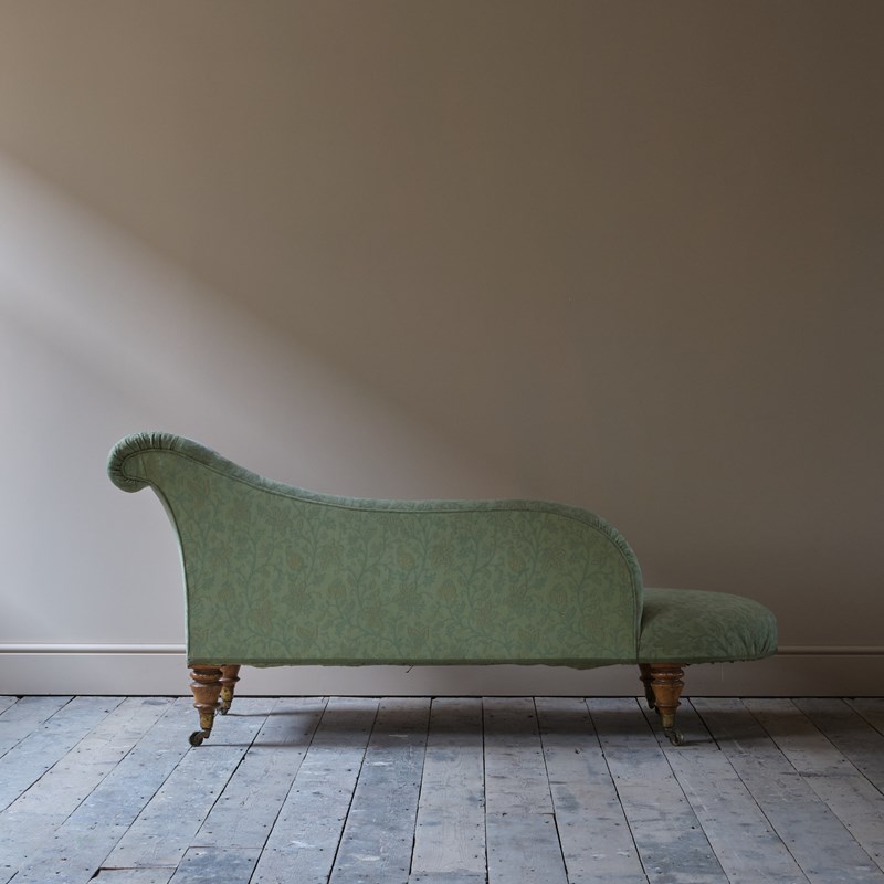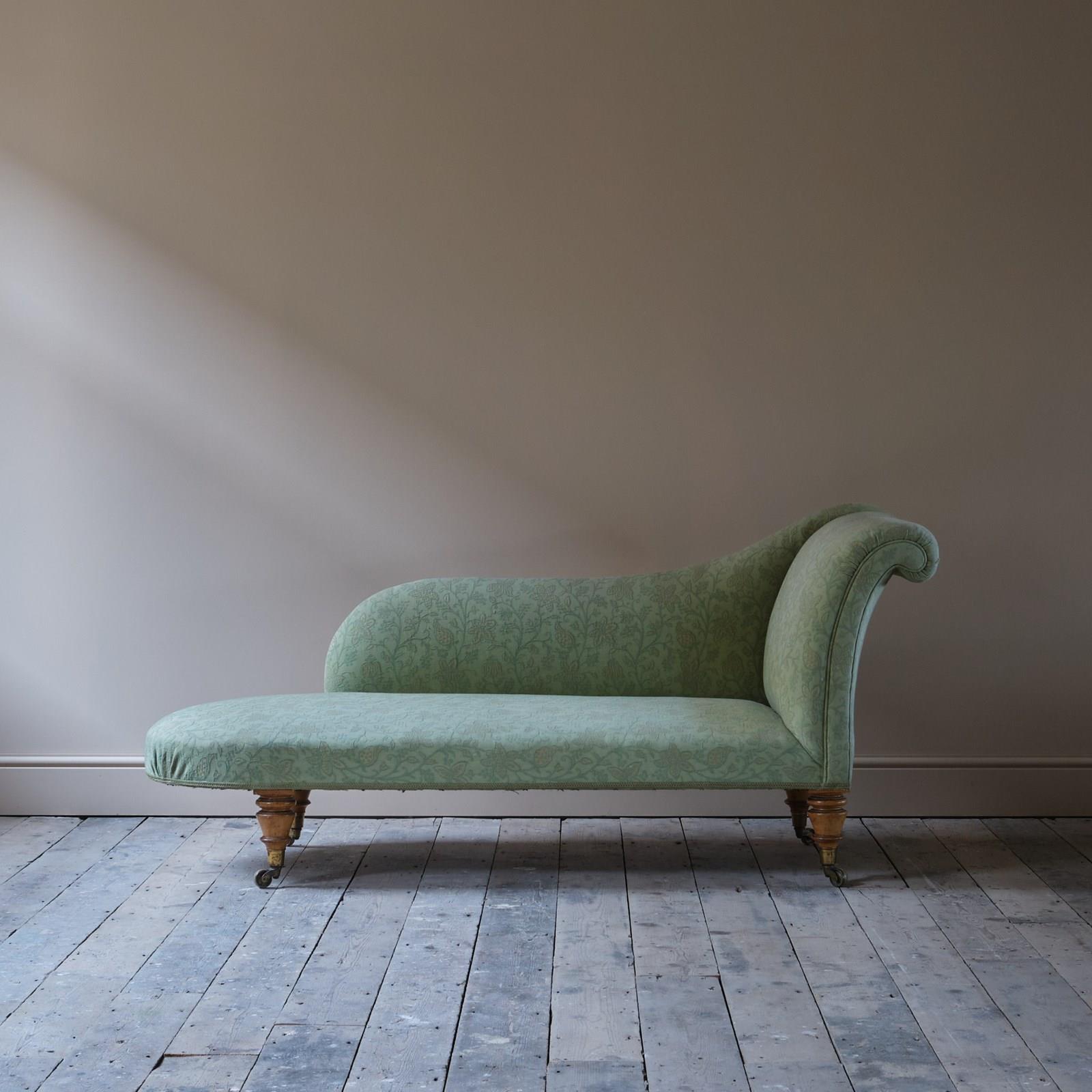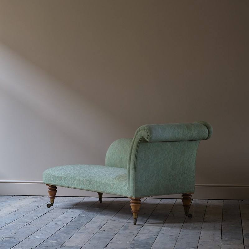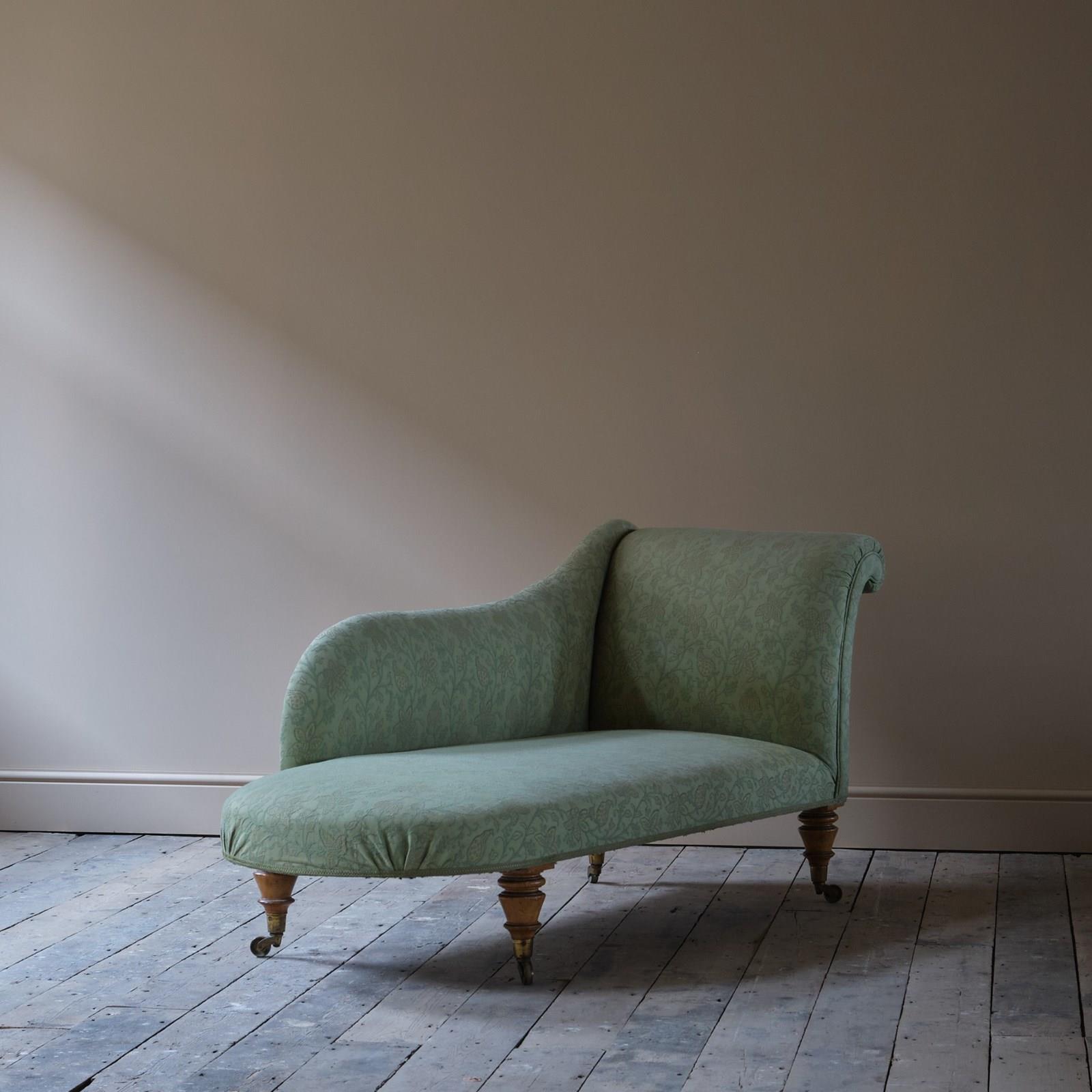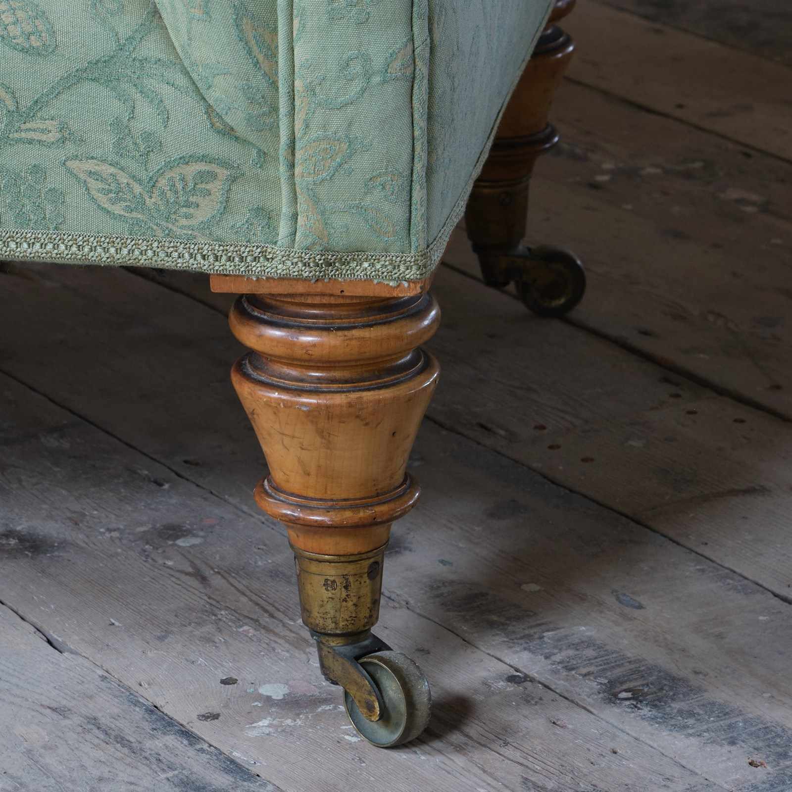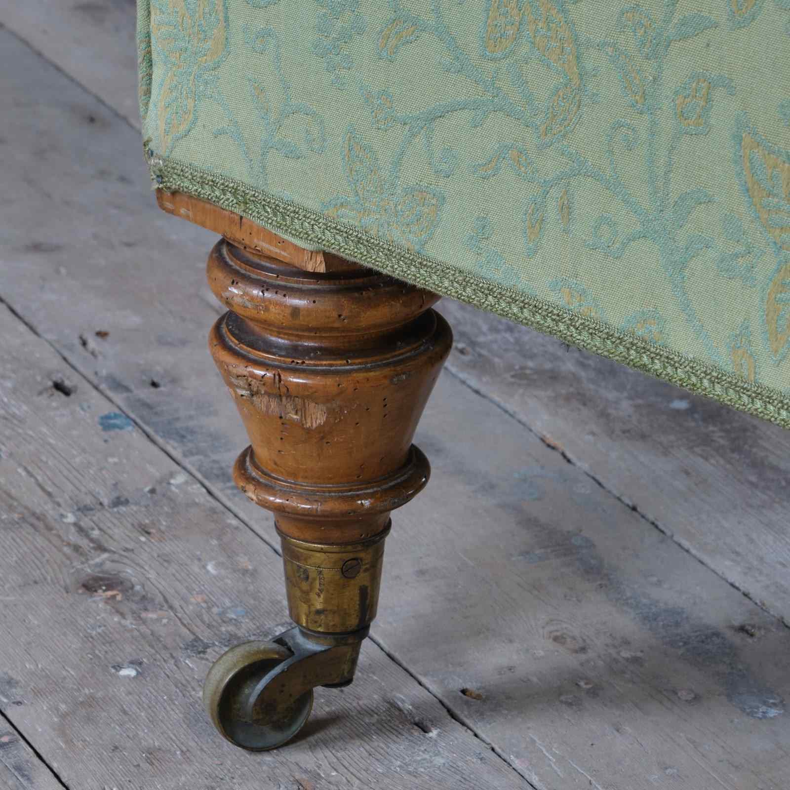 A well drawn early Hindley & Sons Chaise longue. Raised on 4 turned legs with the original gilt brass cup casters. The Shapely walnut frame bears the Hindley & Sons - Late Miles & Edwards, 134 Oxford Street - London, which dates this to around 1845.