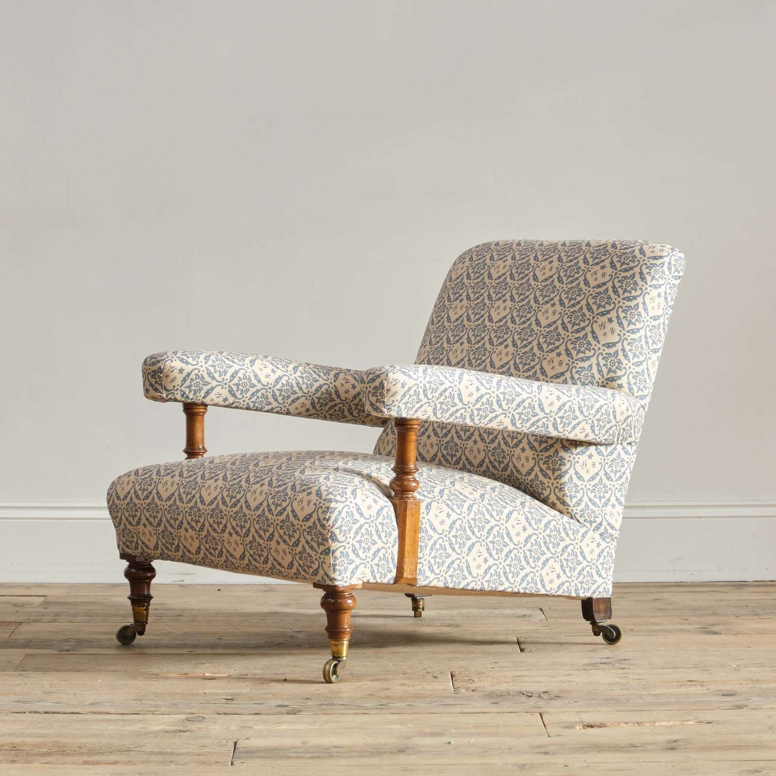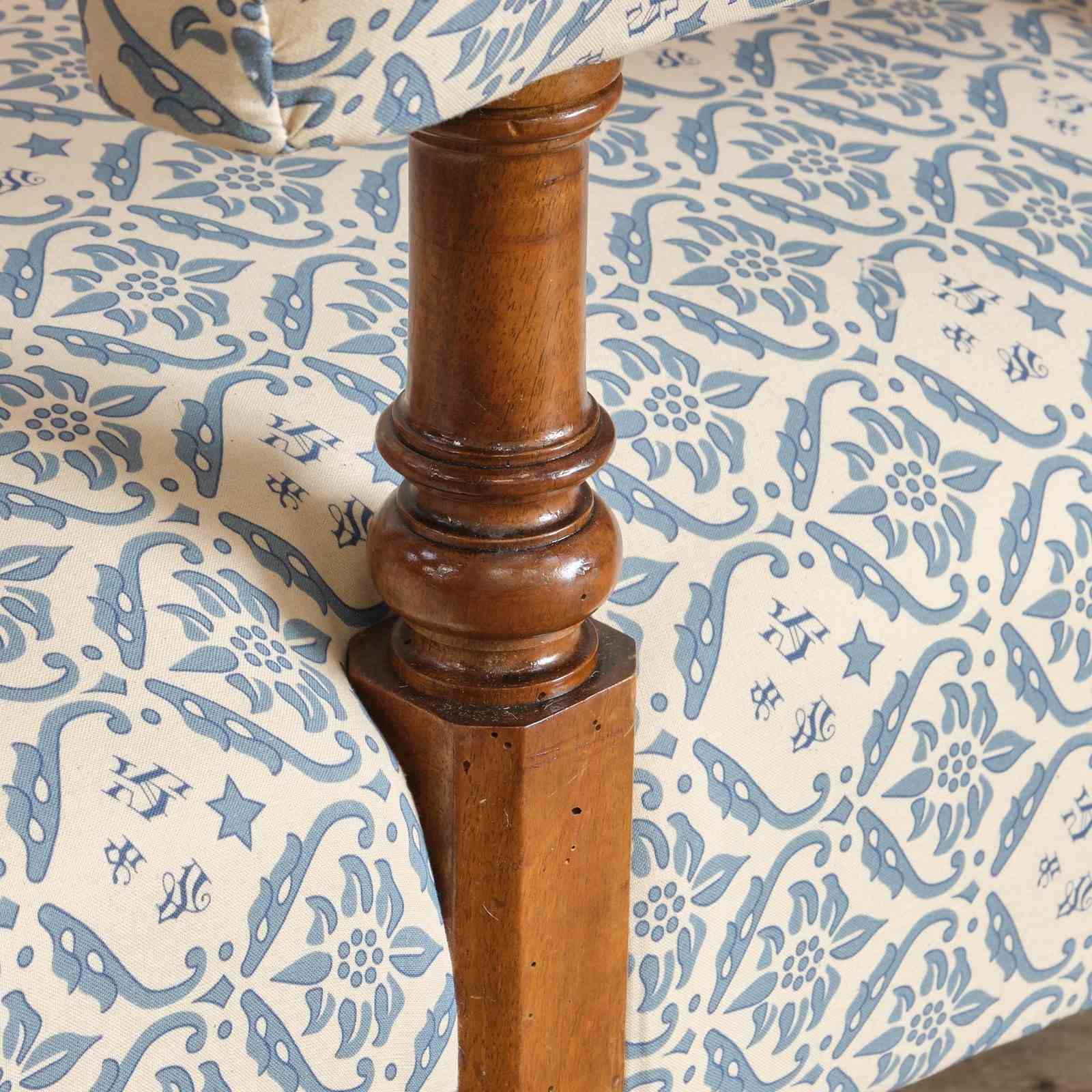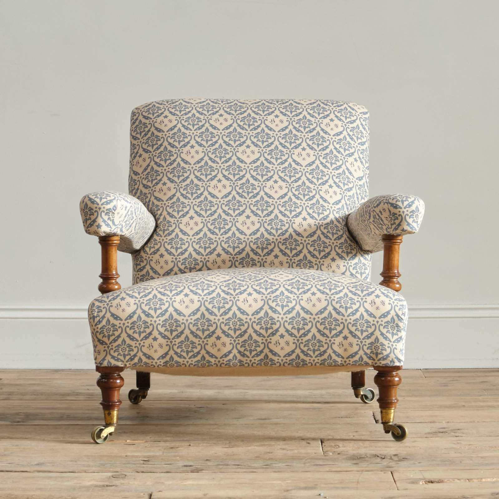The chair has been fully restored by us from the frame up with brand new seat springs and we have reused the original fillings where possible. It has been covered in a reproduction of the blue and white H&S printed cotton lining ready to be used as is or for you choice of top covering.