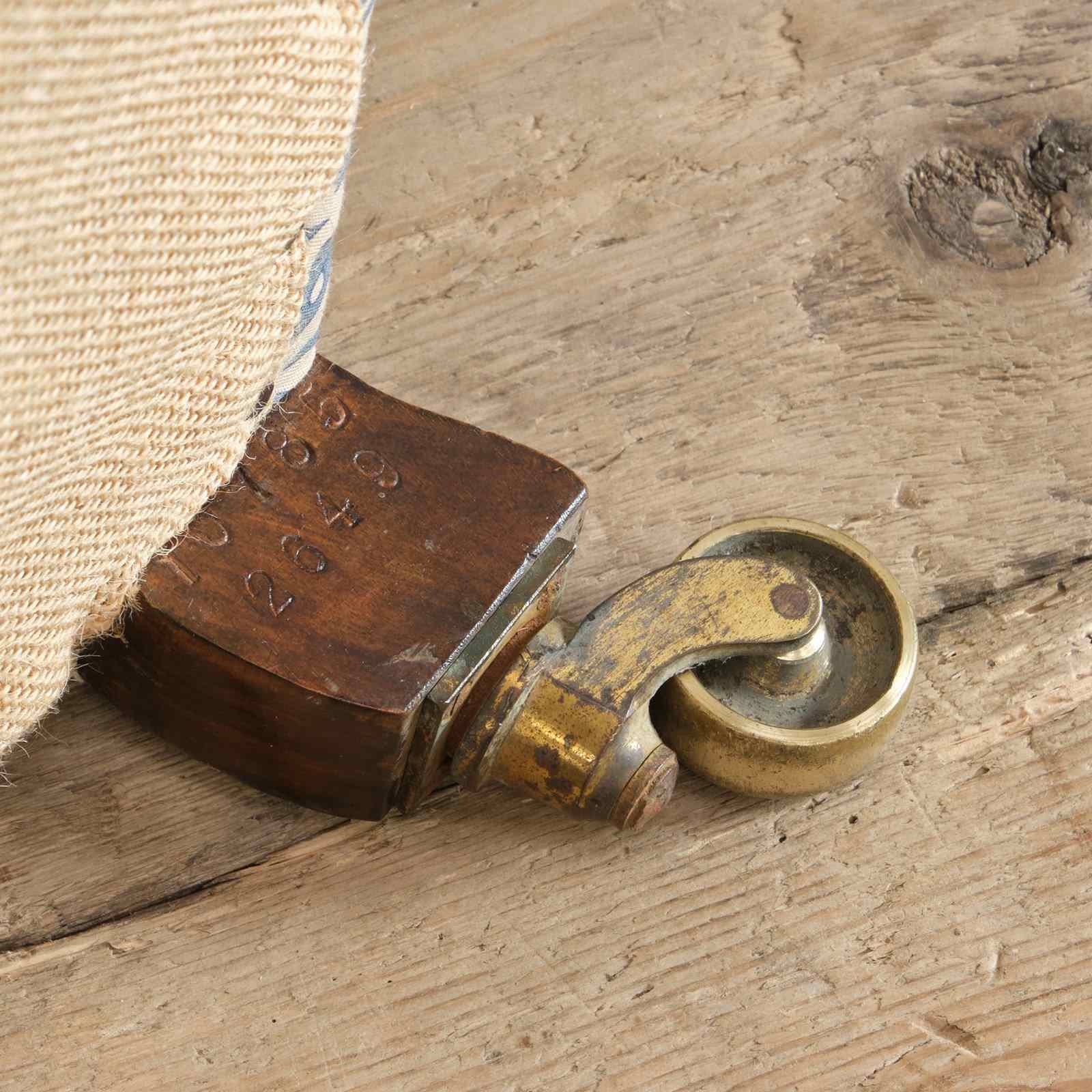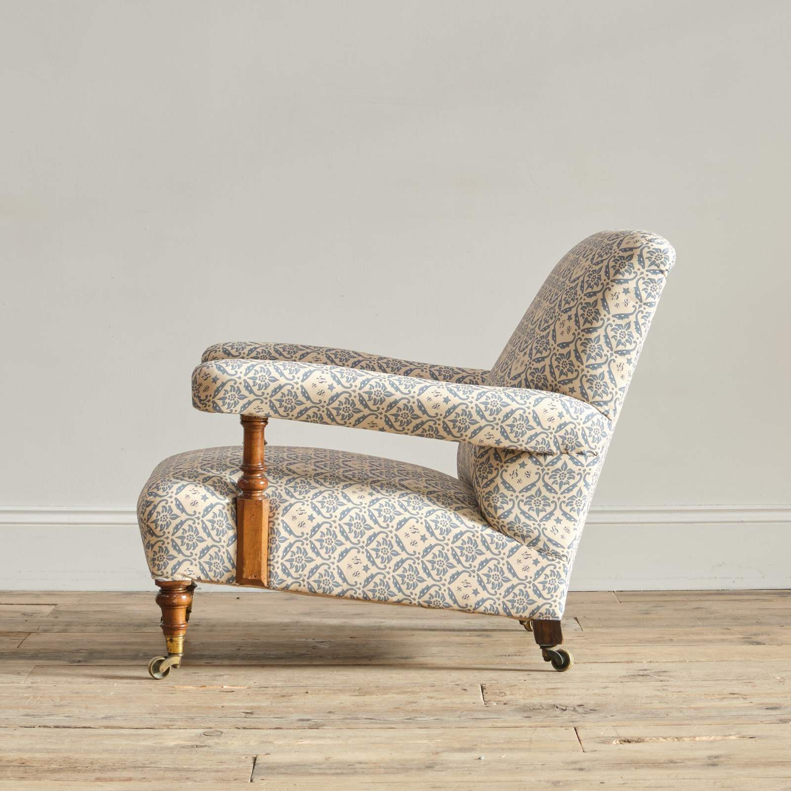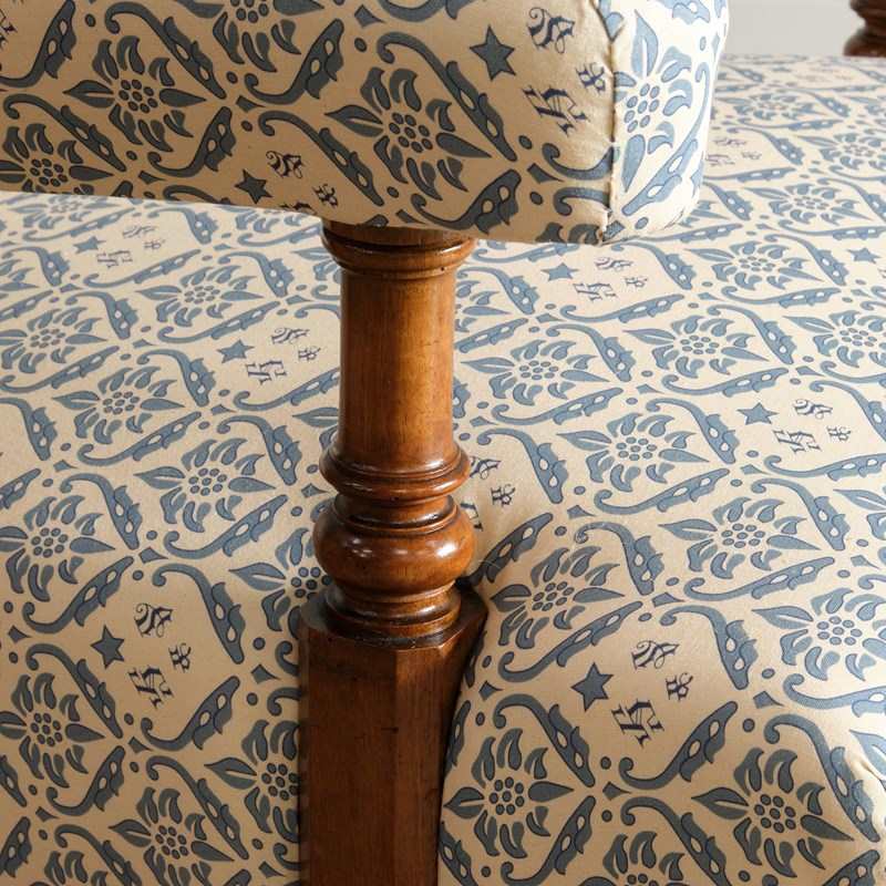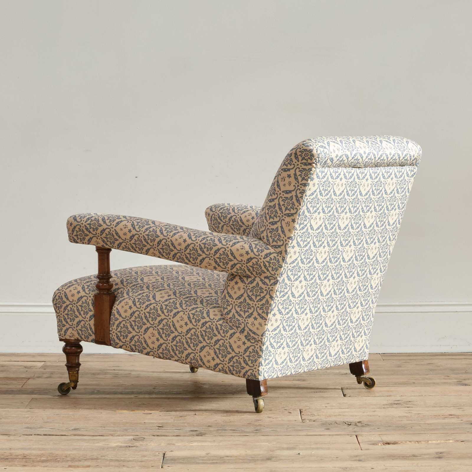 The chair has been fully restored by us from the frame up with brand new seat springs and we have reused the original fillings where possible. It has been covered in a reproduction of the blue and white H&S printed cotton lining ready to be used as is or for you choice of top covering.