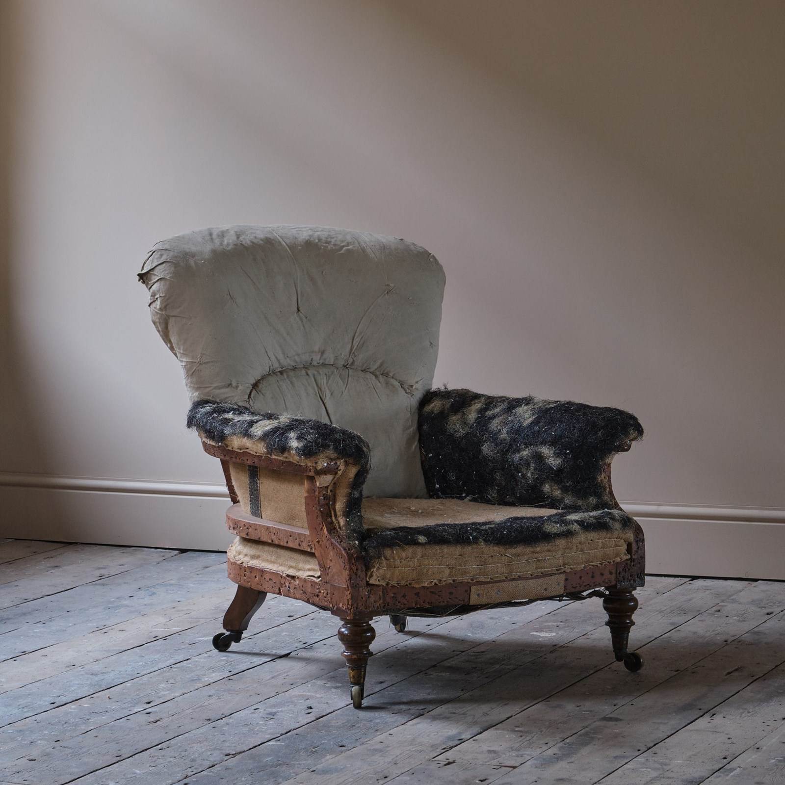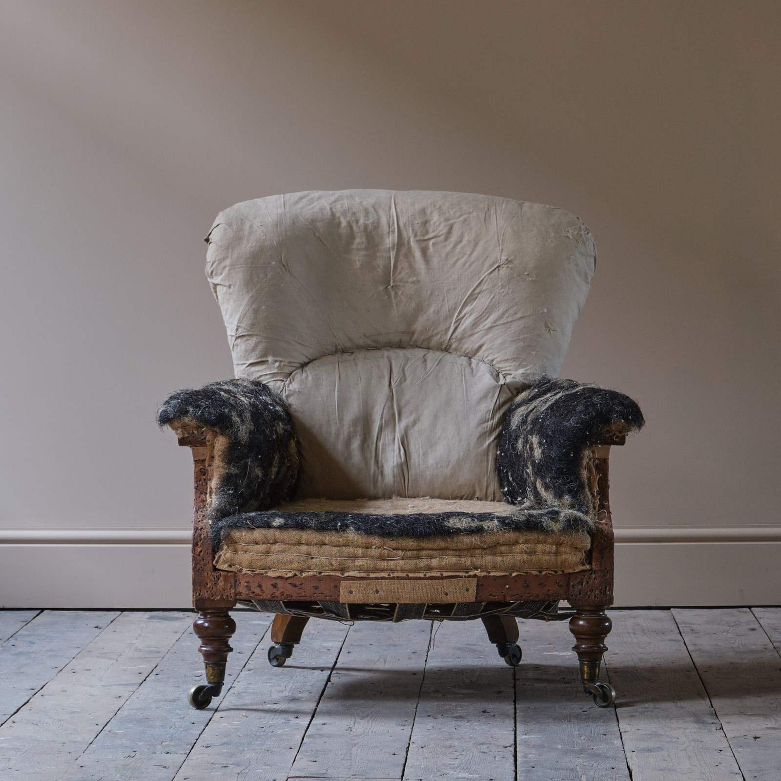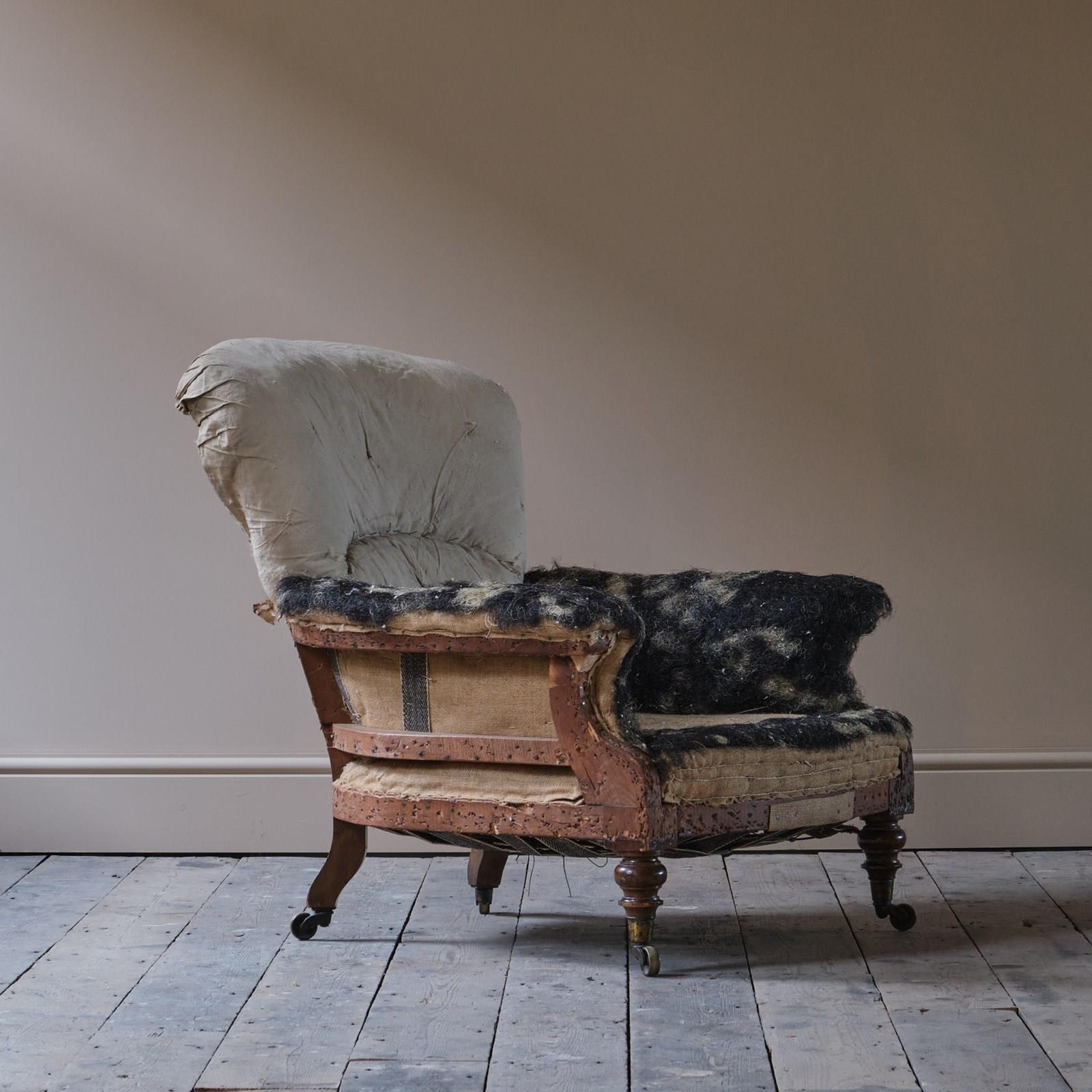 An early Howard & Sons deep seated country house armchair. Raised on Howards typical turned walnut front legs and splayed rear legs all with the original Cope & Collinson brass casters. The left back leg bearing the numerical serial number.
