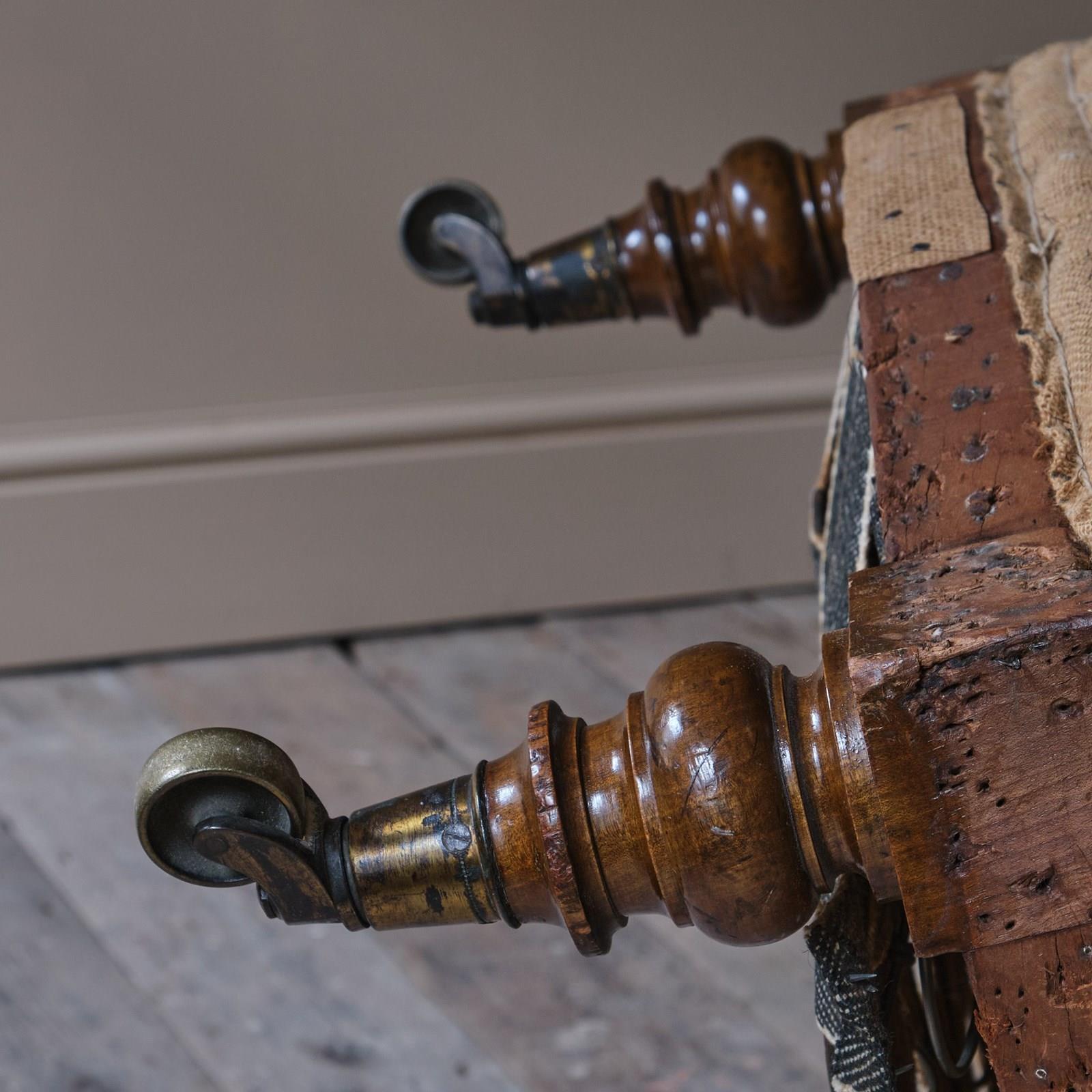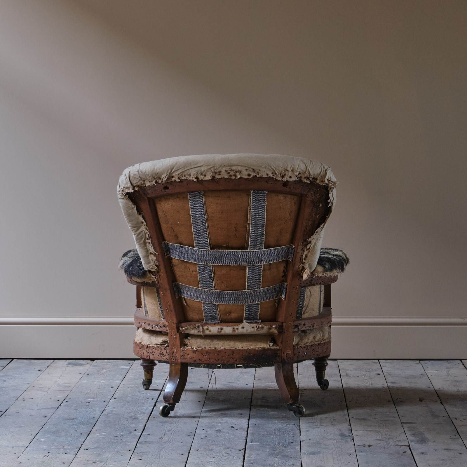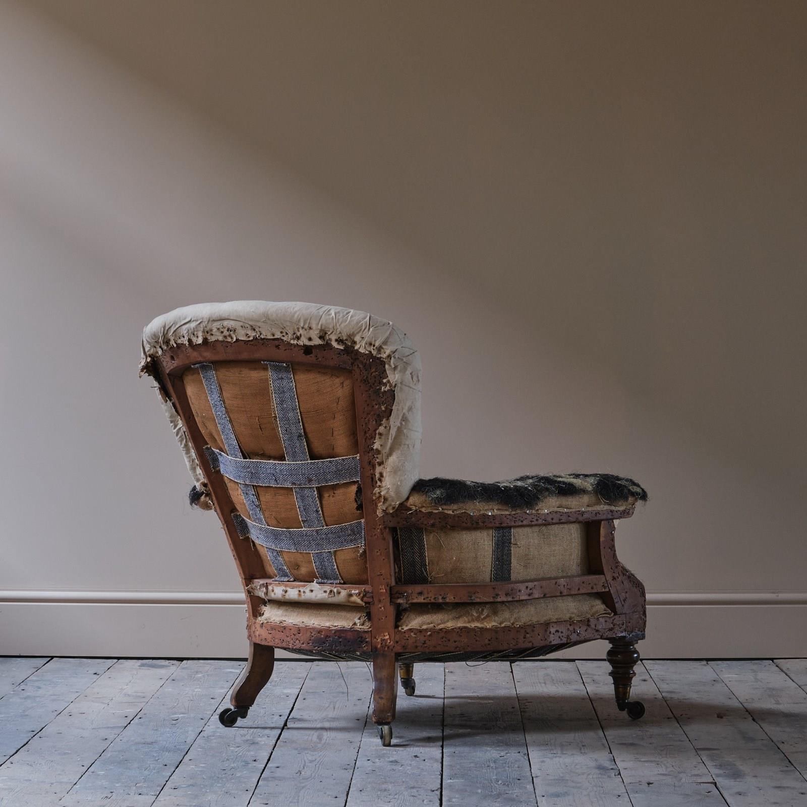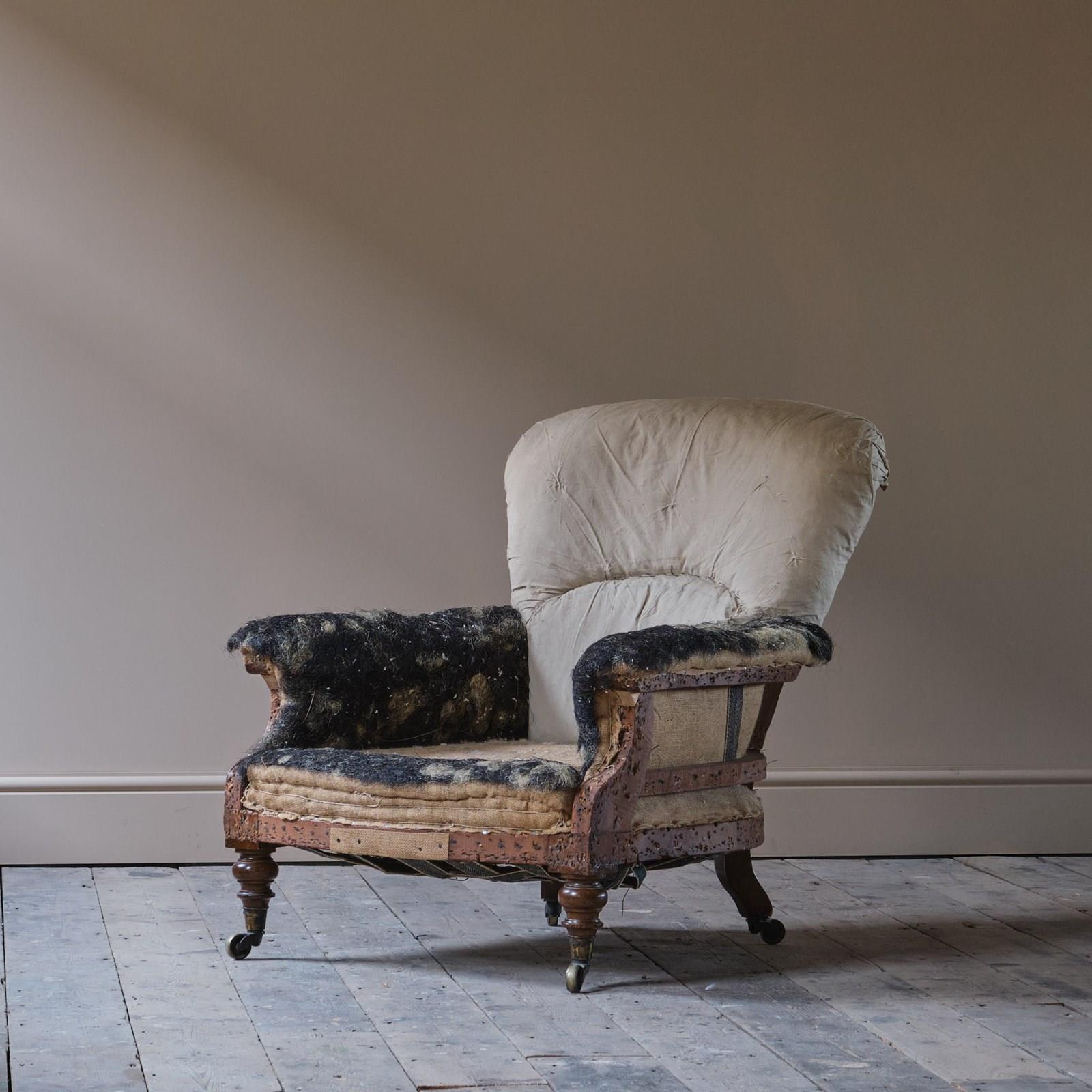 An early Howard & Sons deep seated country house armchair. Raised on Howards typical turned walnut front legs and splayed rear legs all with the original Cope & Collinson brass casters. The left back leg bearing the numerical serial number.
