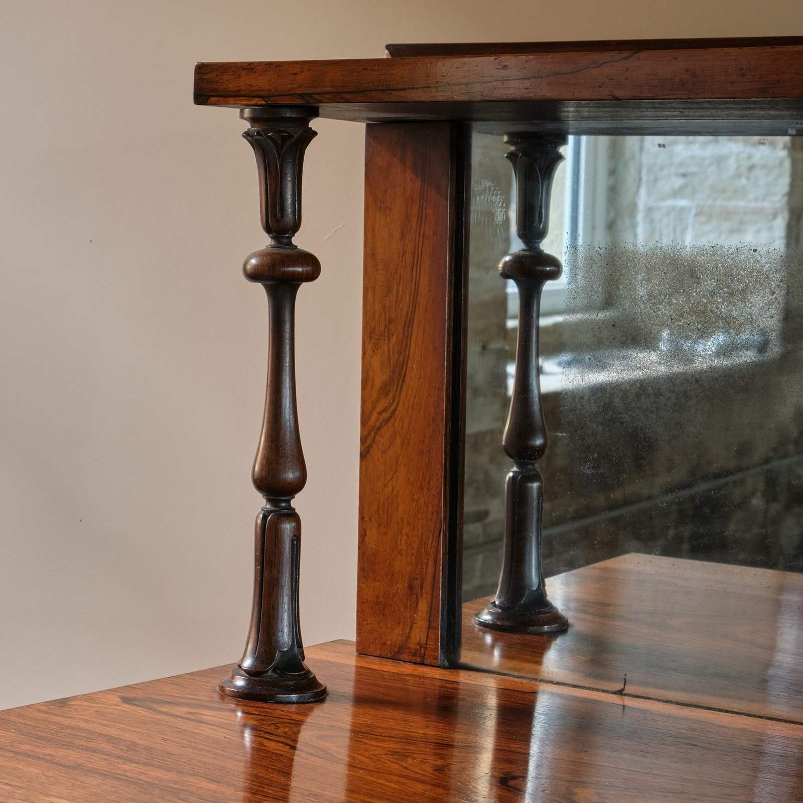 The raised back has an inset foxed mirror and decorative turned spindle supports with Acanthus leaf design to the top and bottom..