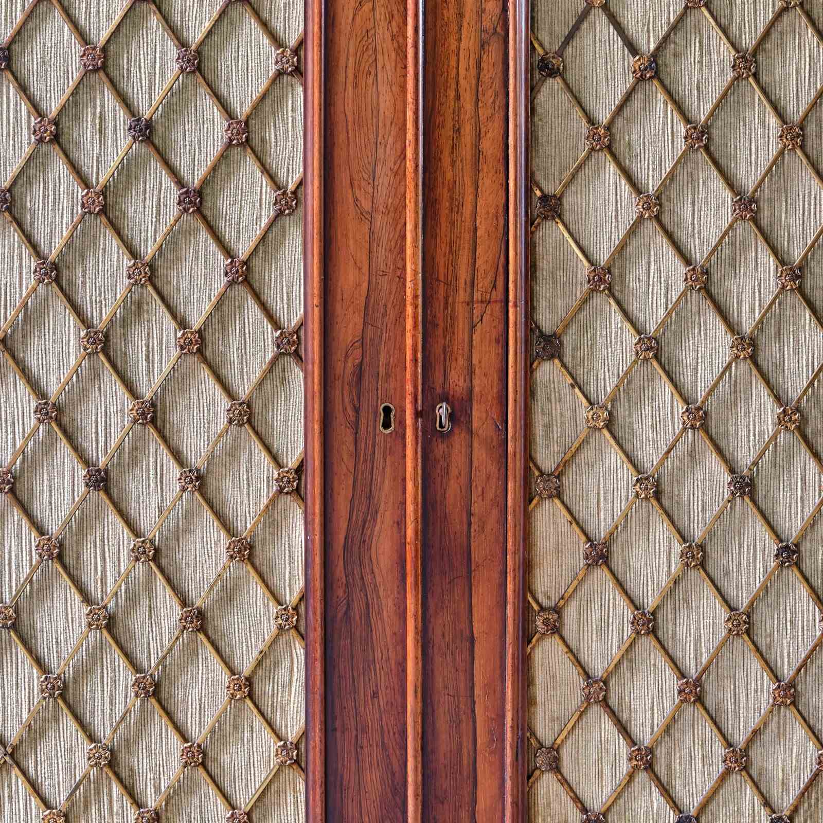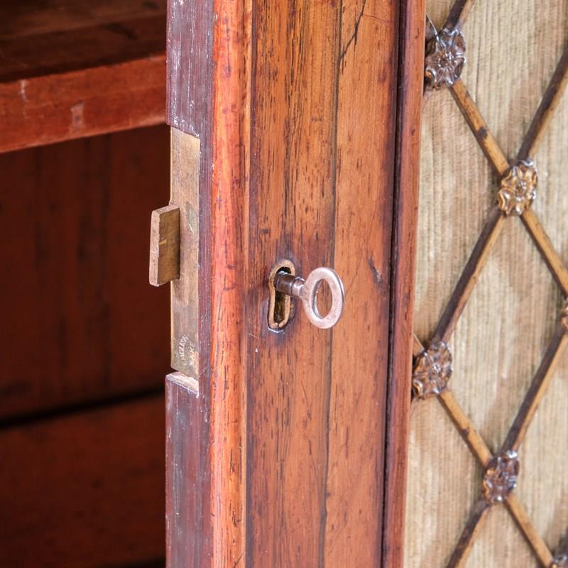 The cabernet doors have Original Diamond brass grilles with rose joints over the pleated silk panels. Retaining the original lock and key.