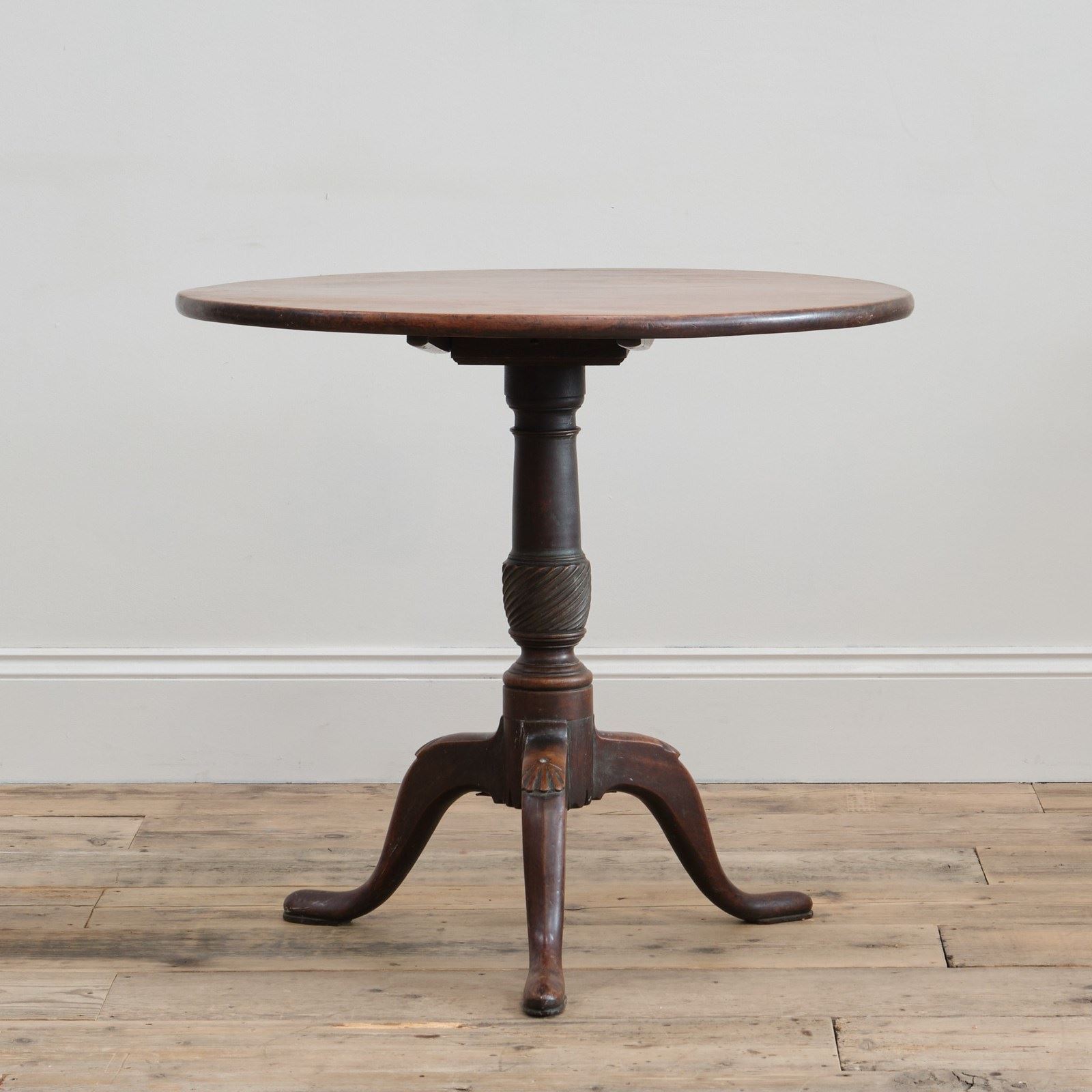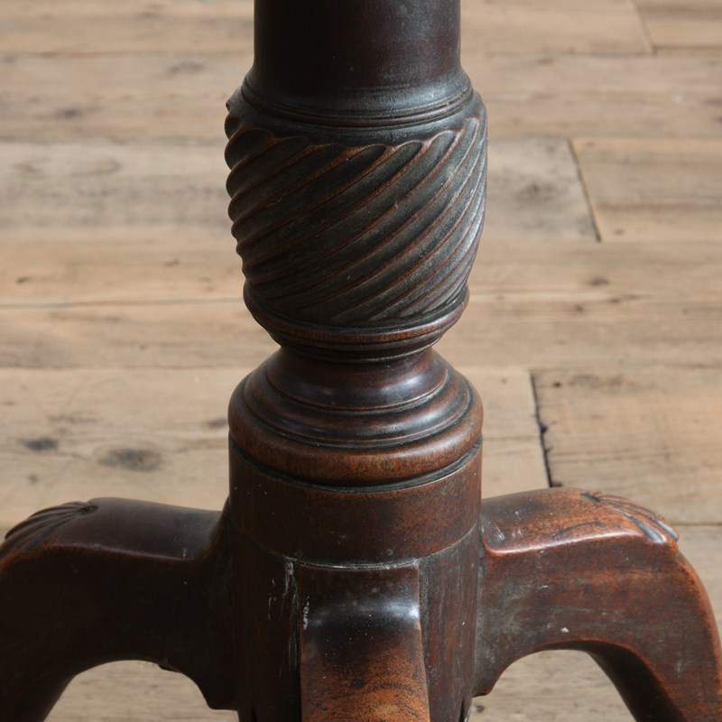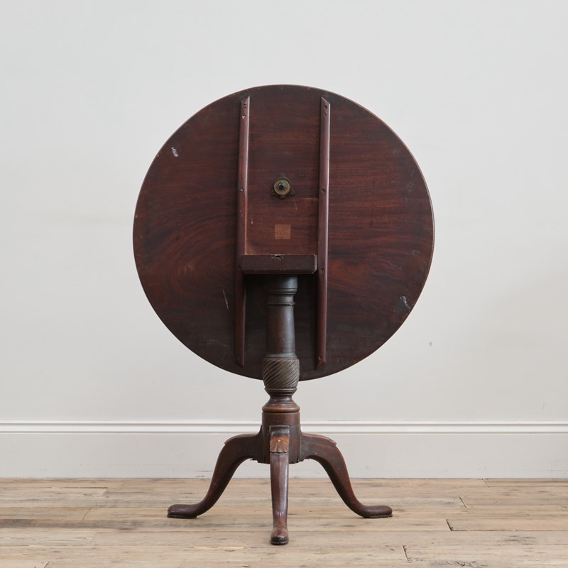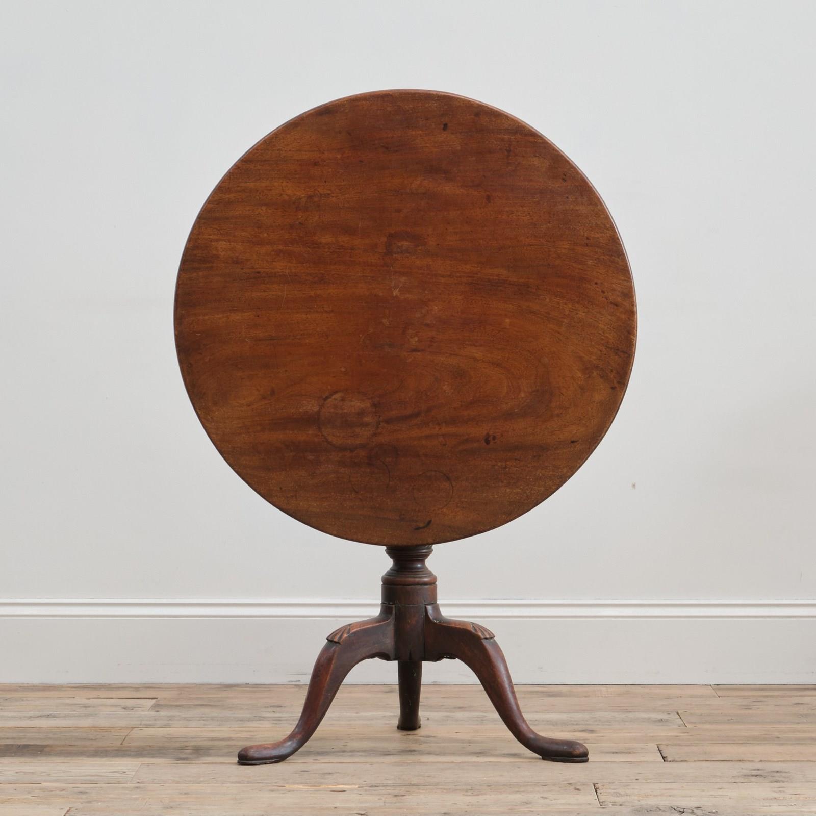 A late 18th century mahogany tilt top table. The single piece mahogany top over a thick turned support raised on 3 decorative cabriole legs with pad feet. In good original condition with a beautiful time worn patina throughout.