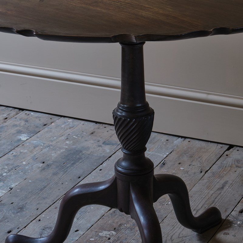 A Georgian Mahogany pie crust tilt top table. Raised on cabriole legs and turned column. The whole with a good colour and patina. English c1780