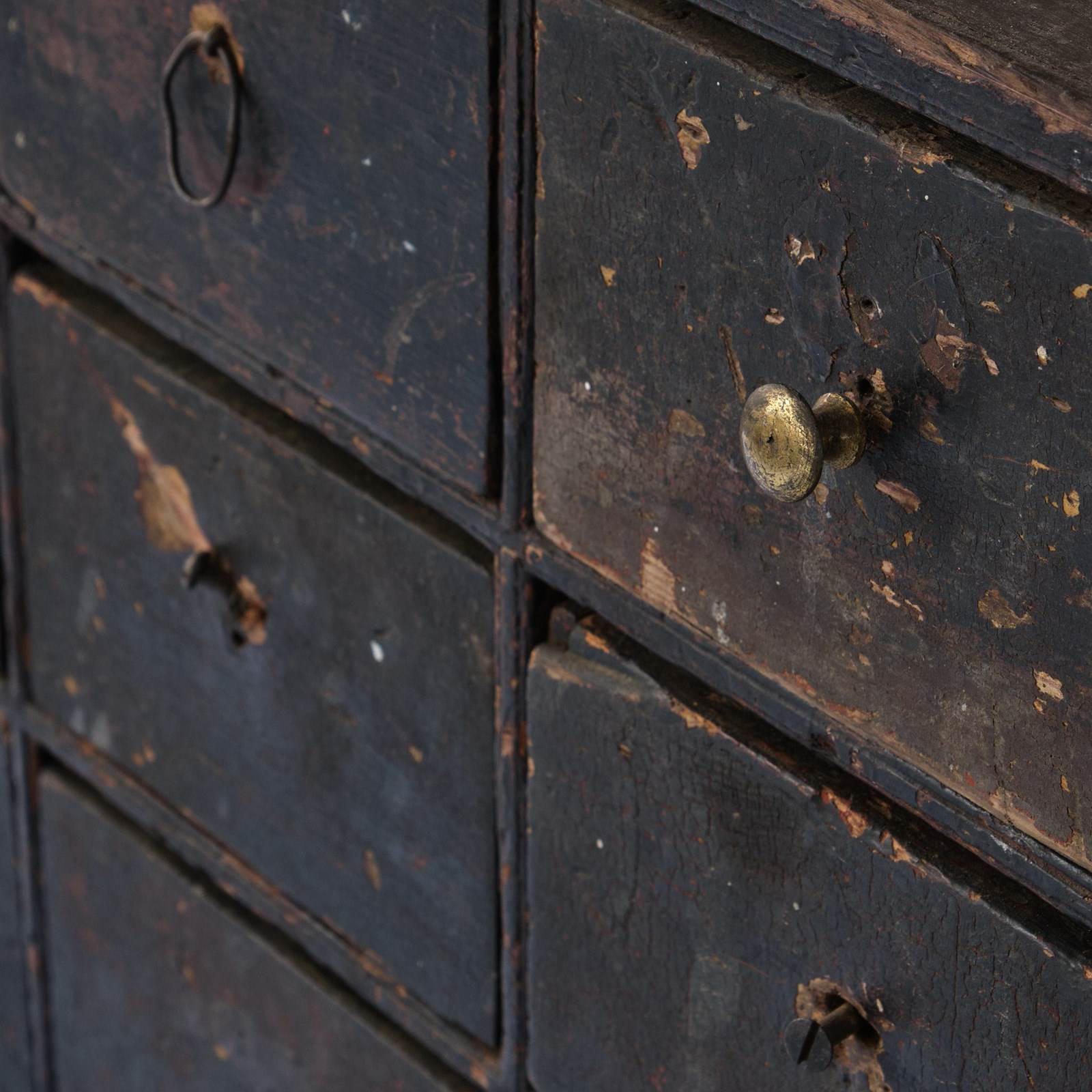 A small early 19th century Georgian pine bank of 40 drawers with a mix of odd make do and mend drawer handles in the form of screws, twisted wire and possible the odd original brass handles.