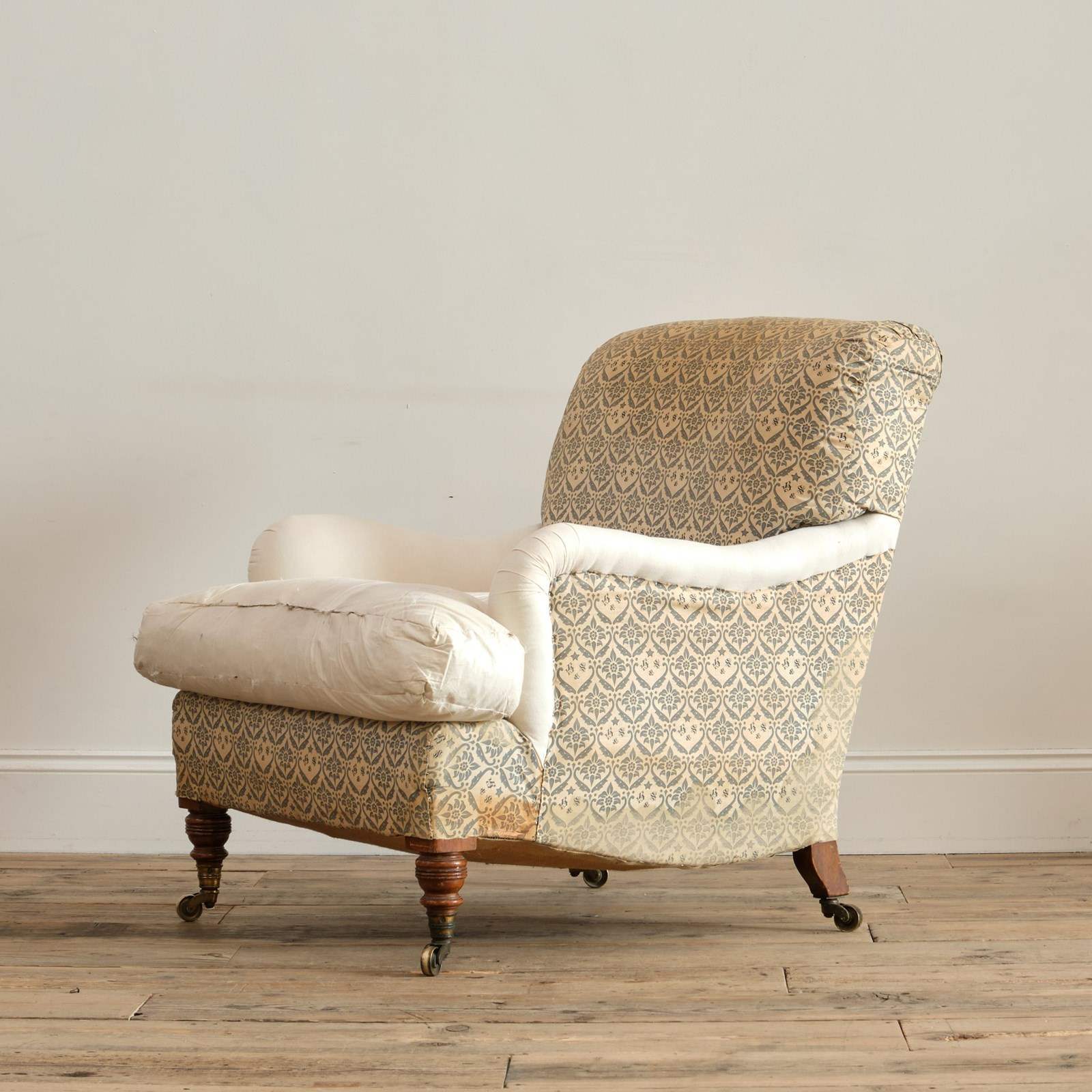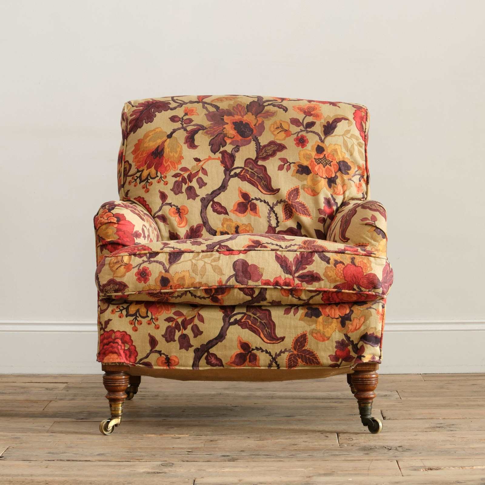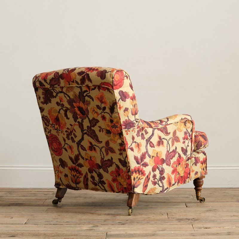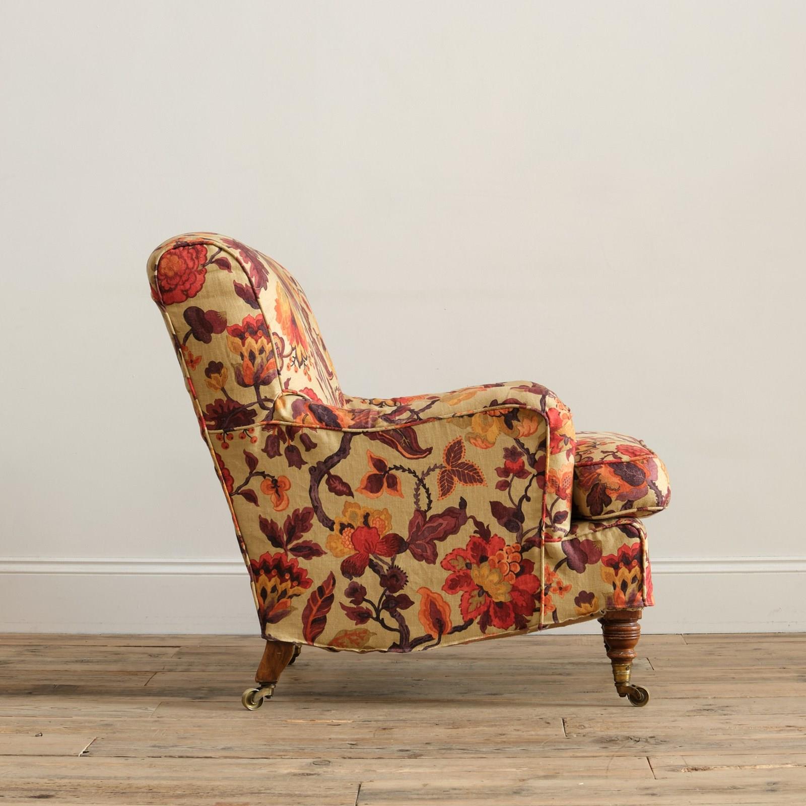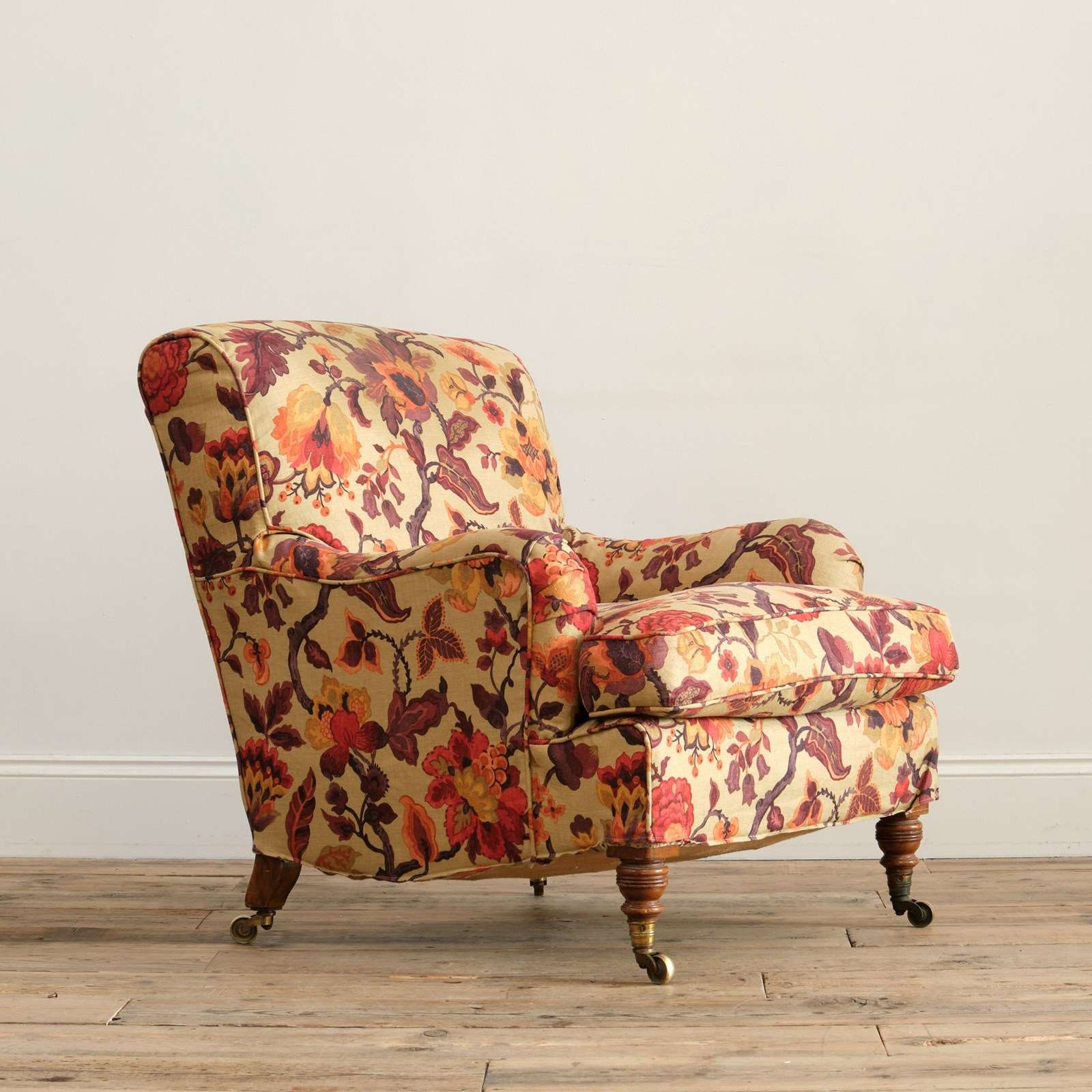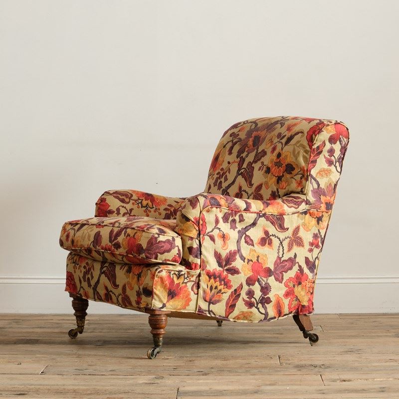 The chair retains much of its original Howard printed lining beneath the attractive floral linen slip cover and is super comfortable which is why we have decided to not restore the chair and sell in 'as found' country house condition.