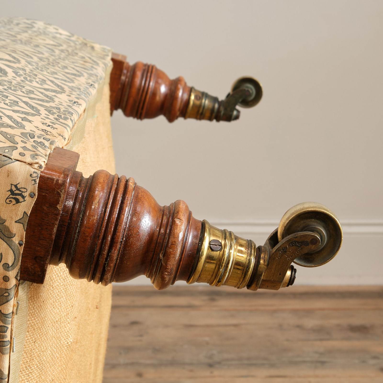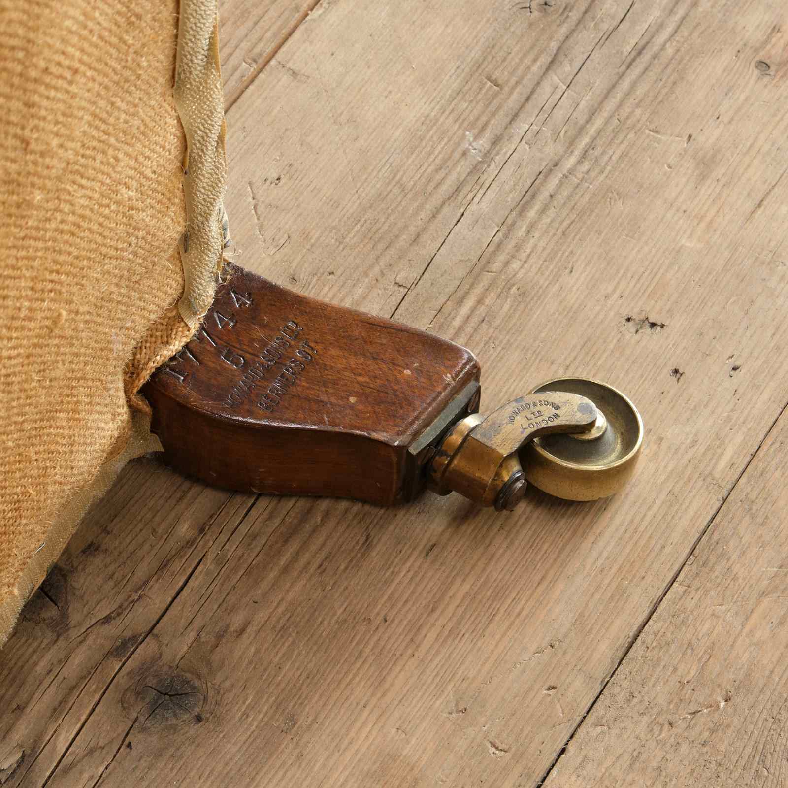 An early 19th century country Bridgewater armchair by Howard and sons - London c1900. Raised on turned walnut front legs with splayed rear legs and all retaining the original Howard stamped casters. The rear left leg bears the makers stamp.