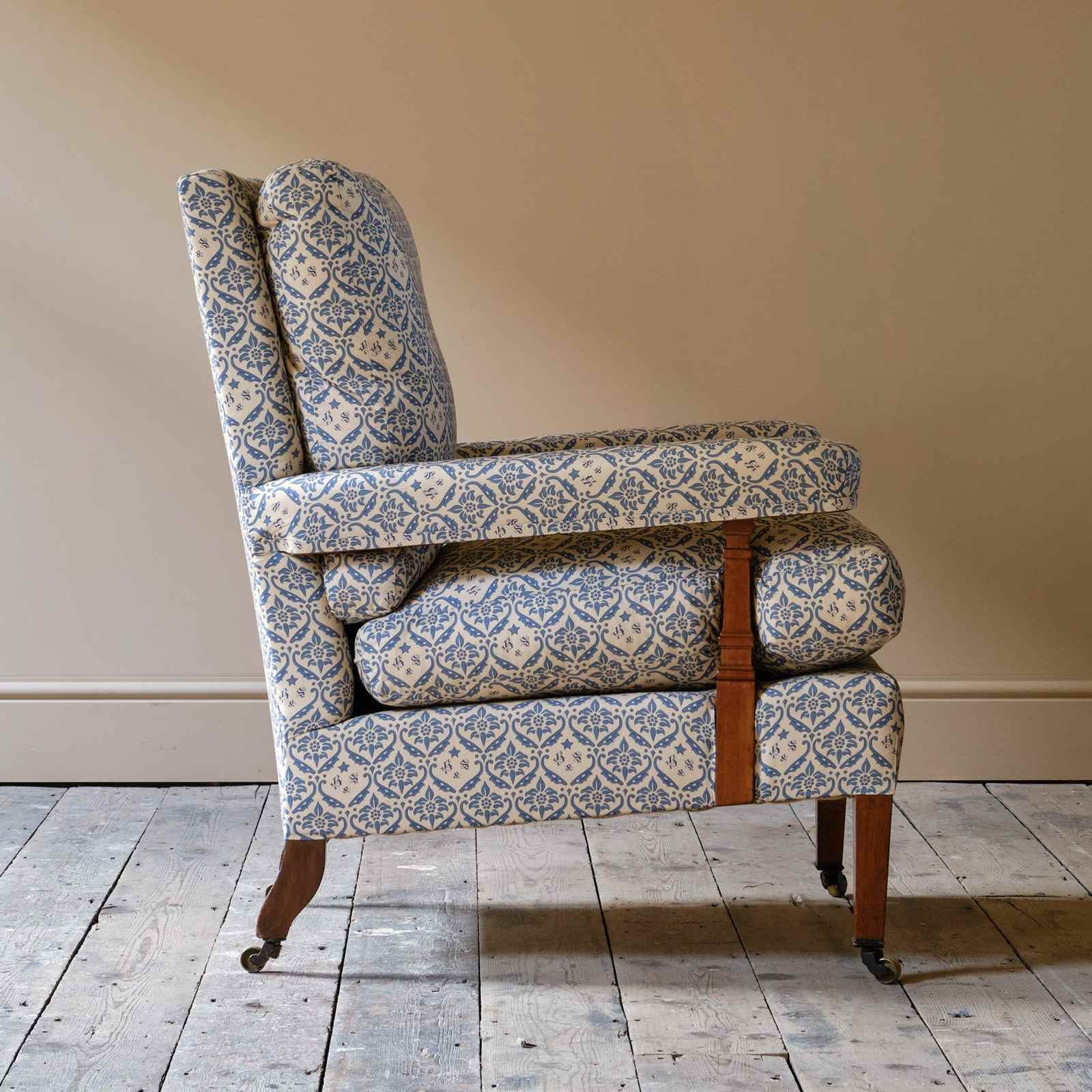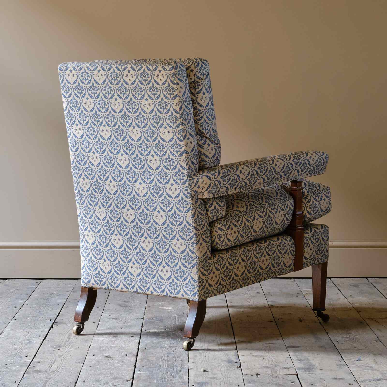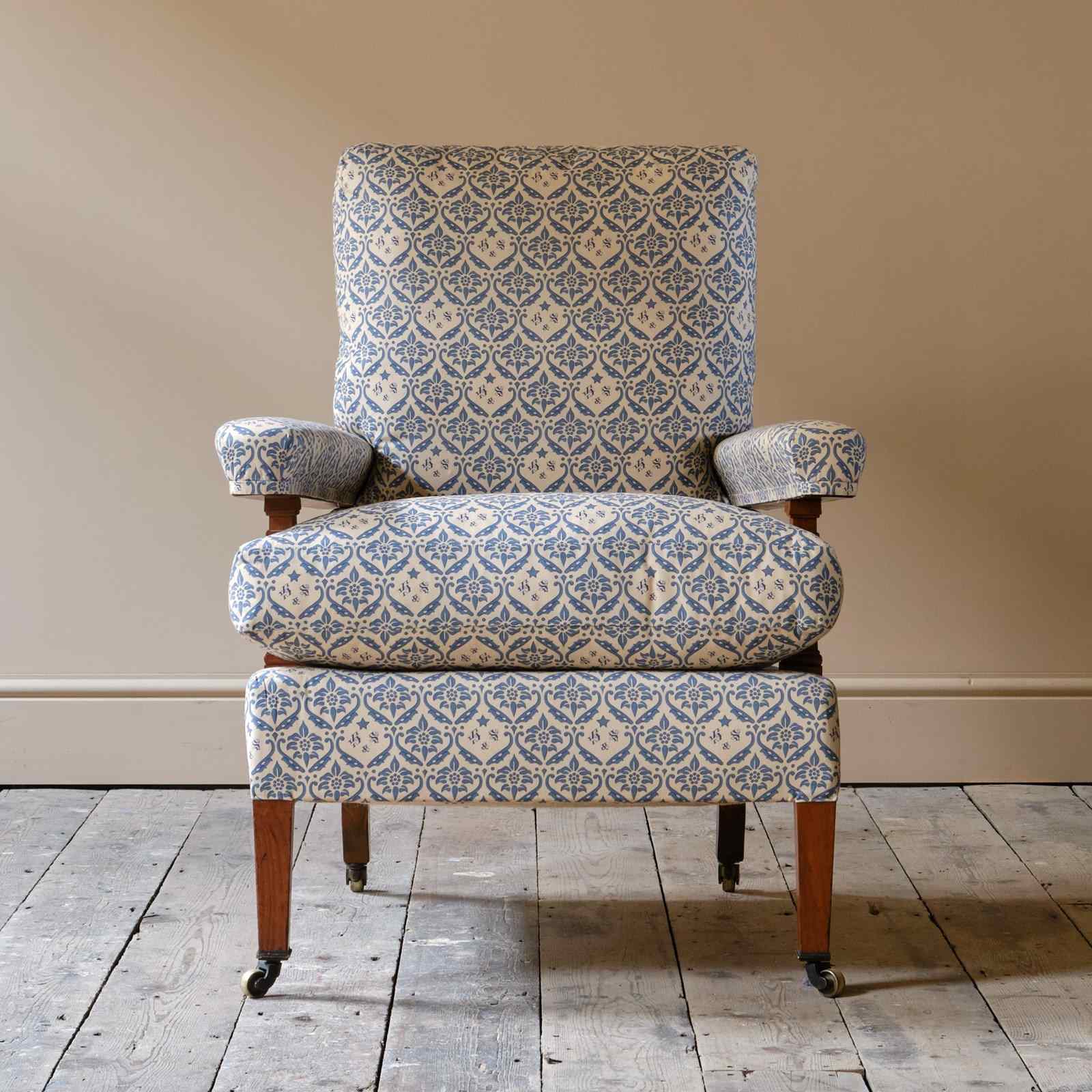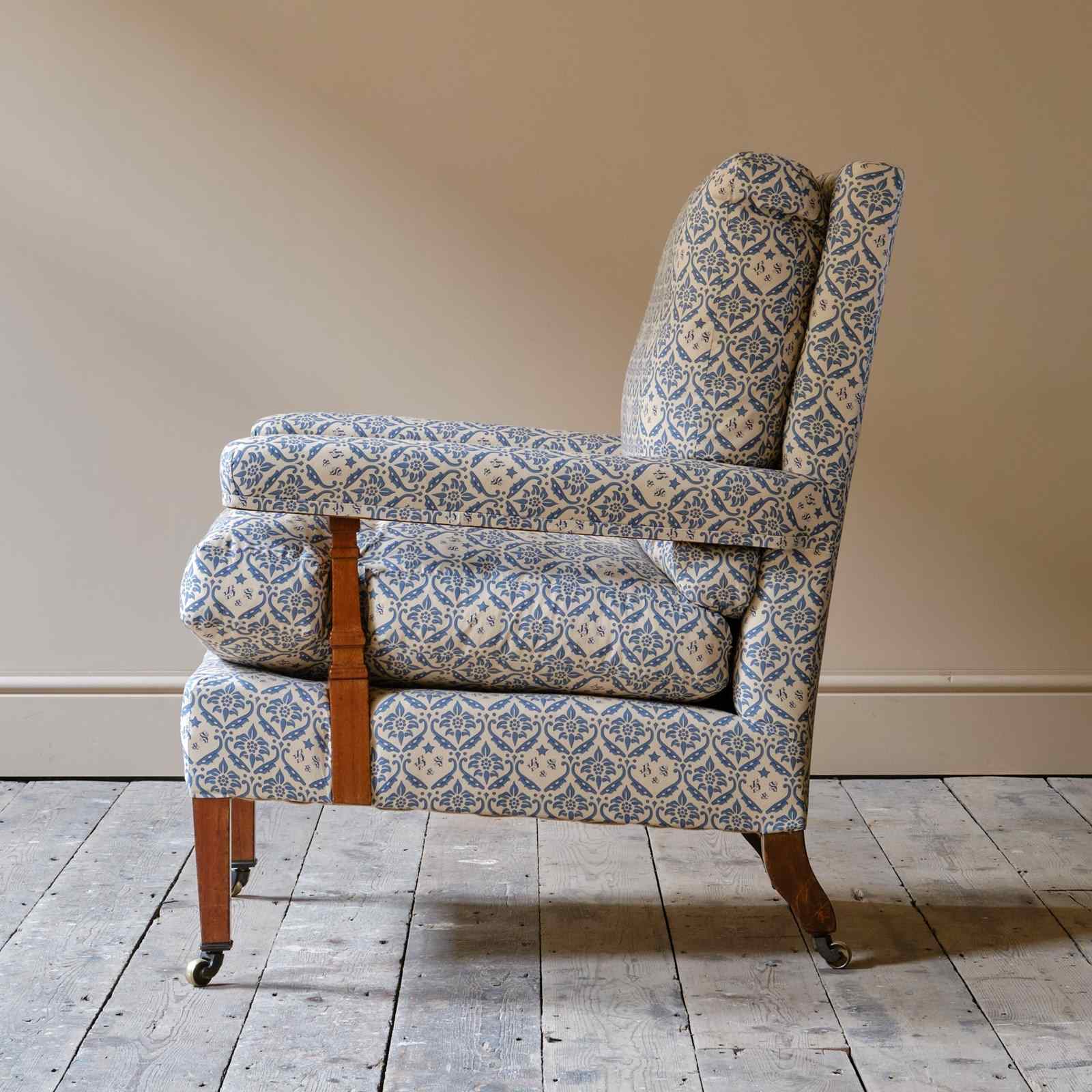 A wonderful early 20th century Howard & Sons open armchair. Raised on walnut legs and unusual square arm supports. All legs retaining the original Howard casters.