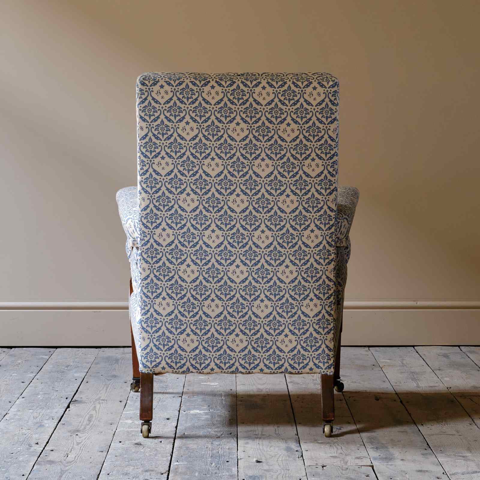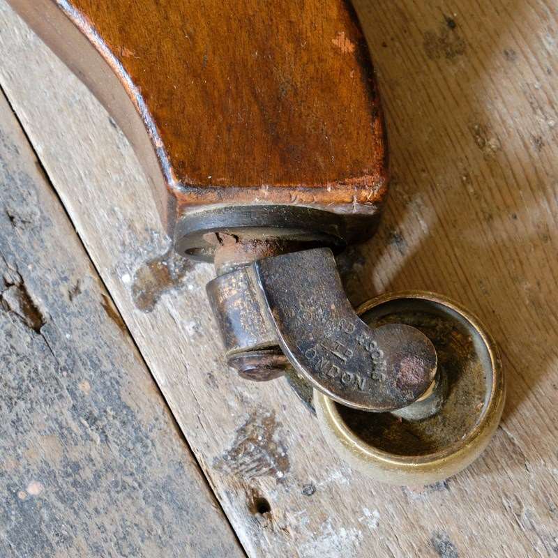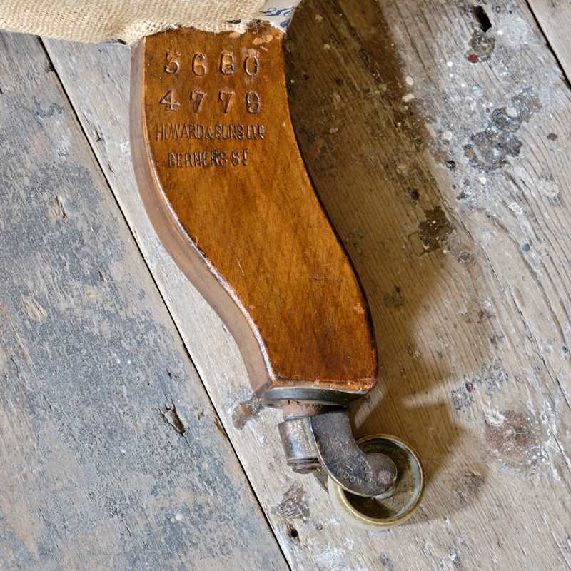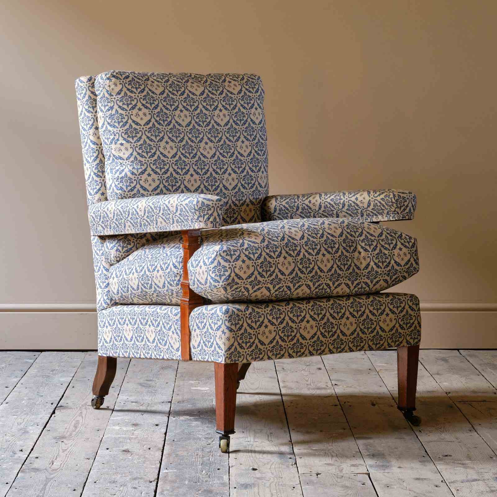 A wonderful early 20th century Howard & Sons open armchair. Raised on walnut legs and unusual square arm supports. All legs retaining the original Howard casters.