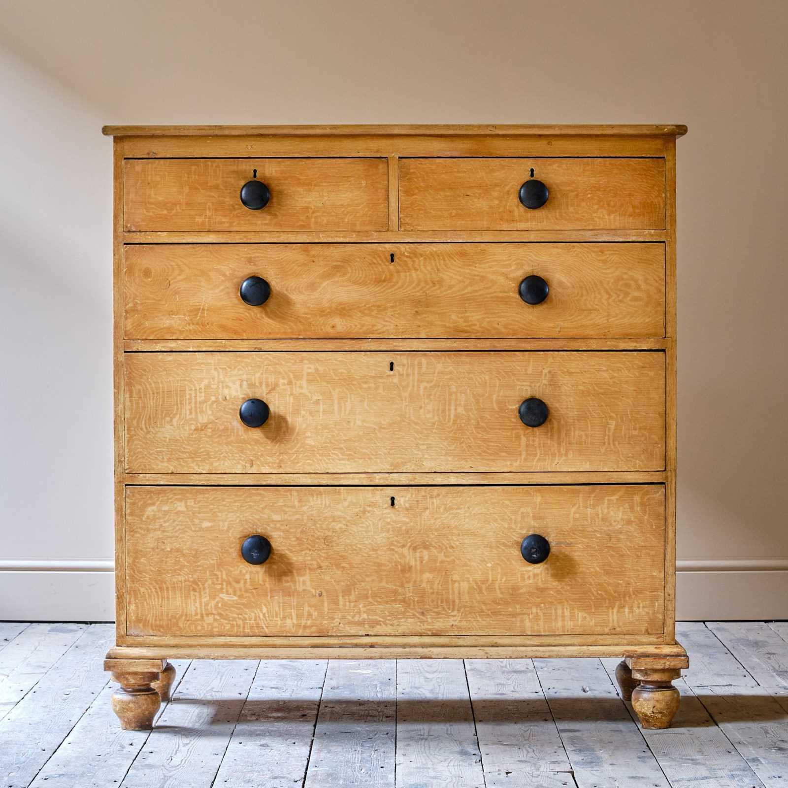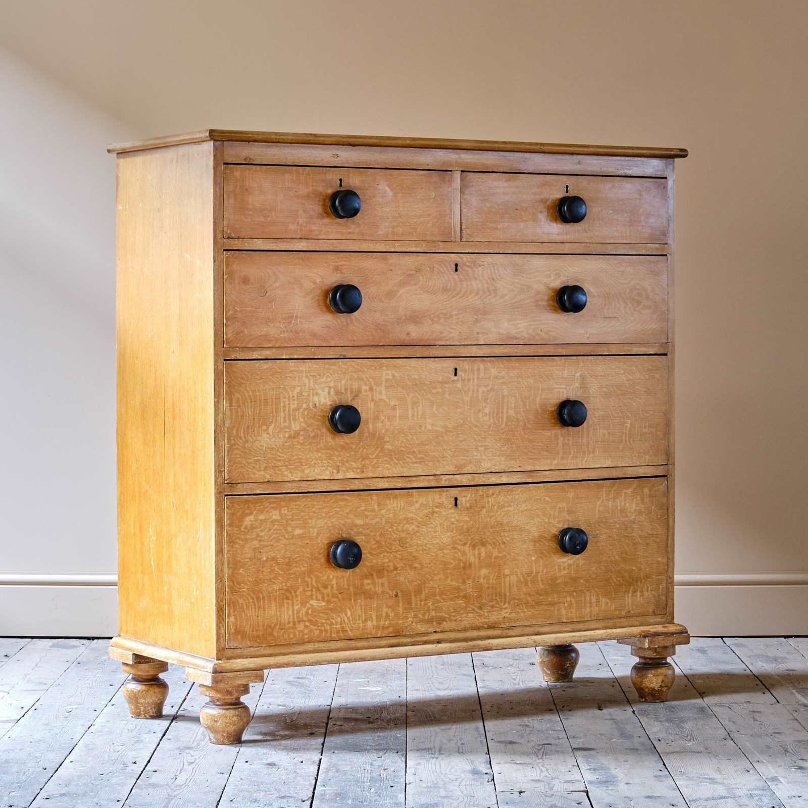 A large 19th Century Pine chest of drawers in the original simulated oak paint. Two short drawers over 3 long graduated drawers. Raised on turned feet and the drawers with the original ebonized handles.