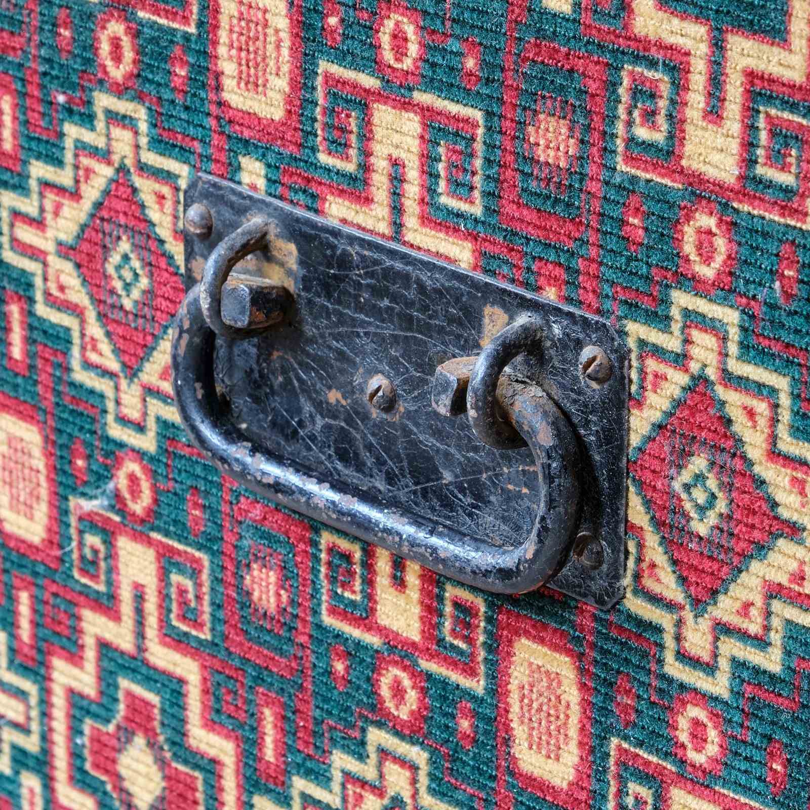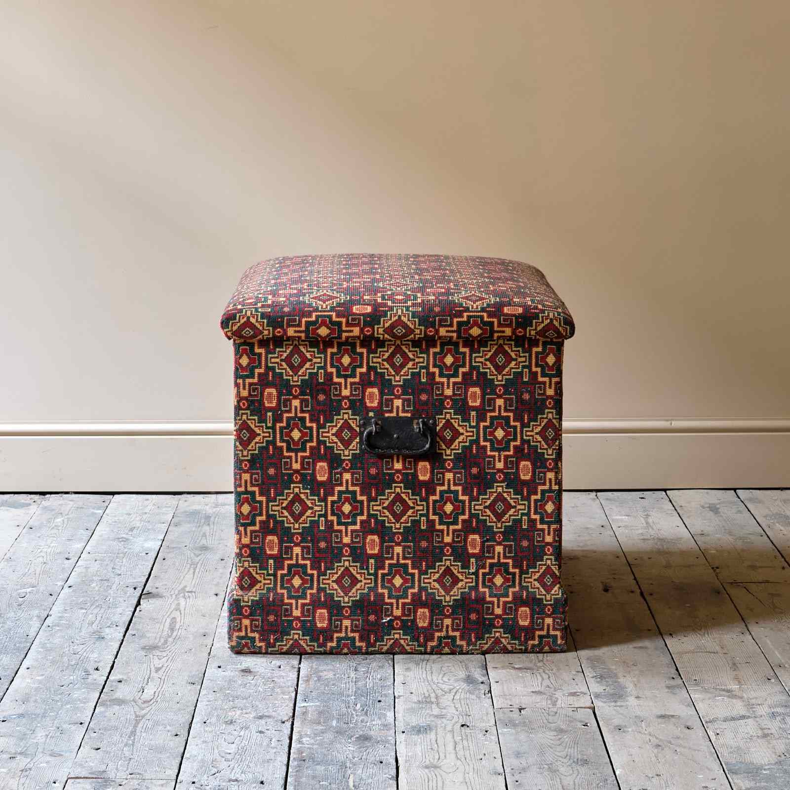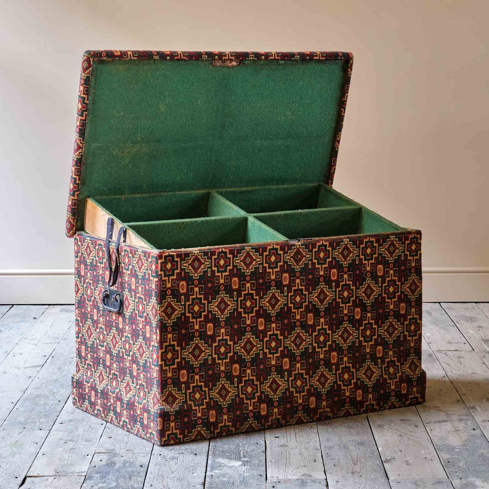 A large 19th century pine storage box in later thick carpet type material and a green baize lined interior with compartmental storage bays. The main body of the box with iron carry handles and the top with horsehair upholstery.