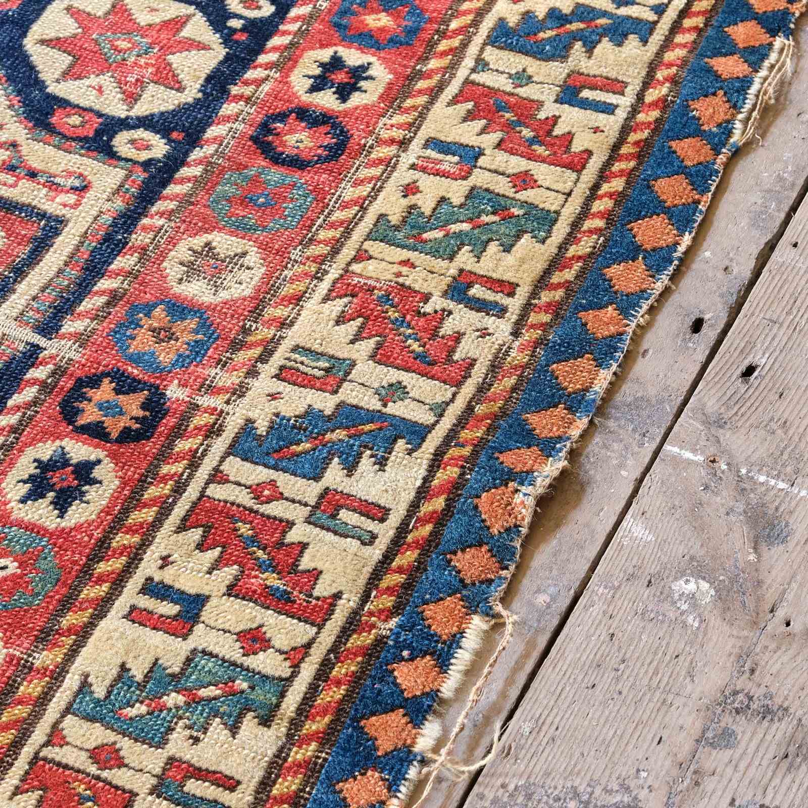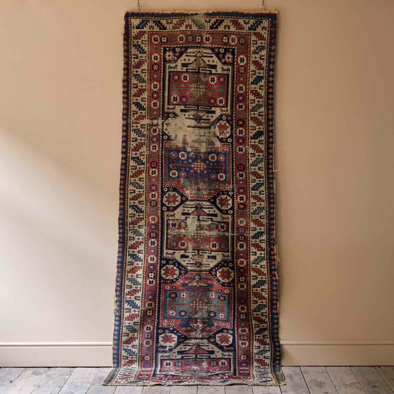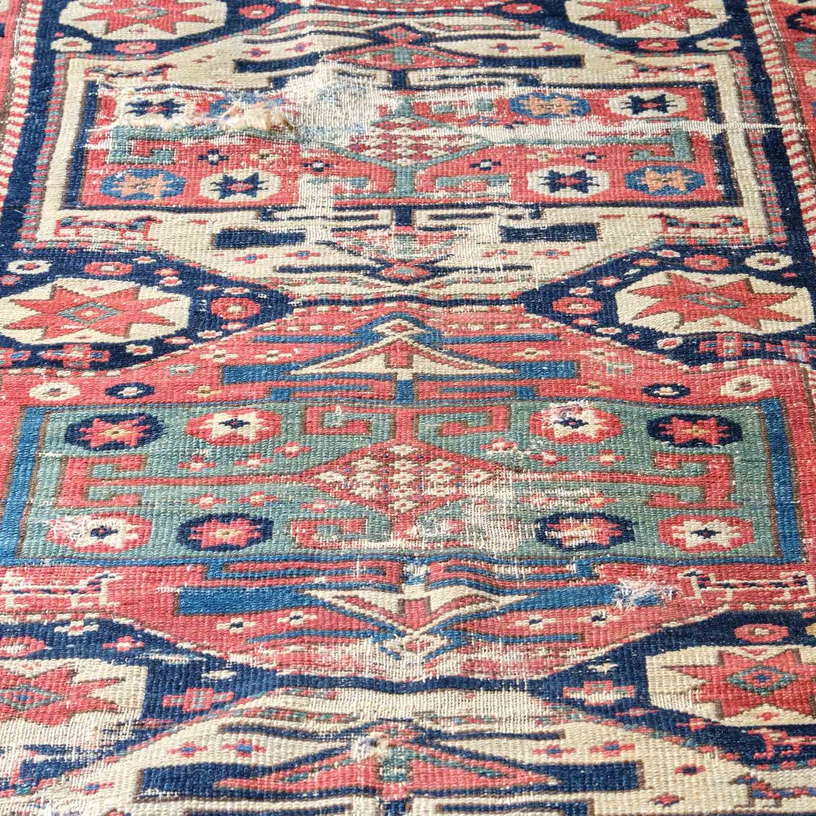 An attractively worn antique Kazak rug. In worn and crooked condition with a few Threadbare areas, holes and plenty of wear.