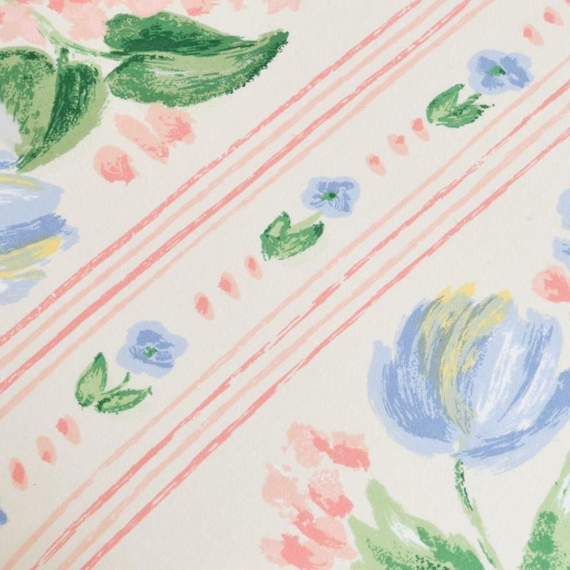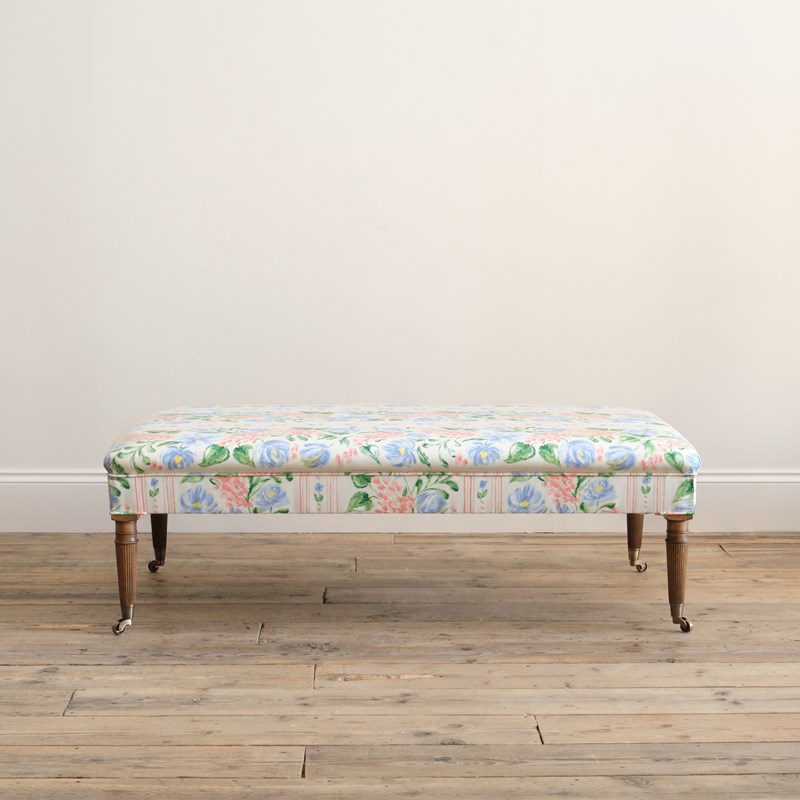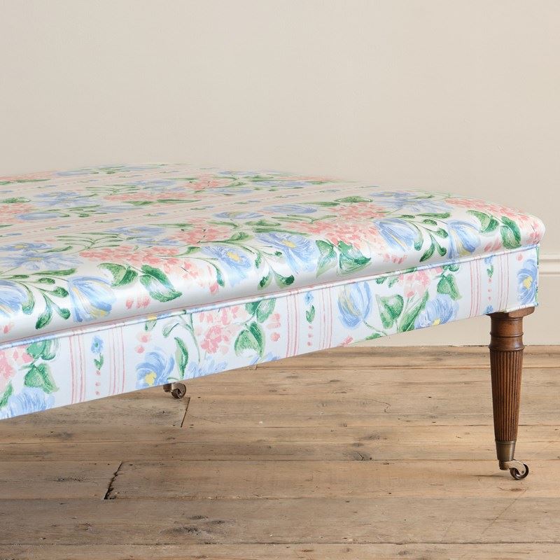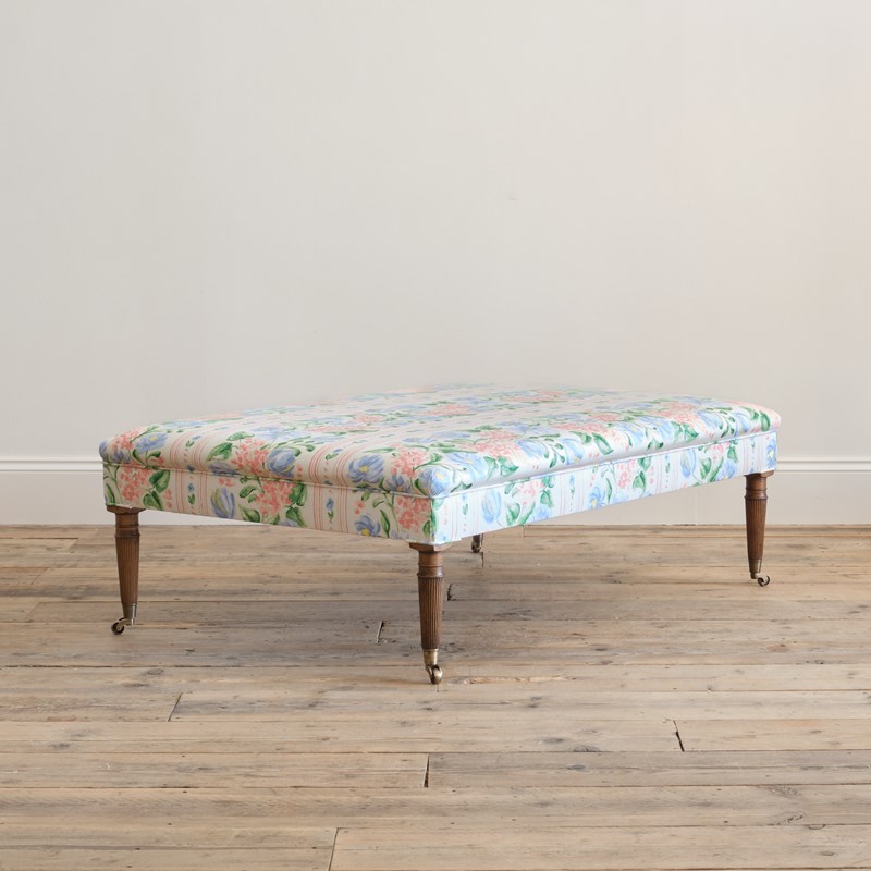 A large country house inspired footstool. Upholstered glazed floral chintz cotton. Raised on turned beech and reeded legs and casters.