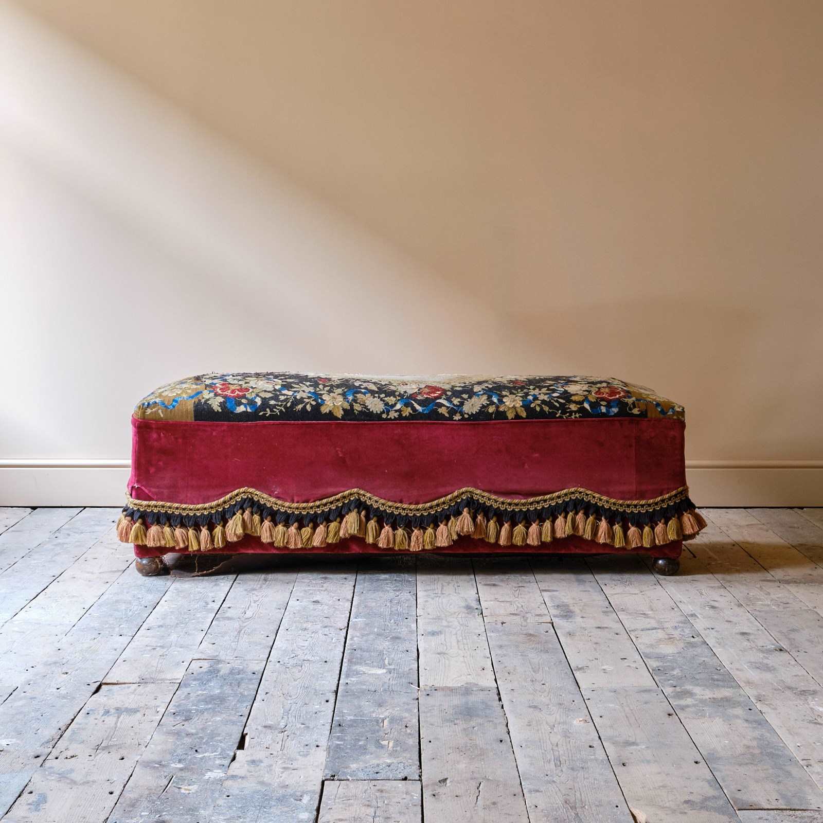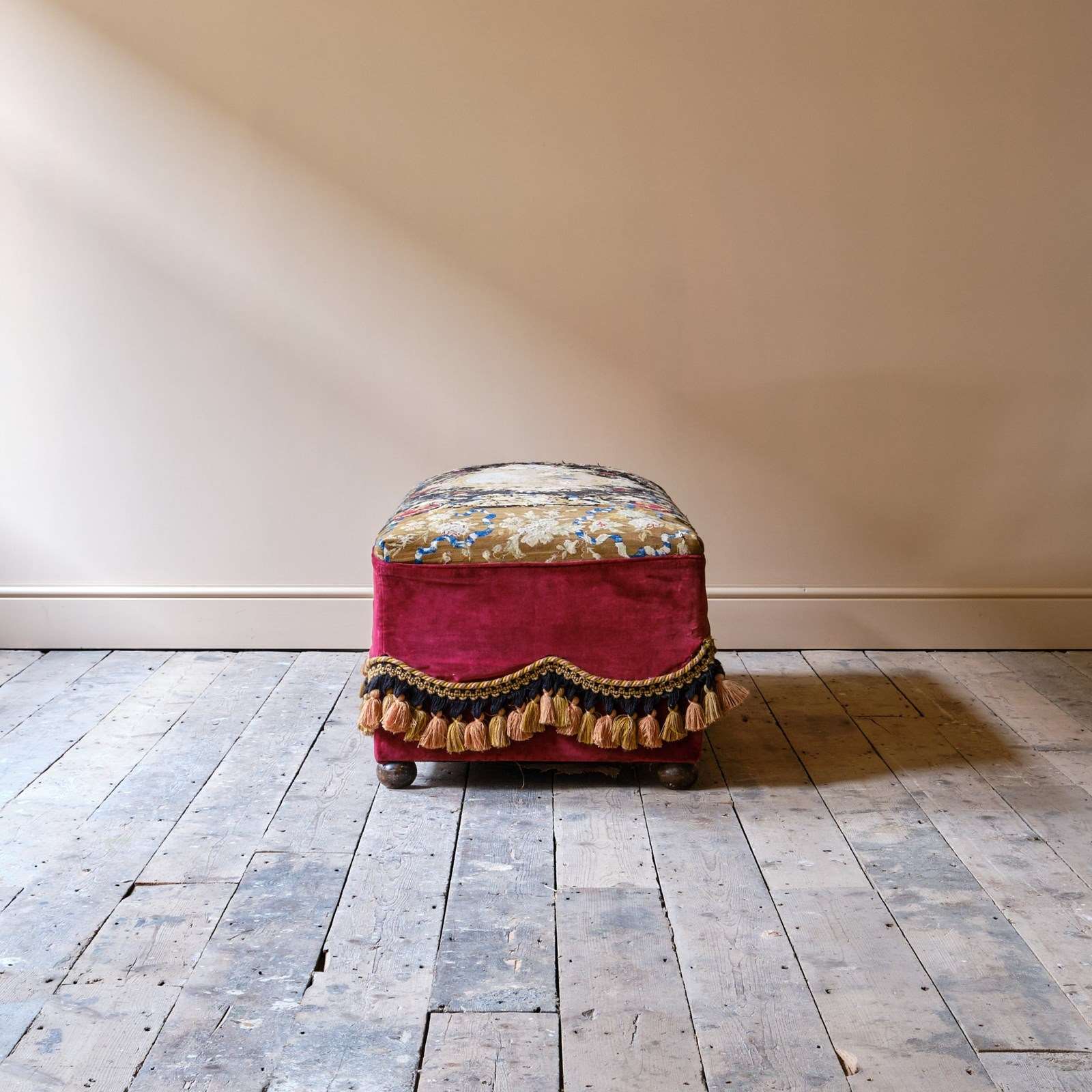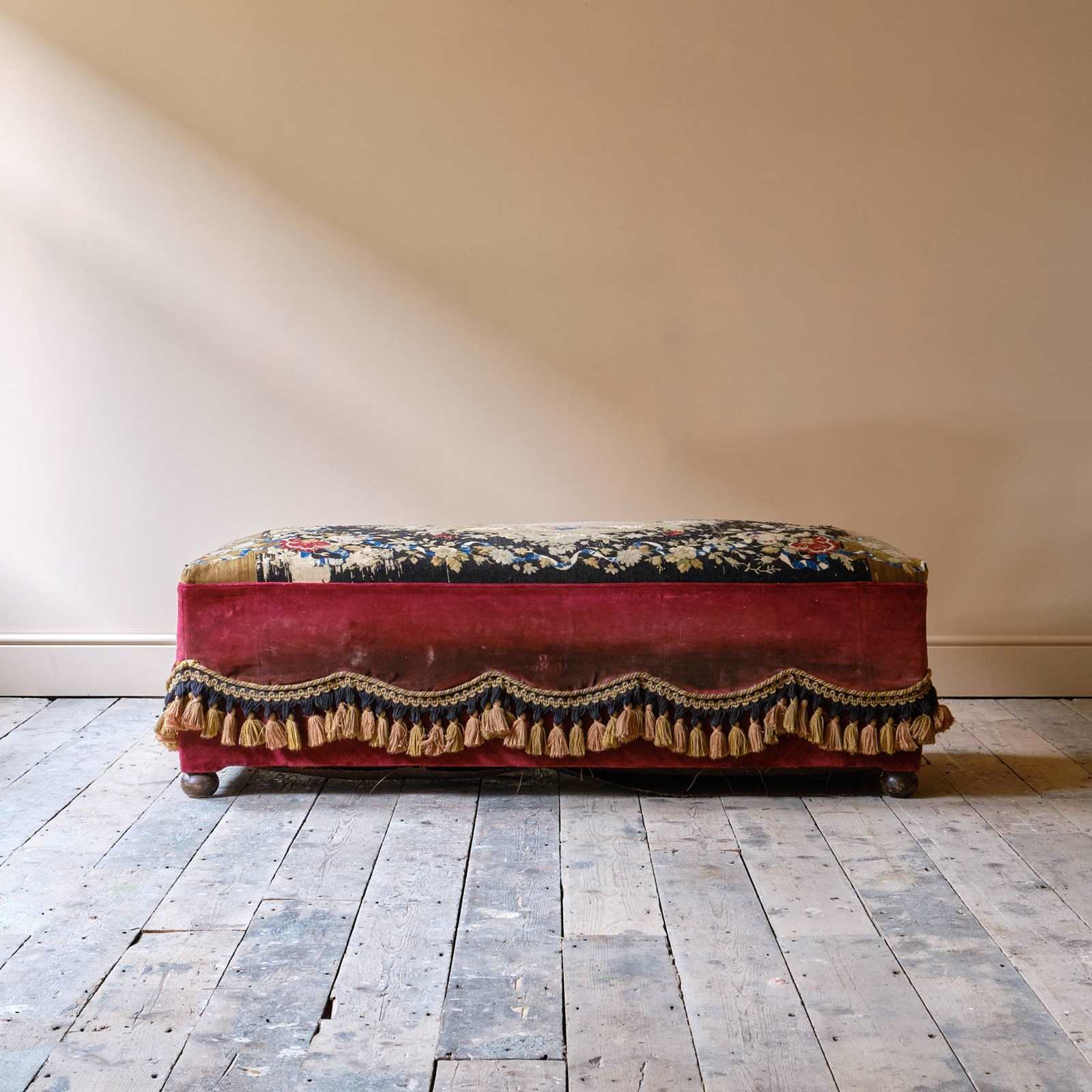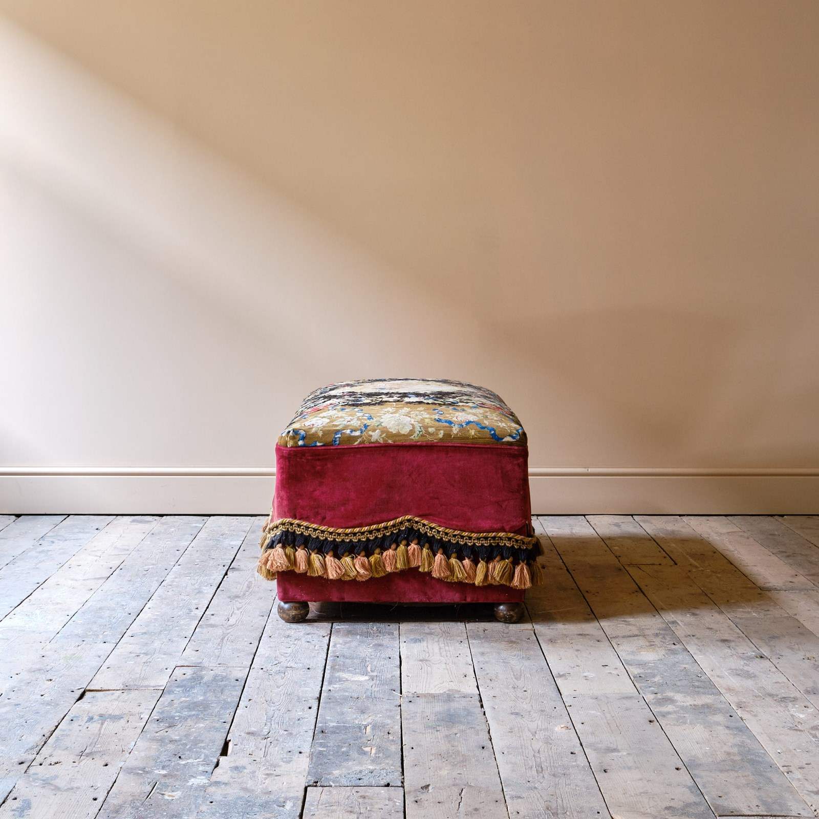 The needlework top and draped red velvet sides with tasselled trim make up a removable top covering that covers the lid which has a nice soft sprung interior.