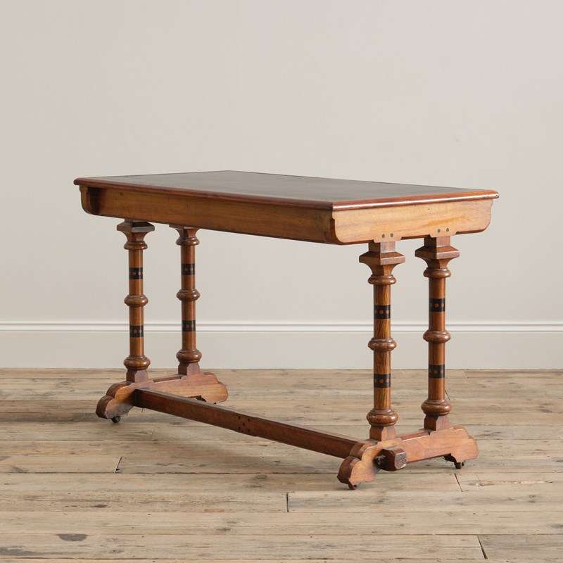 Raised on a chamfered base and turned supports with ebony inlay and joined by a central chamfered stretcher. Retaining its original inset casters.